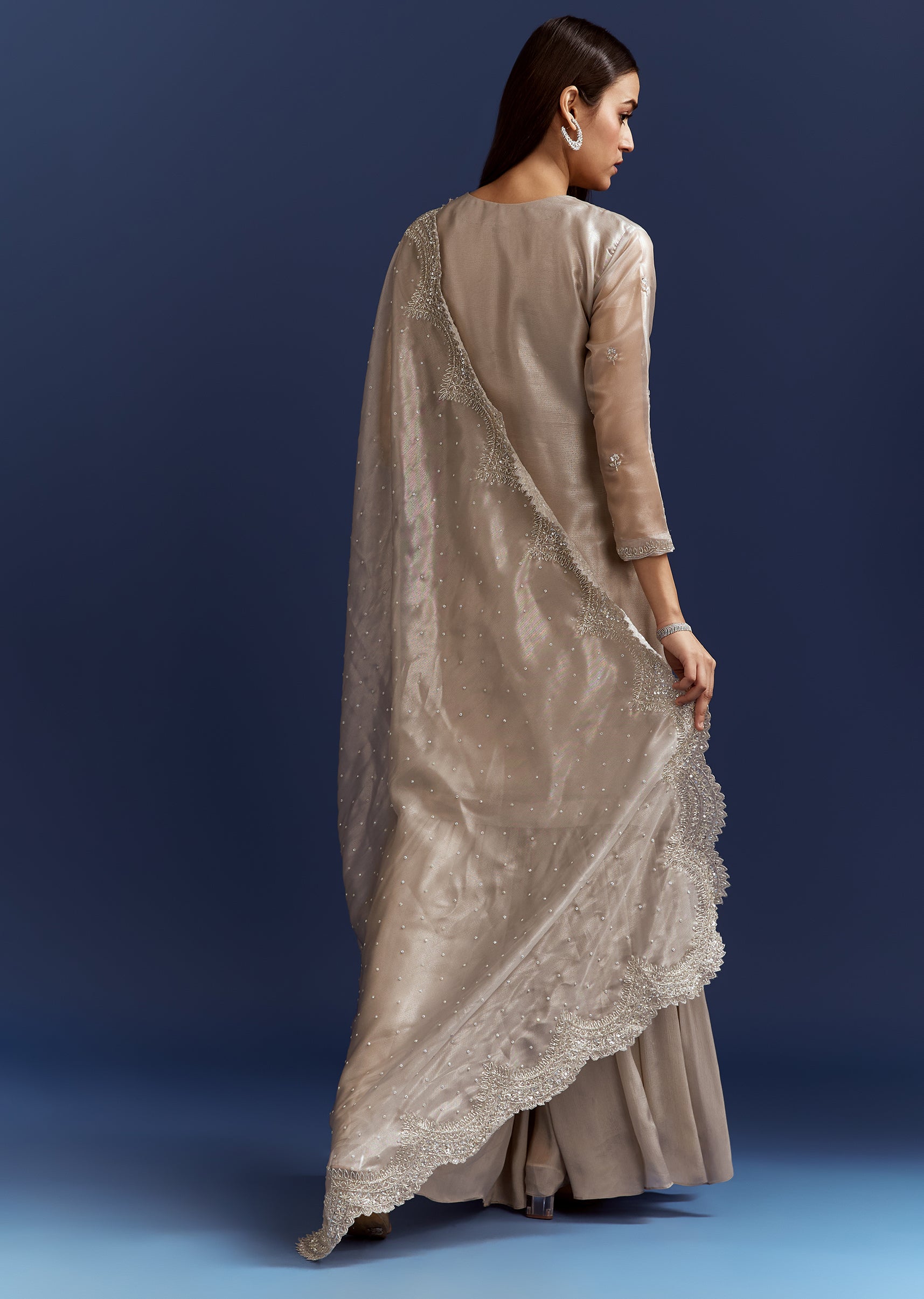 Grey Cutdana And Sequins Kurta With Stone Work Dupatta In Tissue