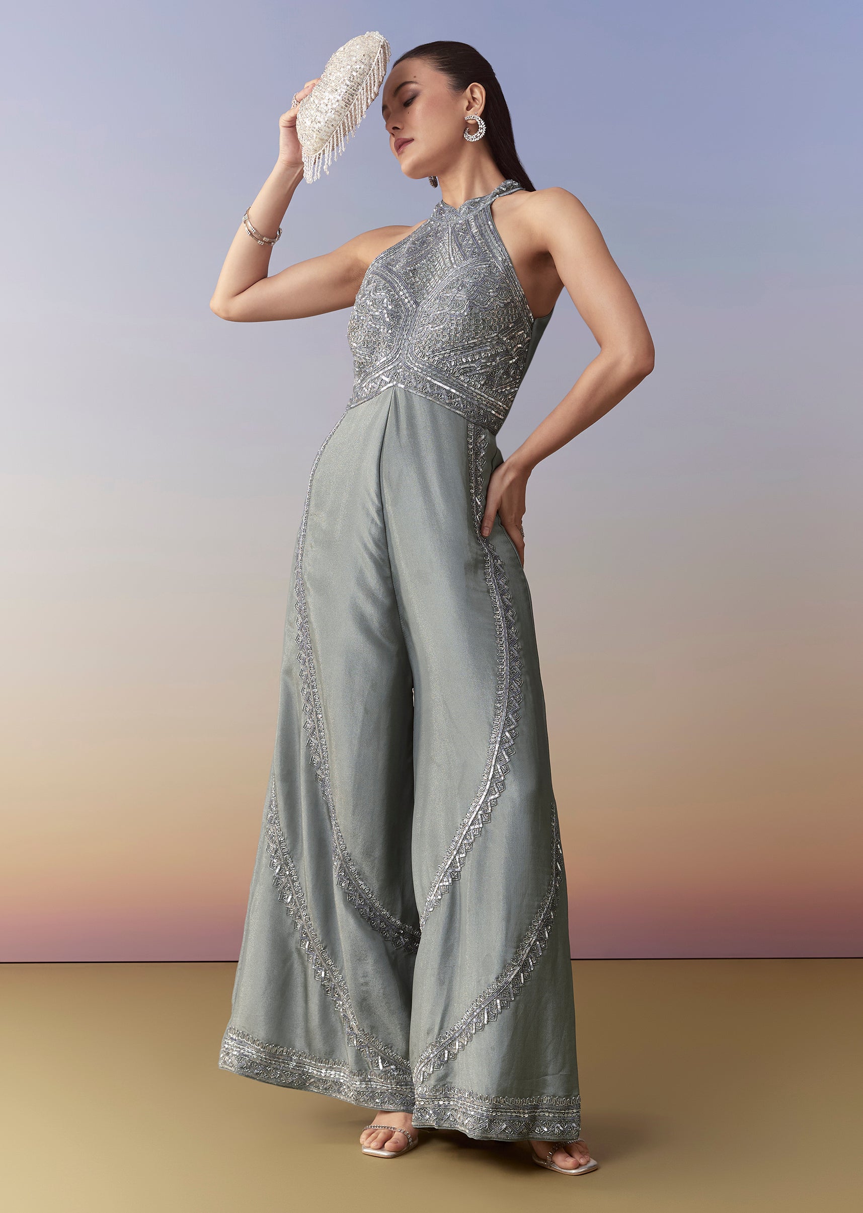 Elevate your contemporary festive look with this grey jumpsuit, embellished with sequins and cutdana work that adds a subtle yet sophisticated sparkle. The sleek silhouette and soft drape of the... More Product Details