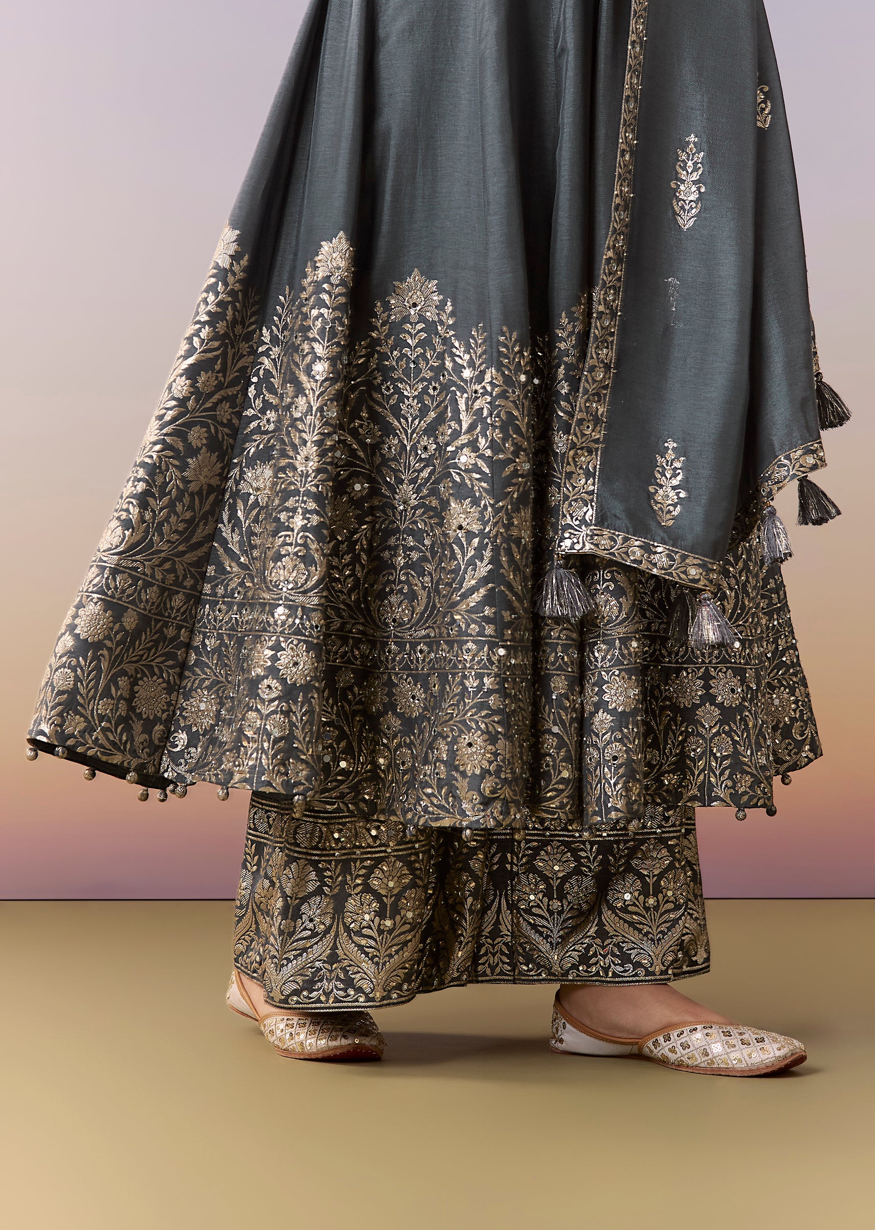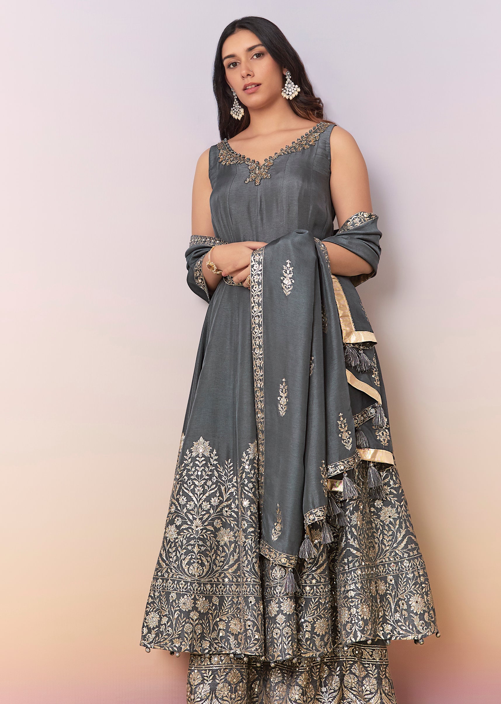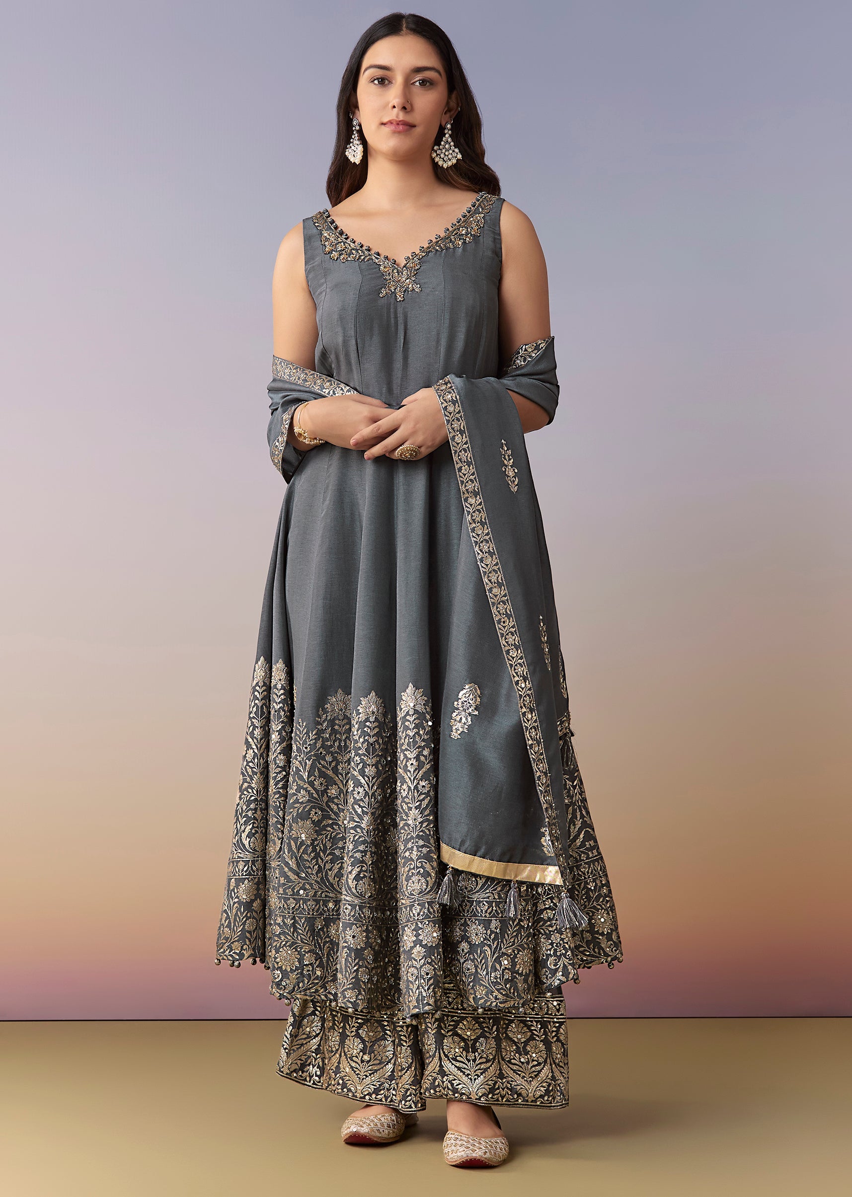 This grey A-line anarkali suit set is crafted in georgette with a pure silk weave and detailed with stone and cut dana work. Designed with a V-neckline and back zip... More Product Details
