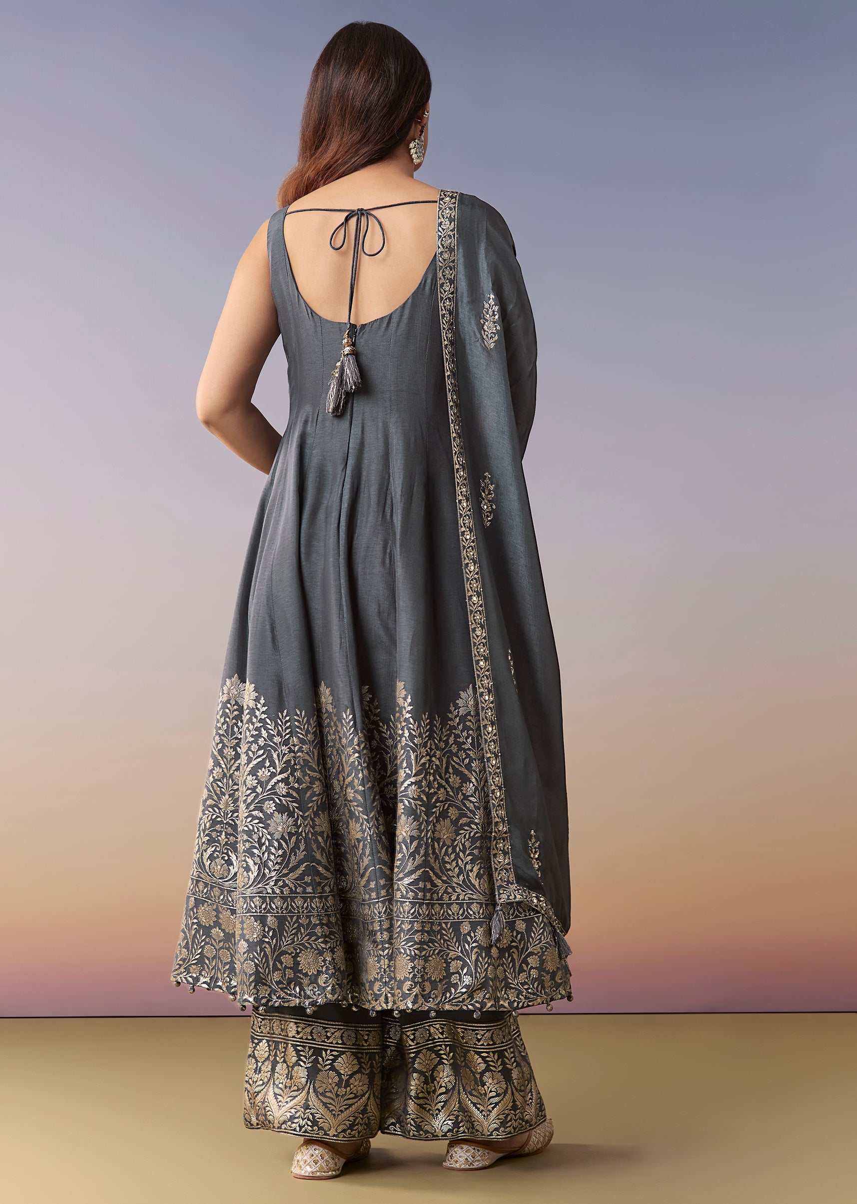 The anarkali skims the waist and flares out—ensure a comfortable bust fit for best fall.
