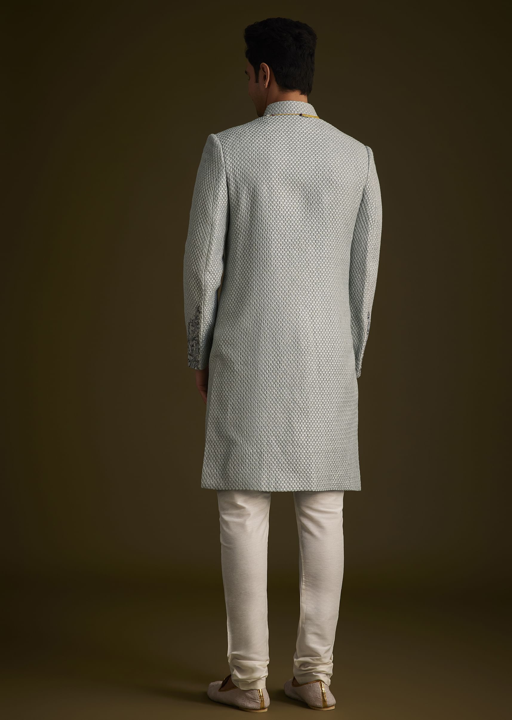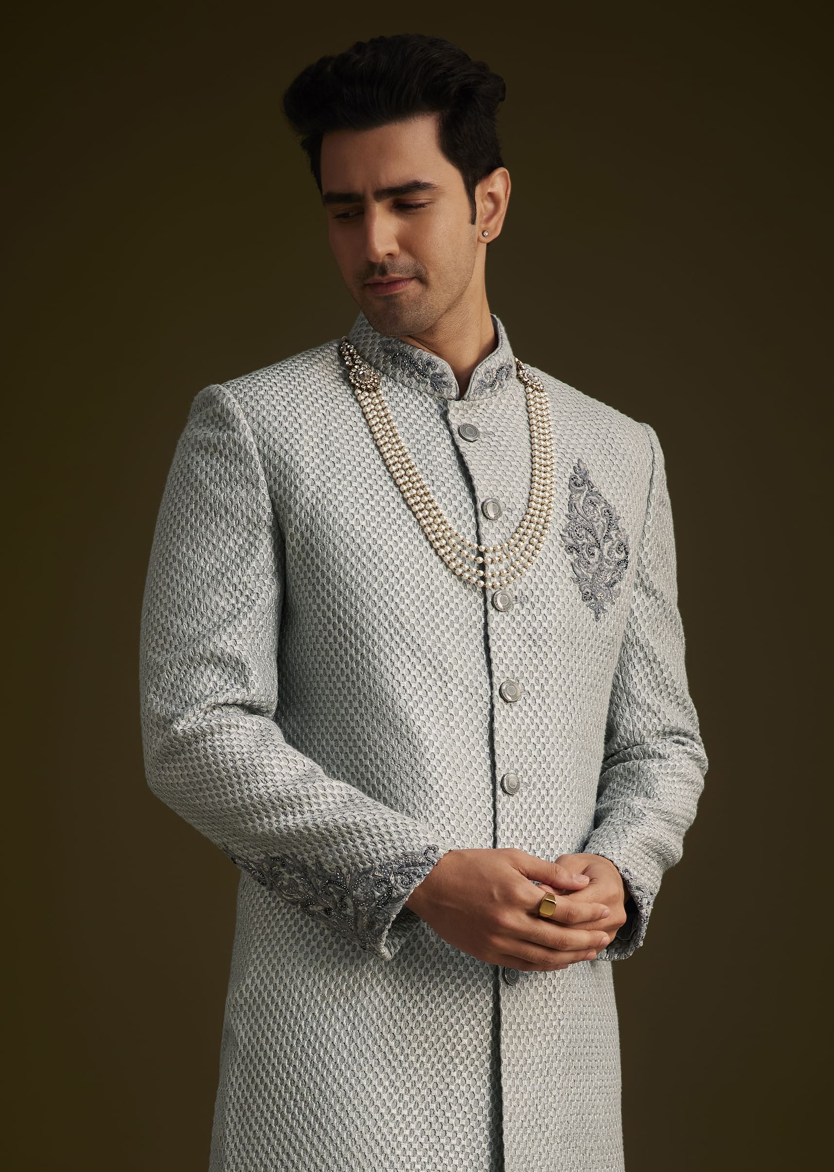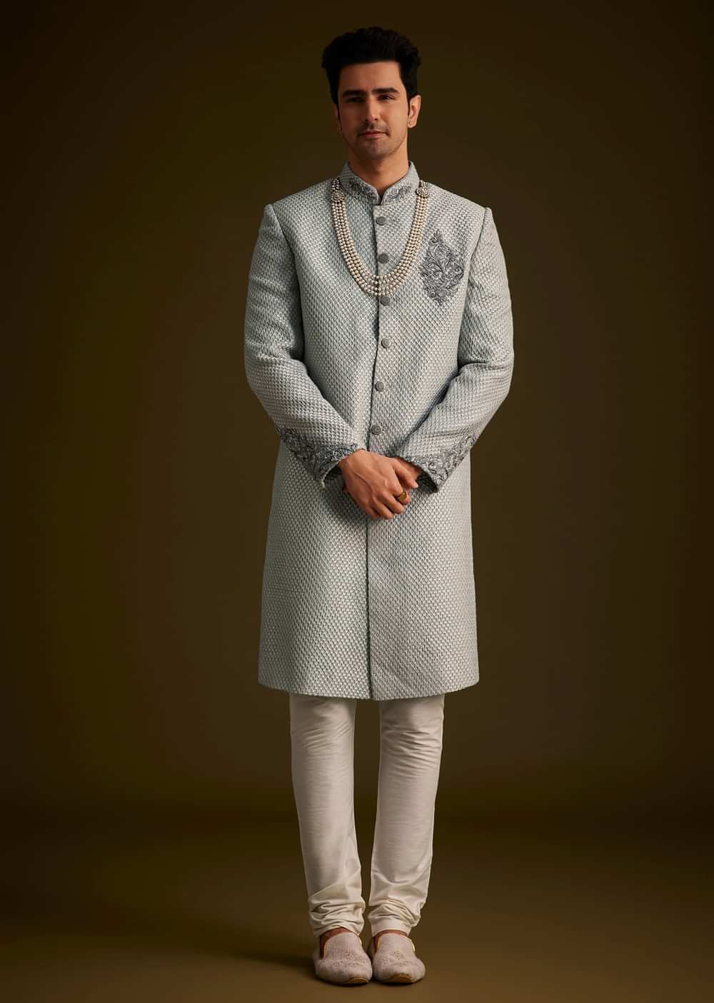 Pair this sherwani with silver-toned embroidered juttis and a sleek pocket square for added finesse. Opt for a classic hairstyle and minimal accessories to let the detailed embroidery shine.