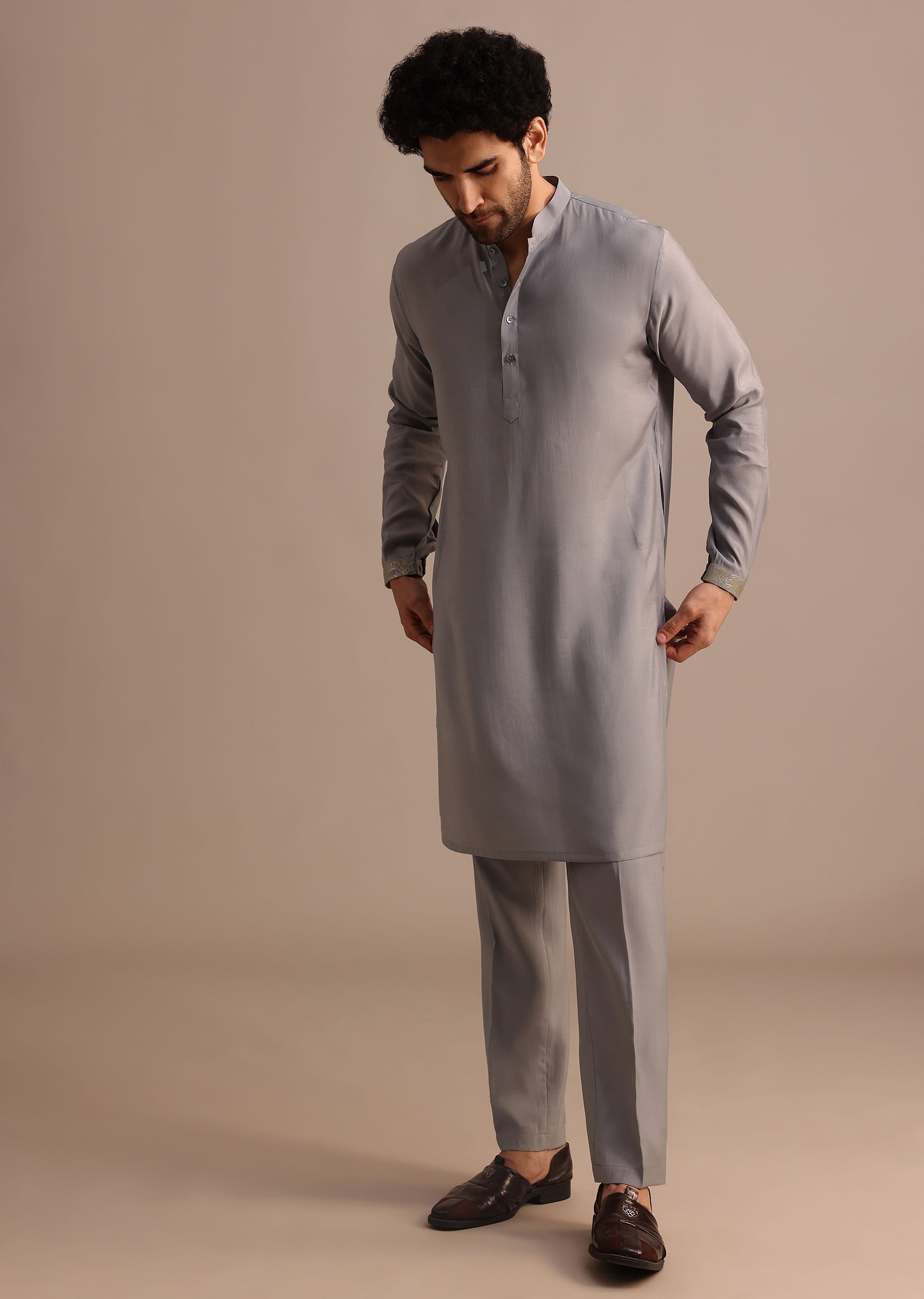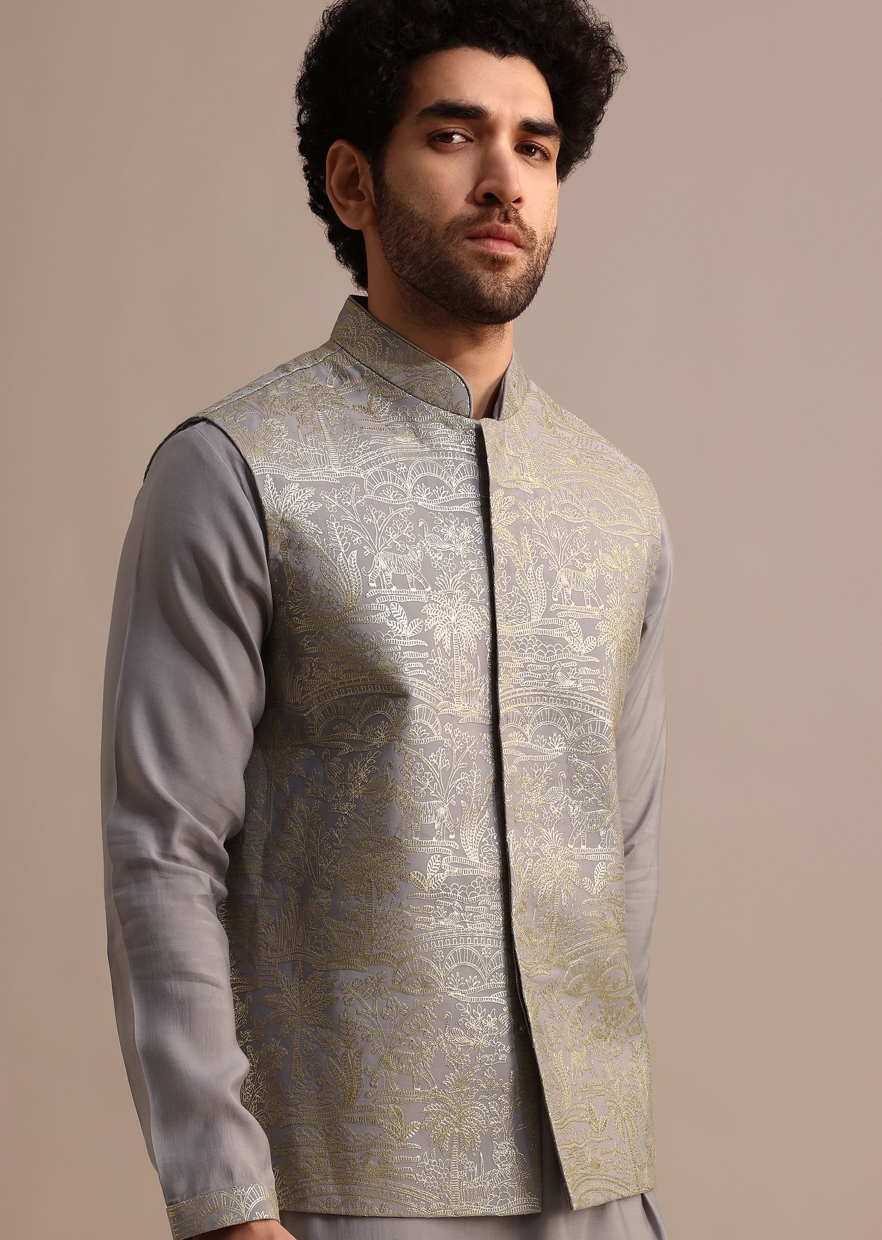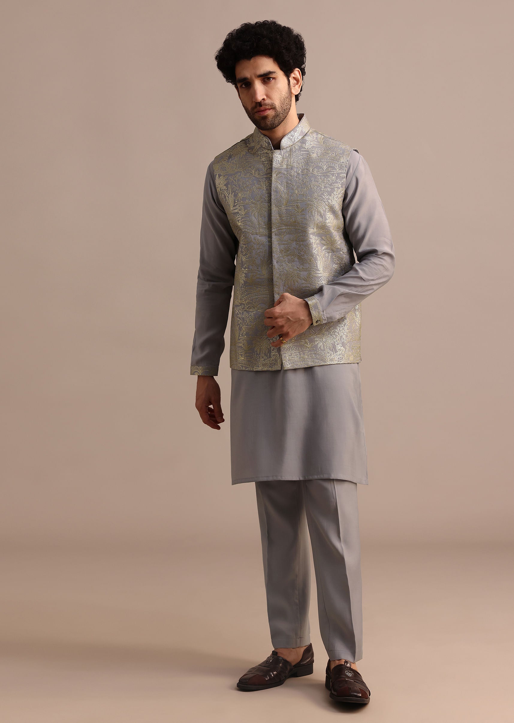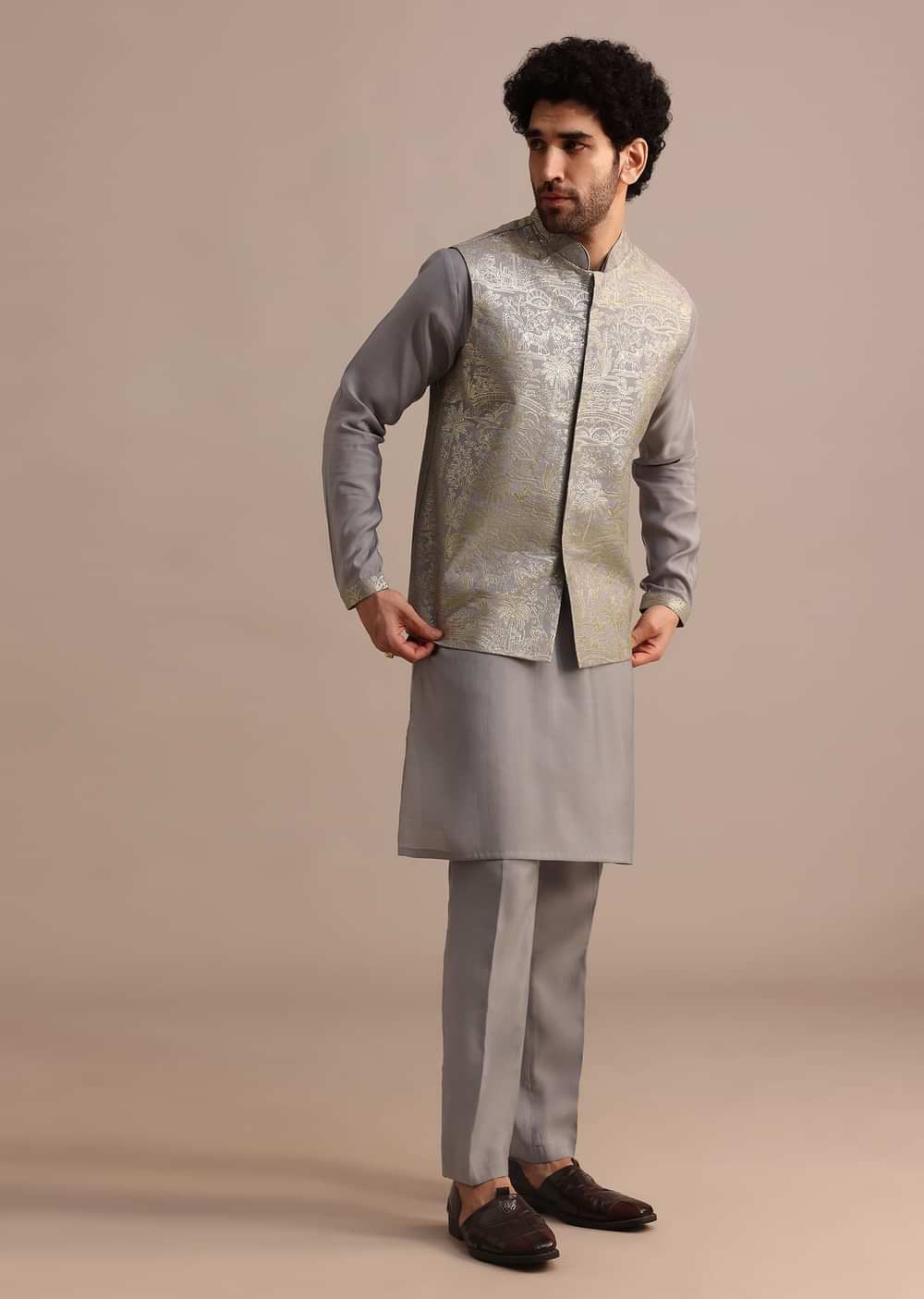 - Transform your wardrobe with this Elegant Grey Silk Kurta and Embroidered Jacket Set.