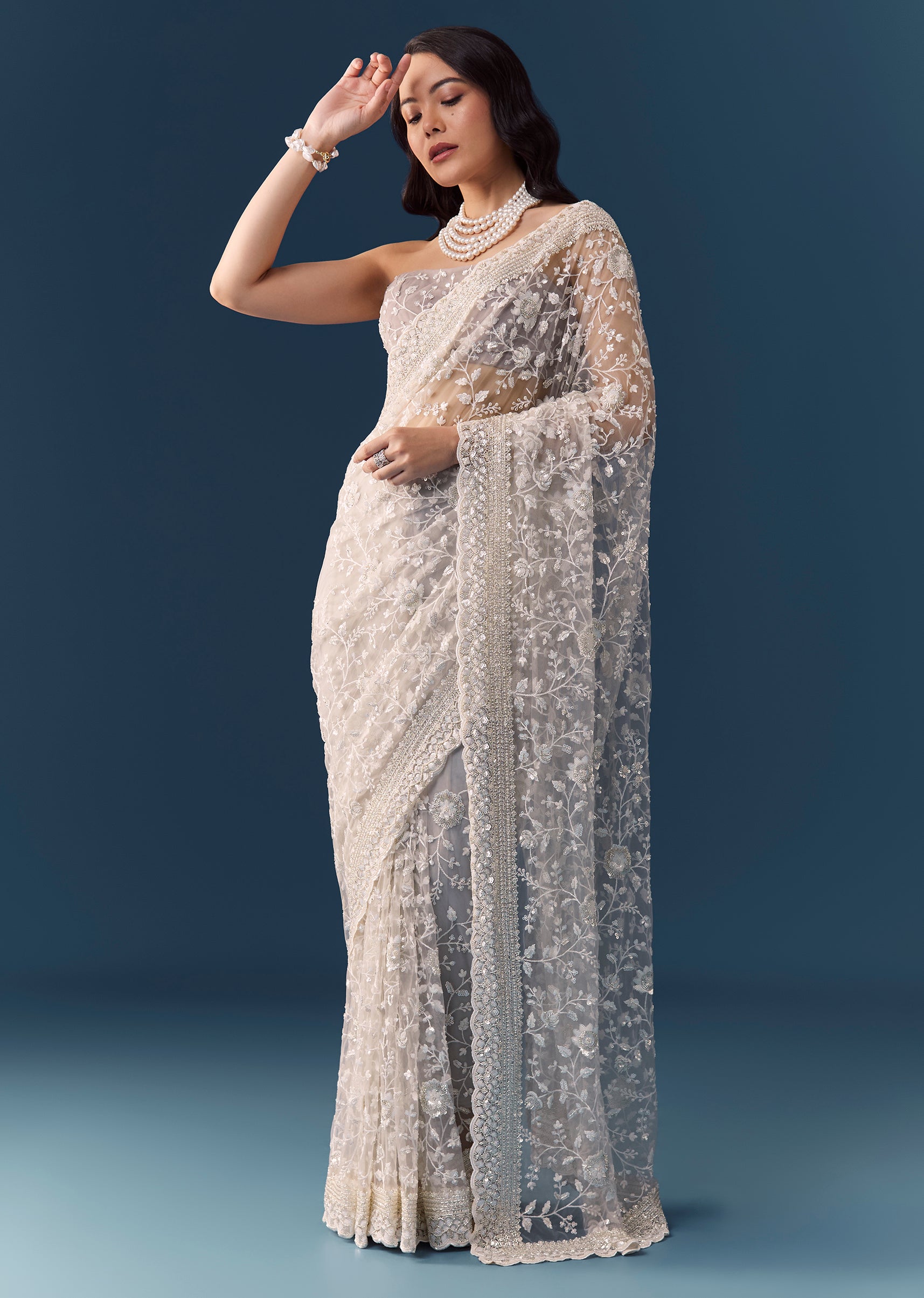 Embrace subtle glamour with this grey heavy embroidered net saree, featuring an intricate floral jaal design all over, delicately crafted with resham thread, cutdana, sequins, and beads. The elegant scallop... More Product Details