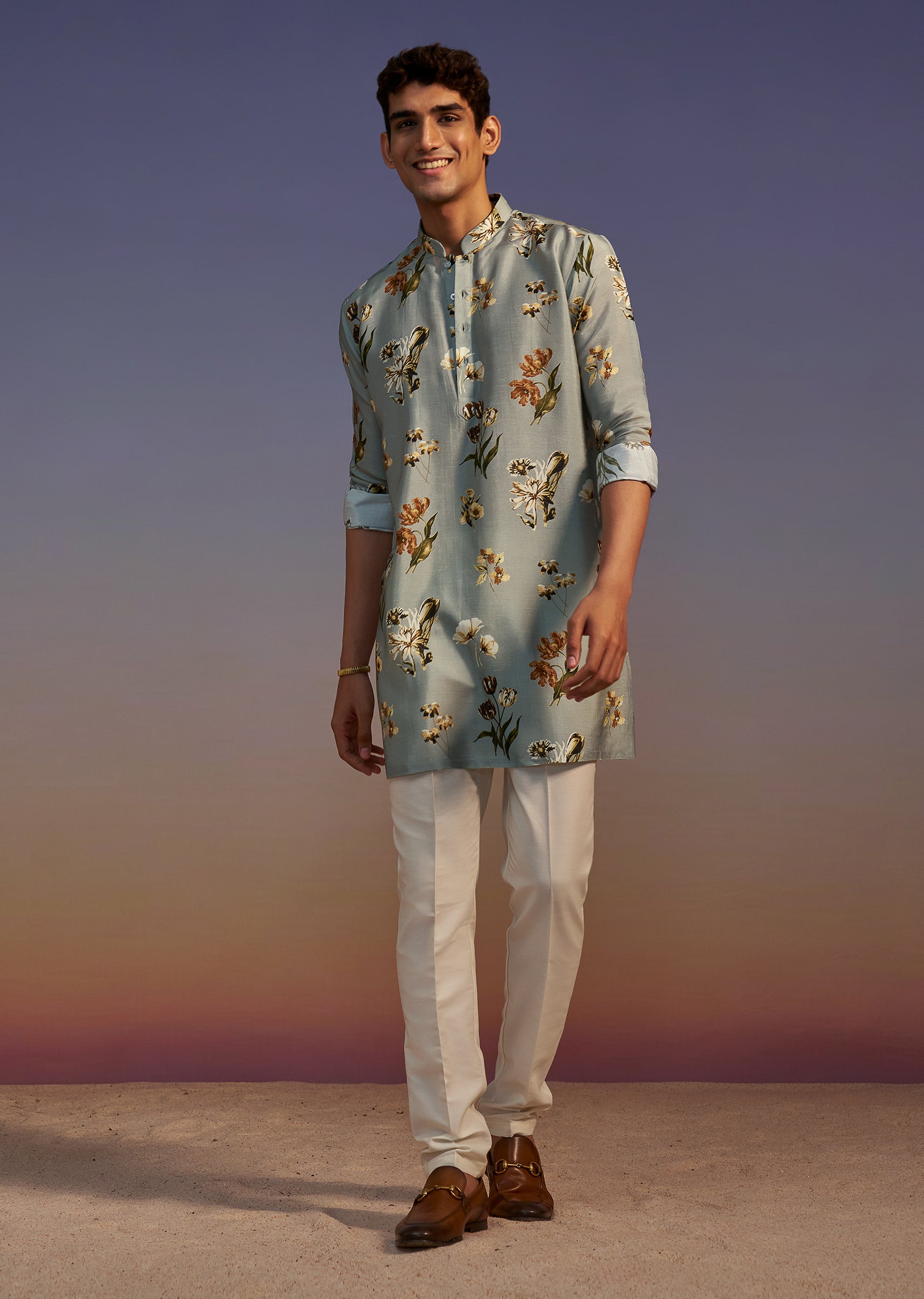 Grey Floral Printed Silk Short Kurta Set For Men