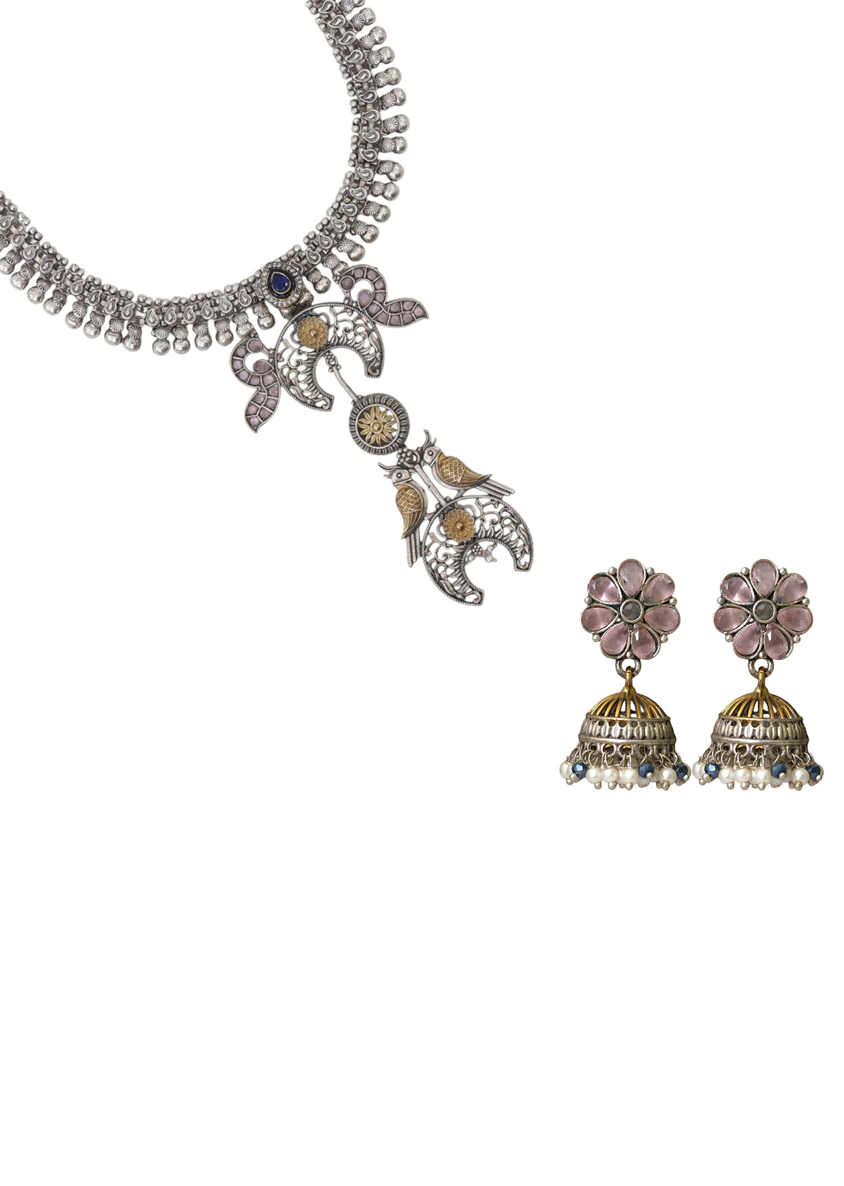 A grey fusion pendant drop statement necklace set featuring a bold pendant with shimmering stones and intricate detailing, exuding modern sophistication and timeless elegance. Perfect for adding a striking and contemporary touch to bridal, festive, or ethnic ensembles. Awarded as the Most Trusted Brand, we're delivering styles you love, just as promised.