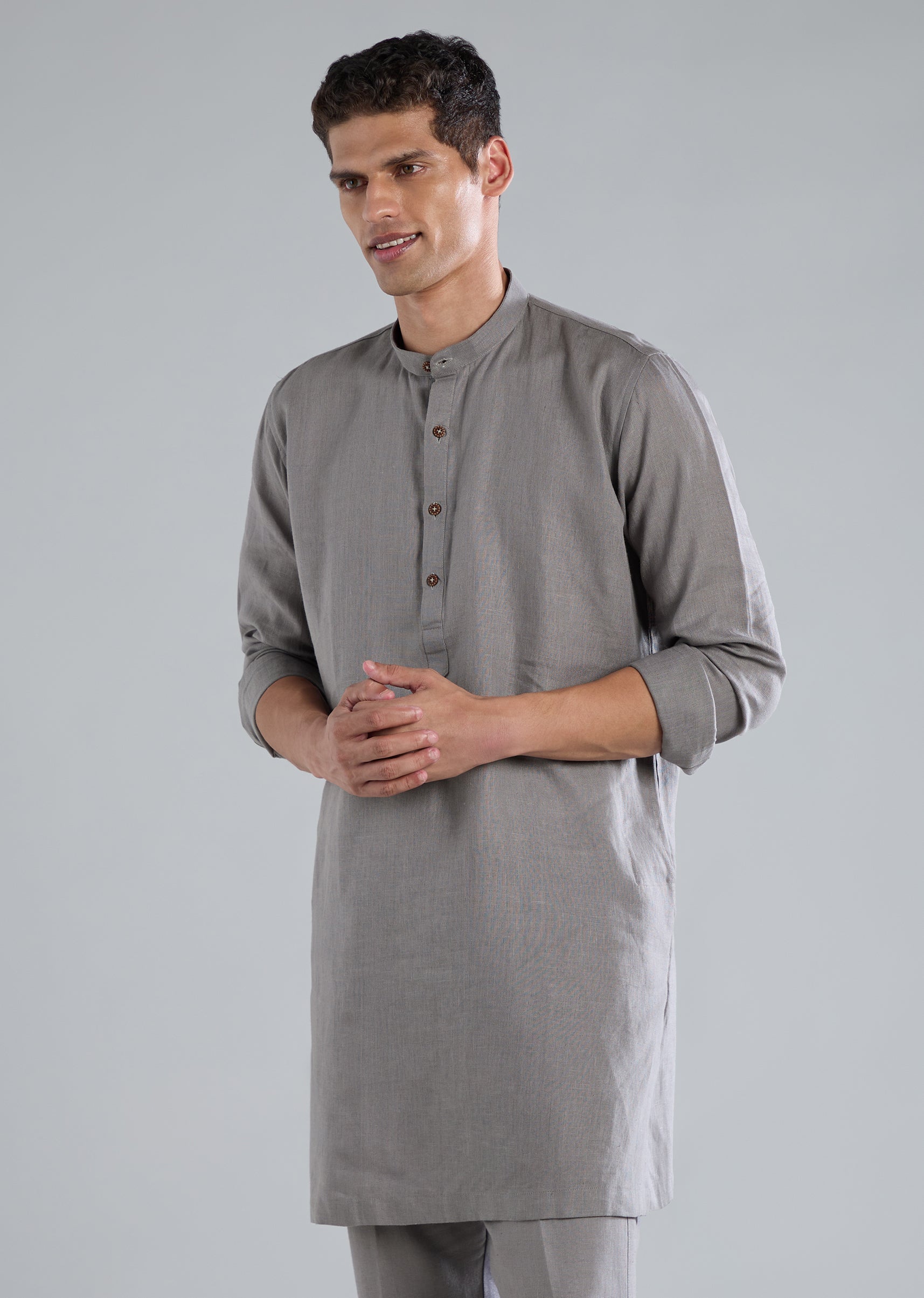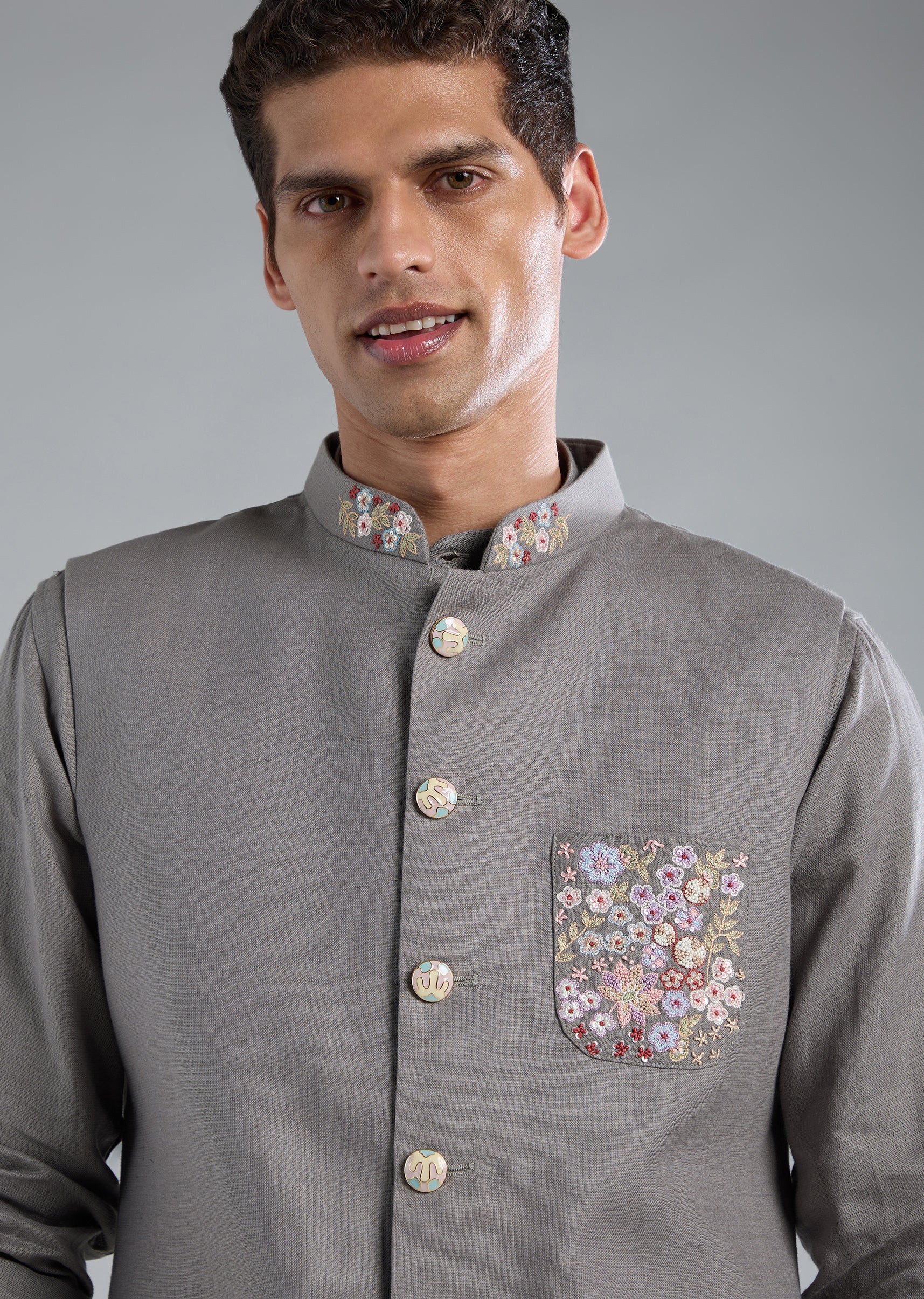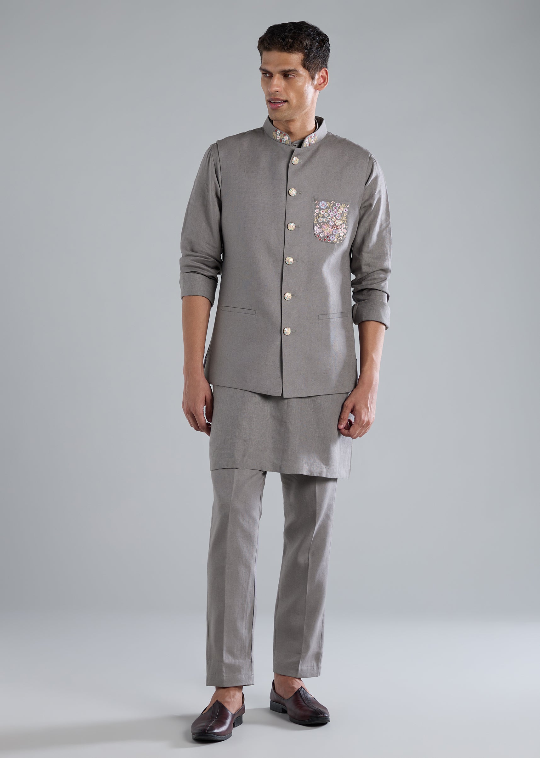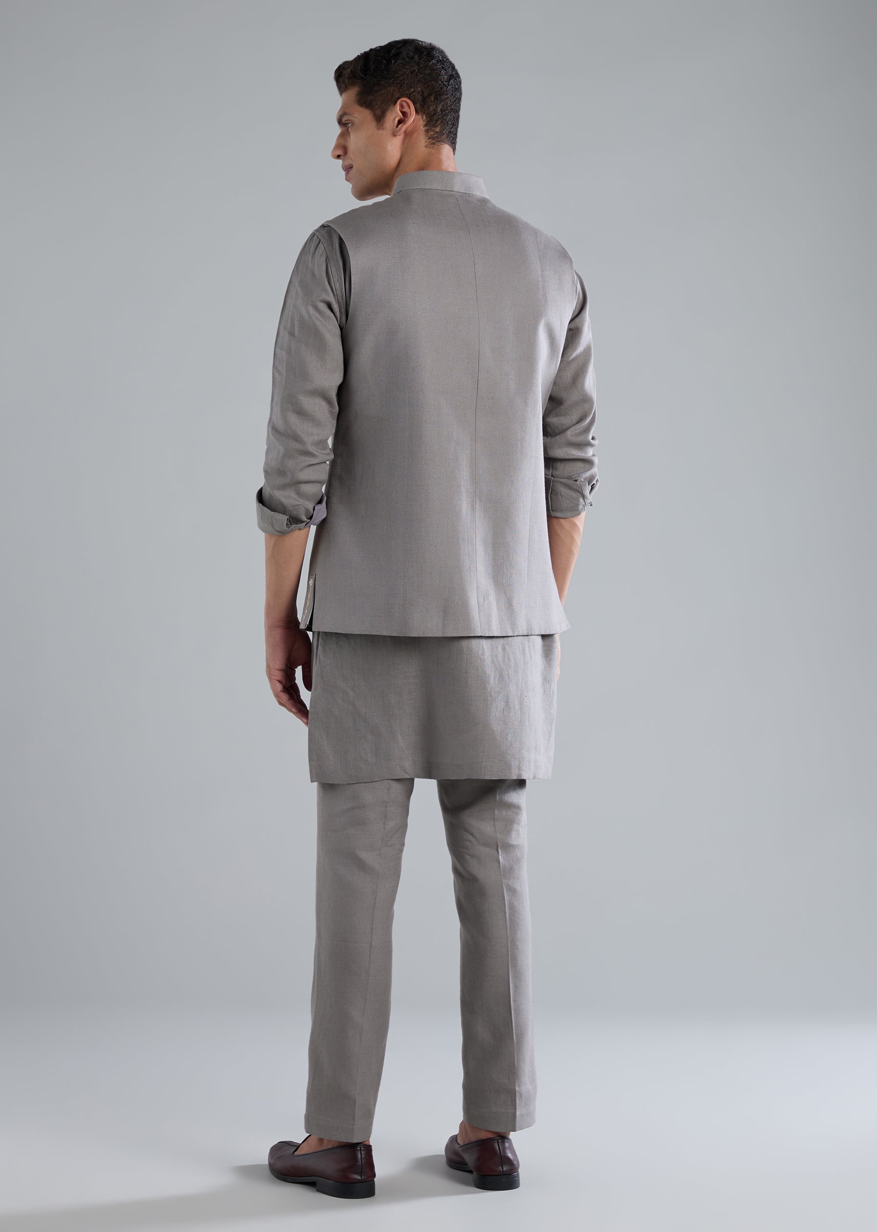 This grey kurta jacket set is crafted in soft pastel toned linen and highlighted with delicate thread resham work, making it an elegant choice for receptions and wedding celebrations. Designed with full sleeves and a mandarin collar, it features a front button top closure and a front hook eye bottom closure. The set includes a jacket, kurta, and pants, creating a refined and polished festive ensemble. Awarded as the Most Trusted Brand, we're delivering styles you love, just as promised.