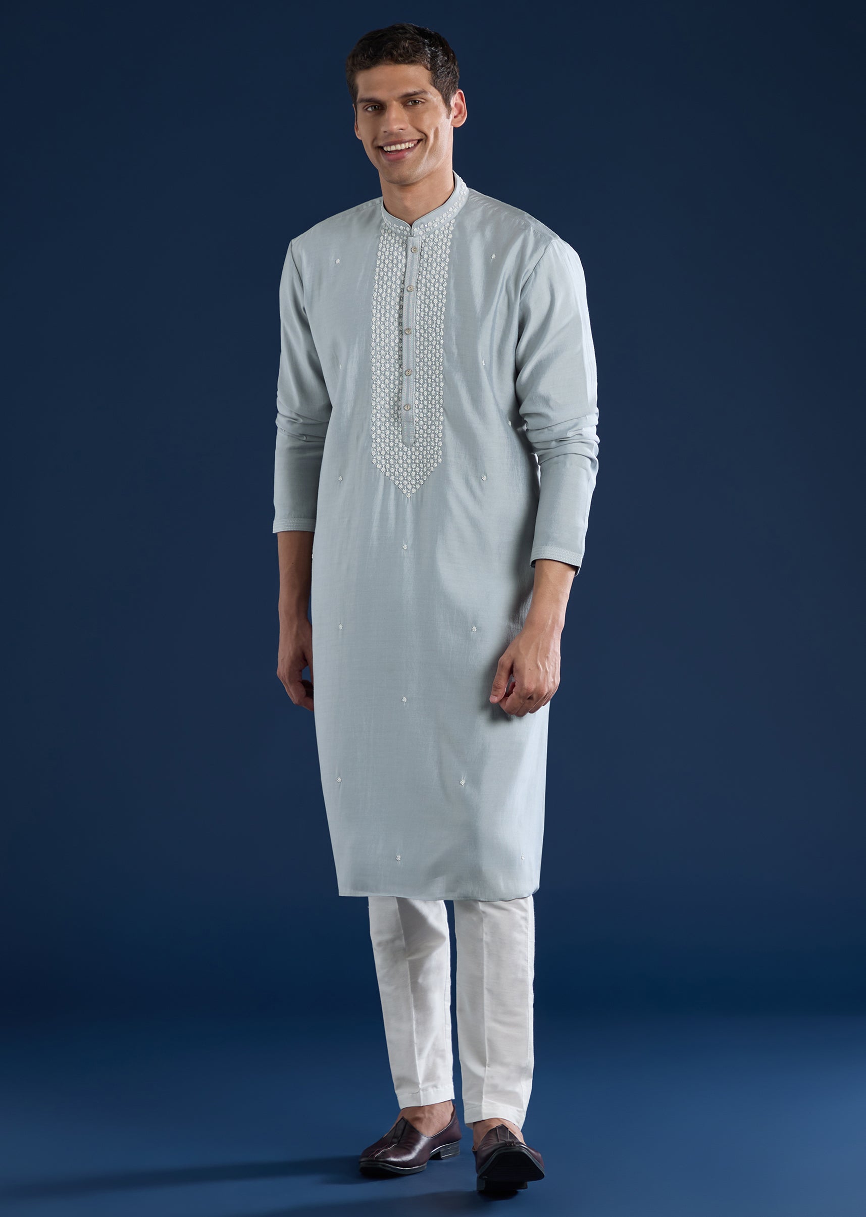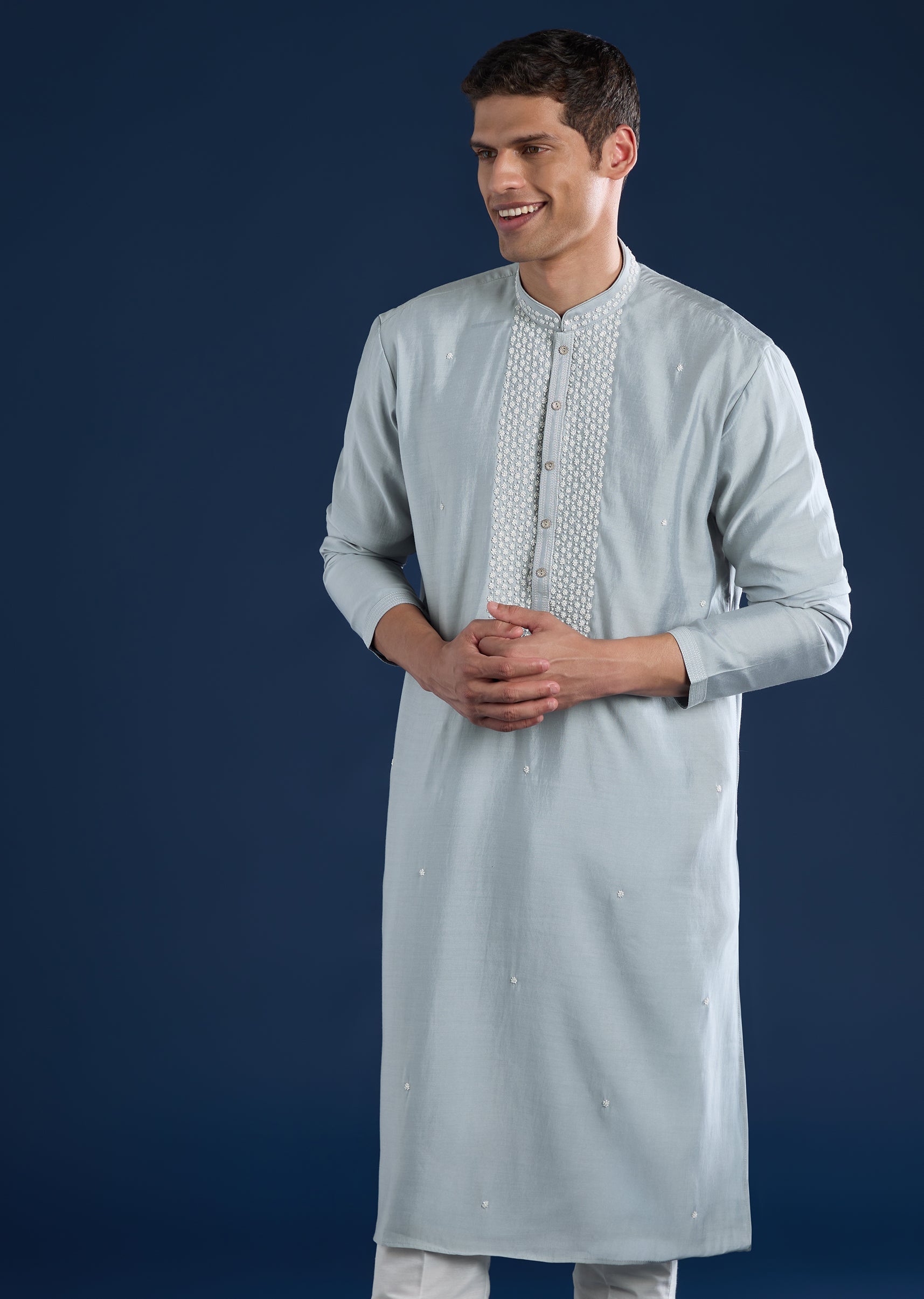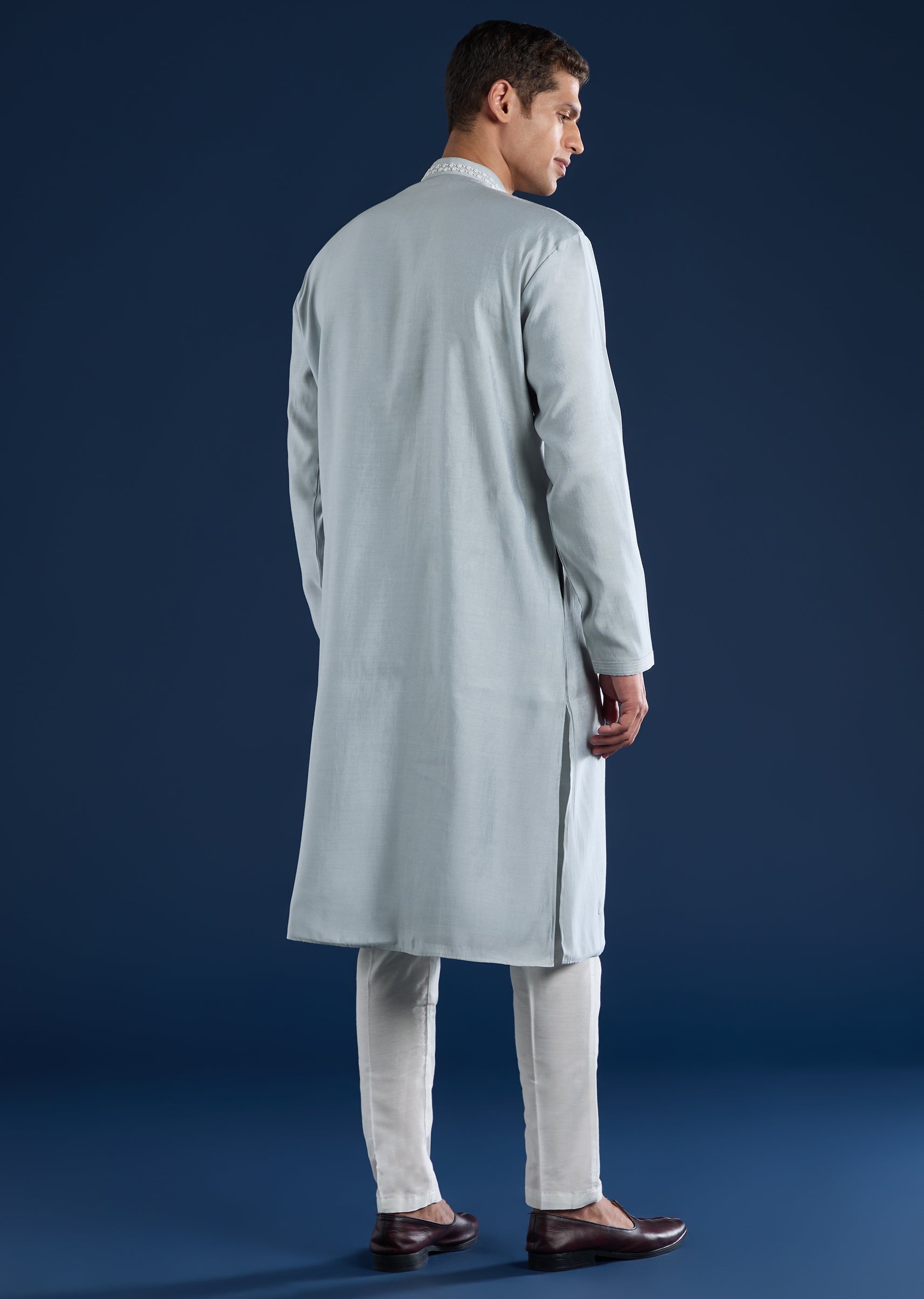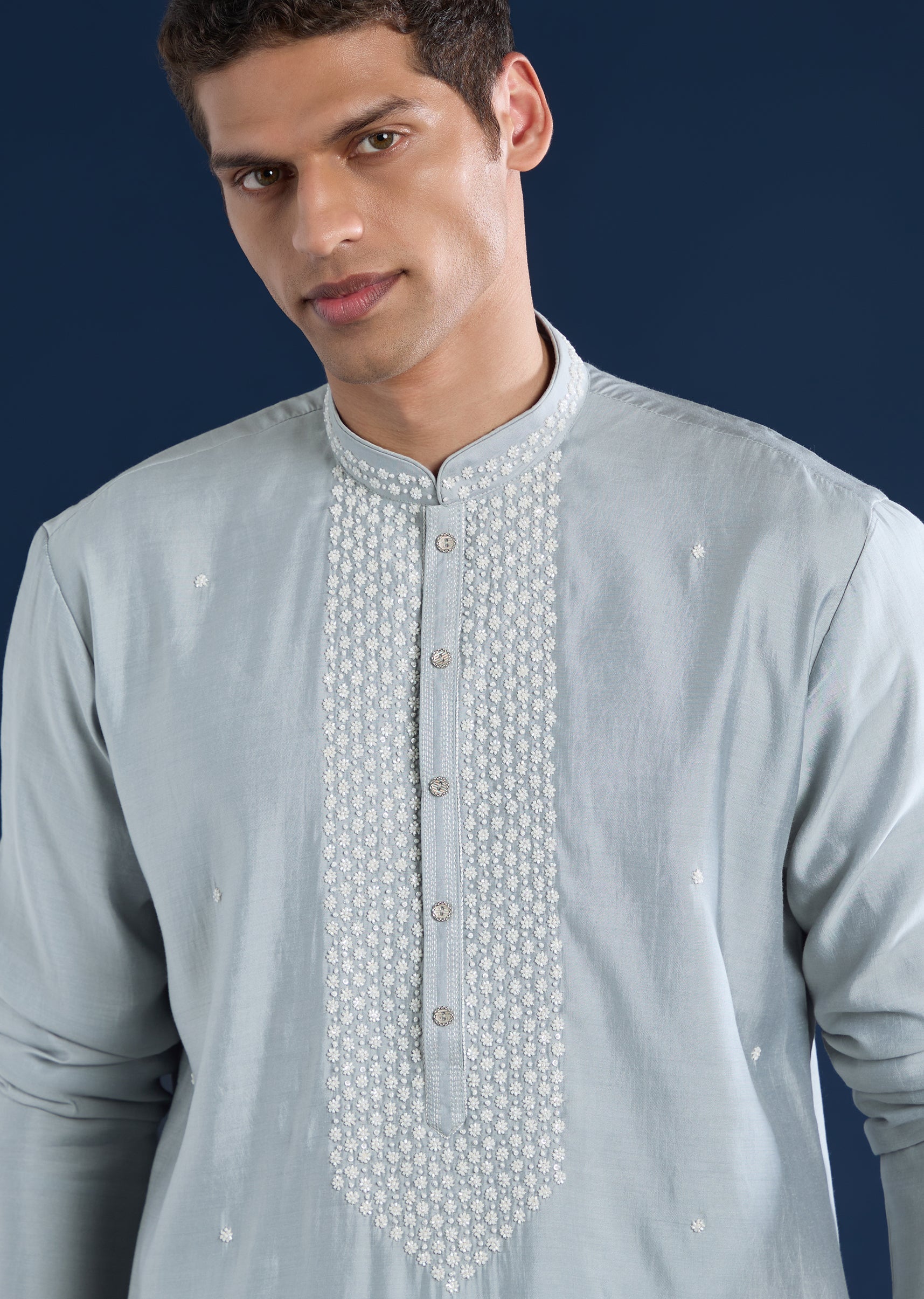 This grey kurta set is crafted in art silk with refined resham detailing for a minimal, elevated finish. Designed with a mandarin collar, full sleeves, and side slits, it pairs... More Product Details