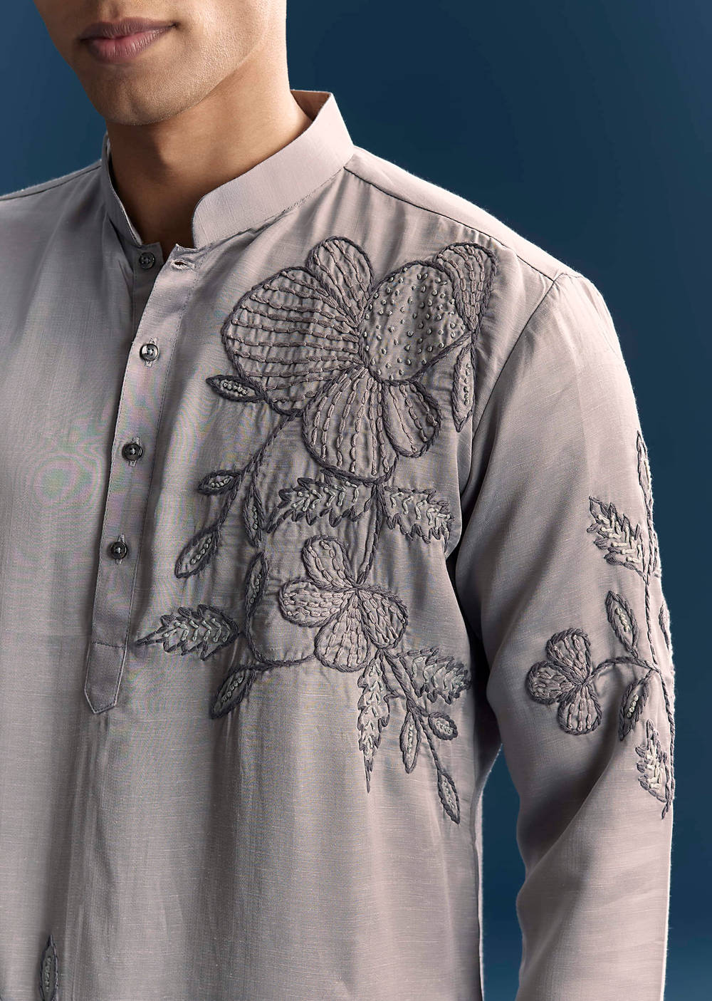 Grey Kurta Set For Men With Thread And French Knot Embroidery