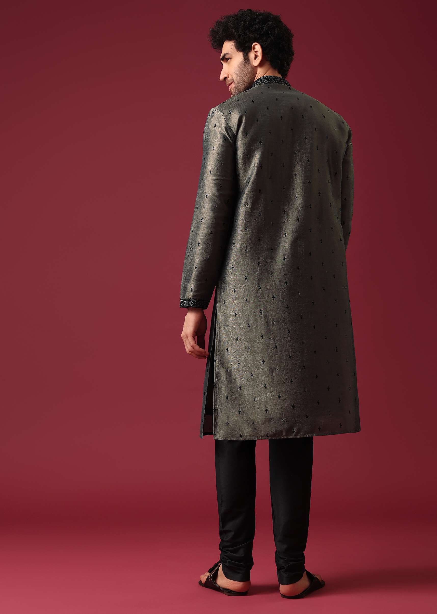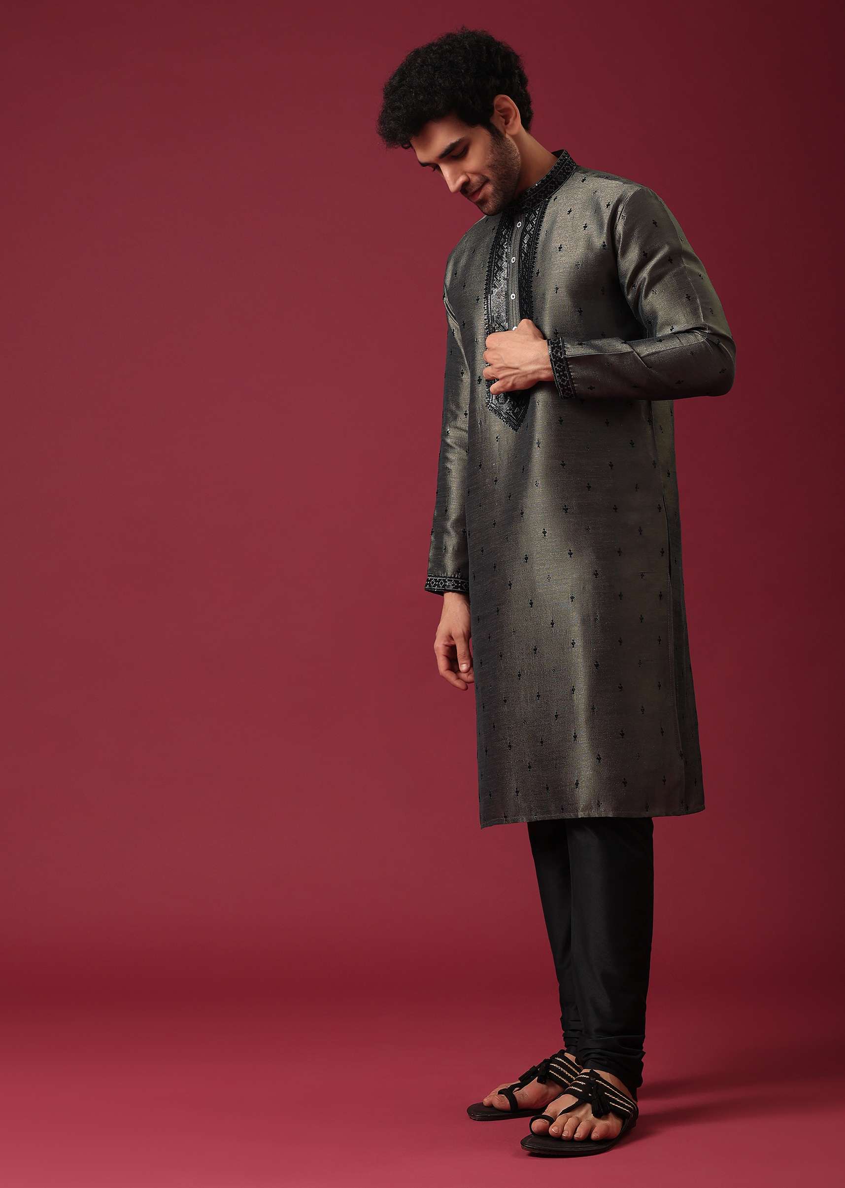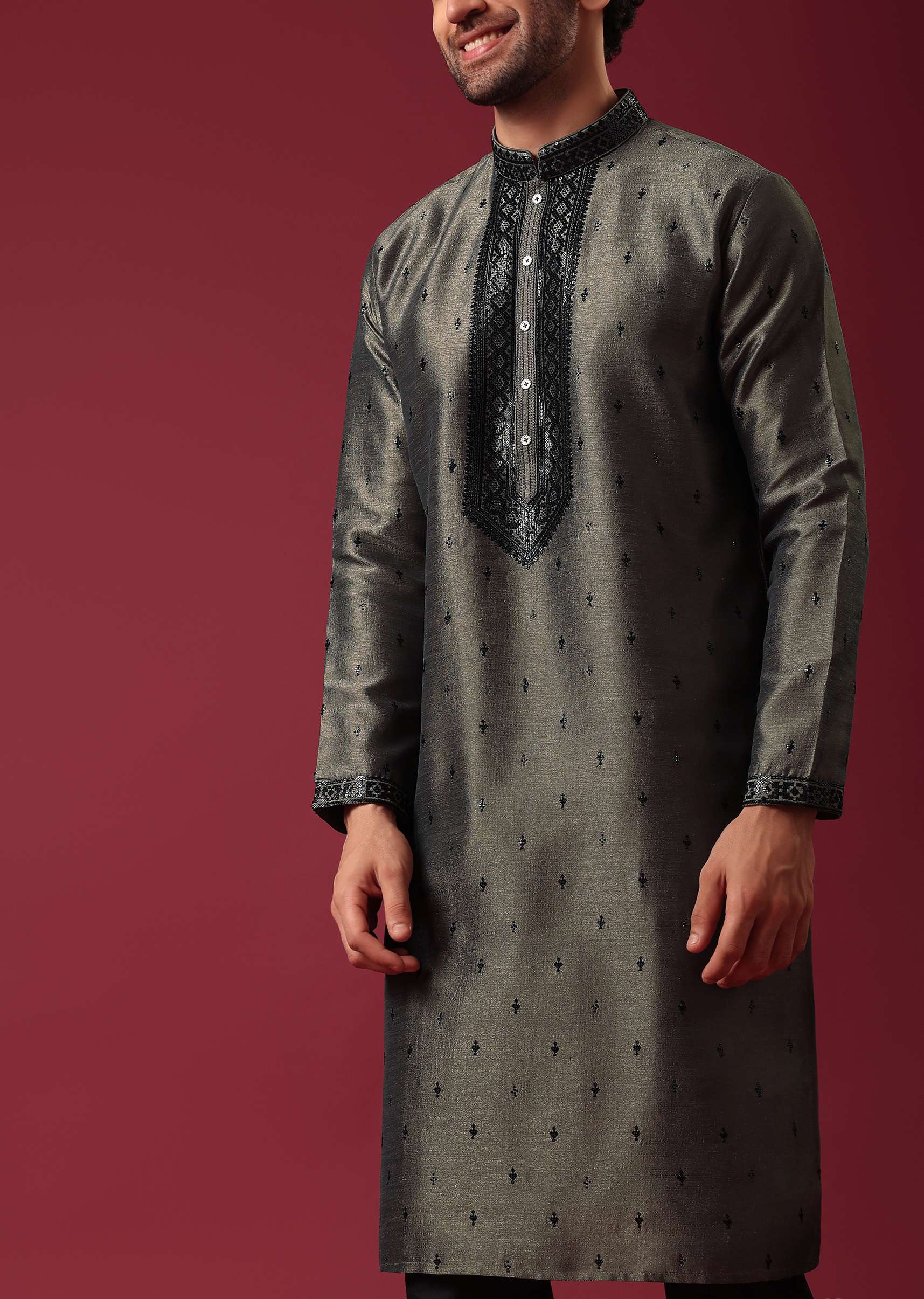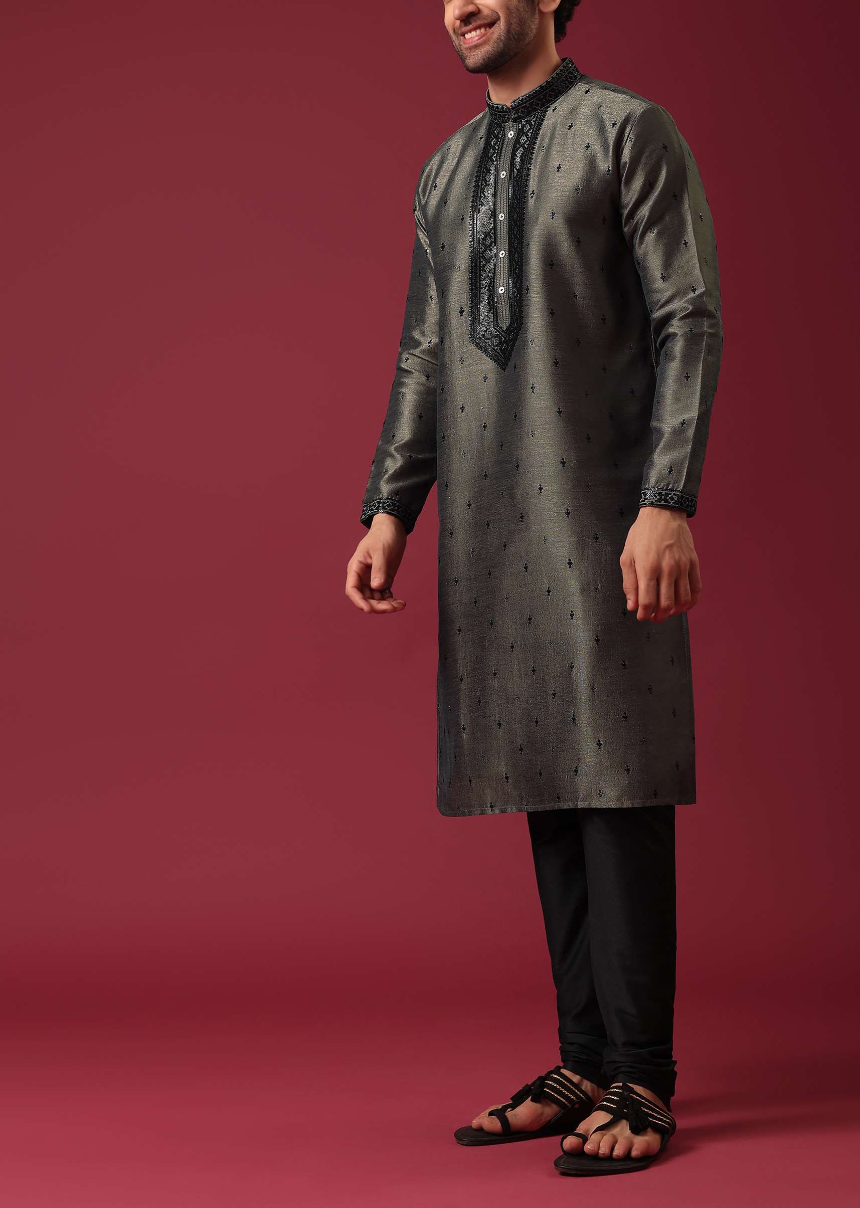- The kurta, with a Mandarin collar and resham-worked buttis is an absolute delight to don, owing to its comfortable fabric.