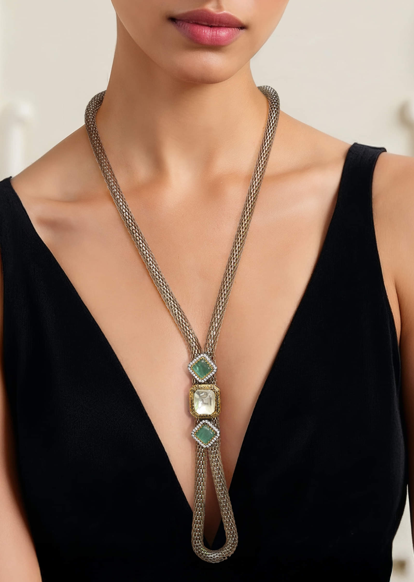 A grey modern polki pendant necklace featuring shimmering polki stones set in a sleek, contemporary design, exuding understated elegance. Perfect for adding a refined and modern touch to bridal, festive,... More Product Details