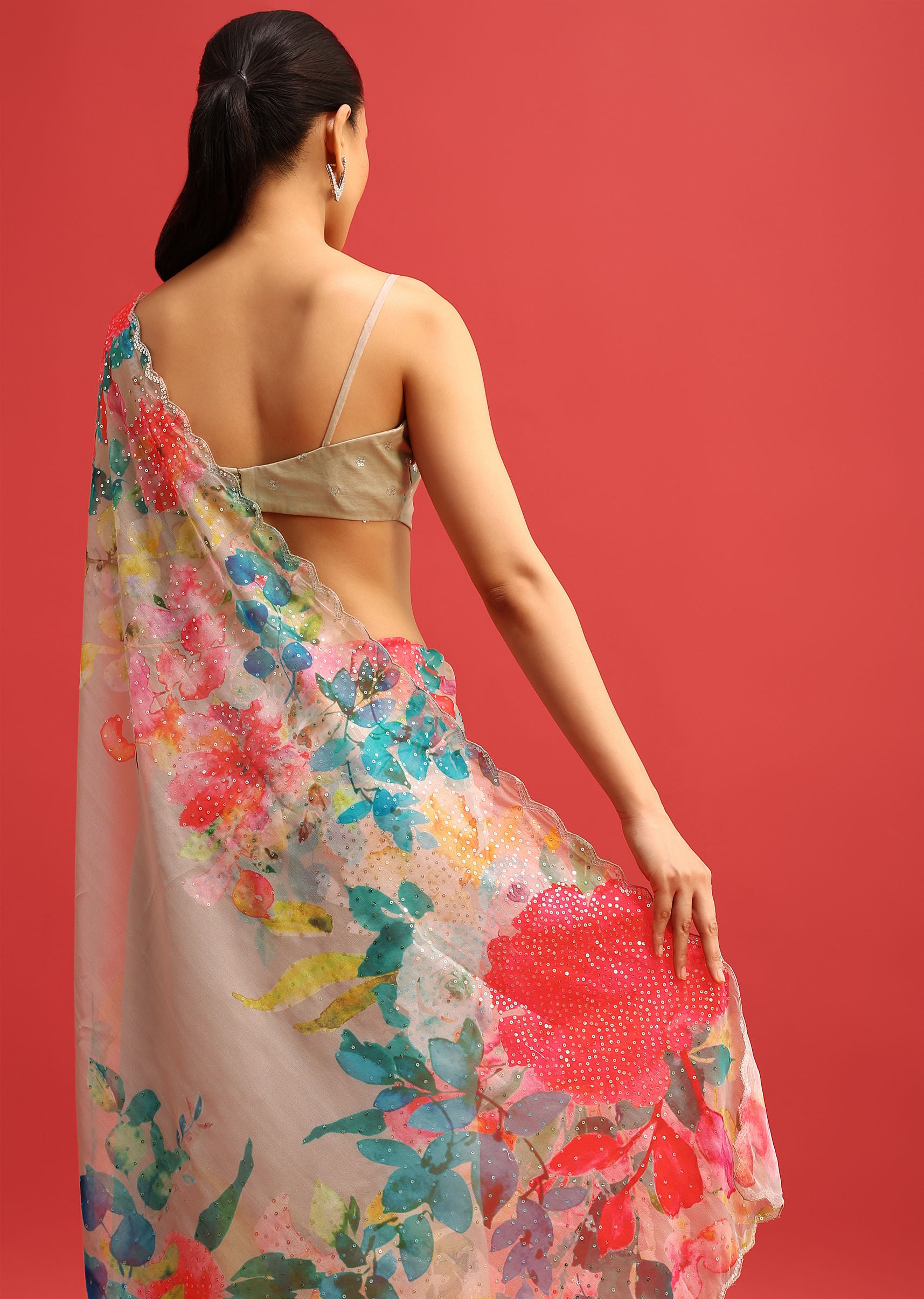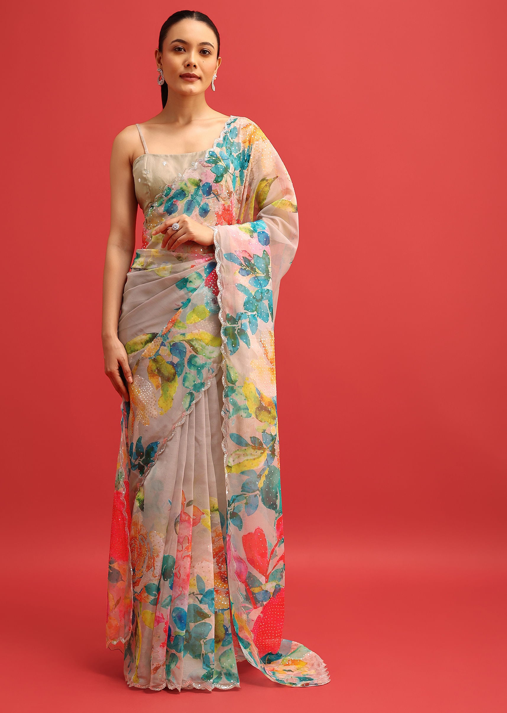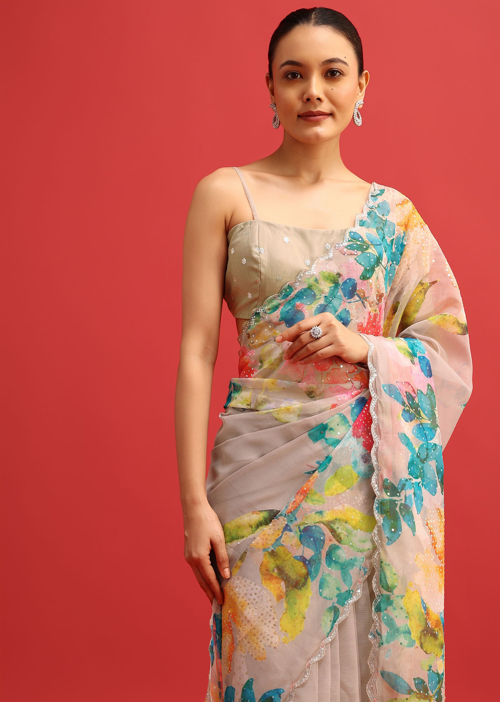 Grey Organza Floral Printed Saree In Sequin With Unstitched Blouse