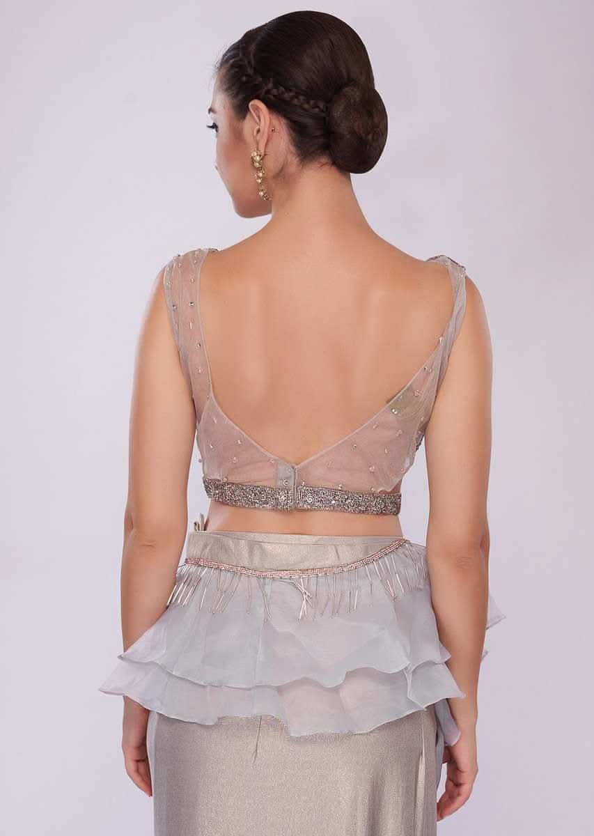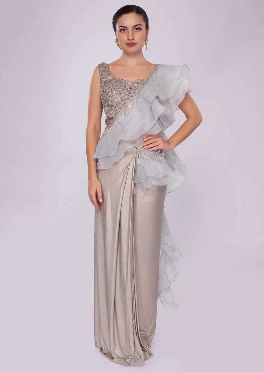 Grey Saree In Lycra With Draped Pleats And Ruffled Organza Pallo Online - Kalki Fashion