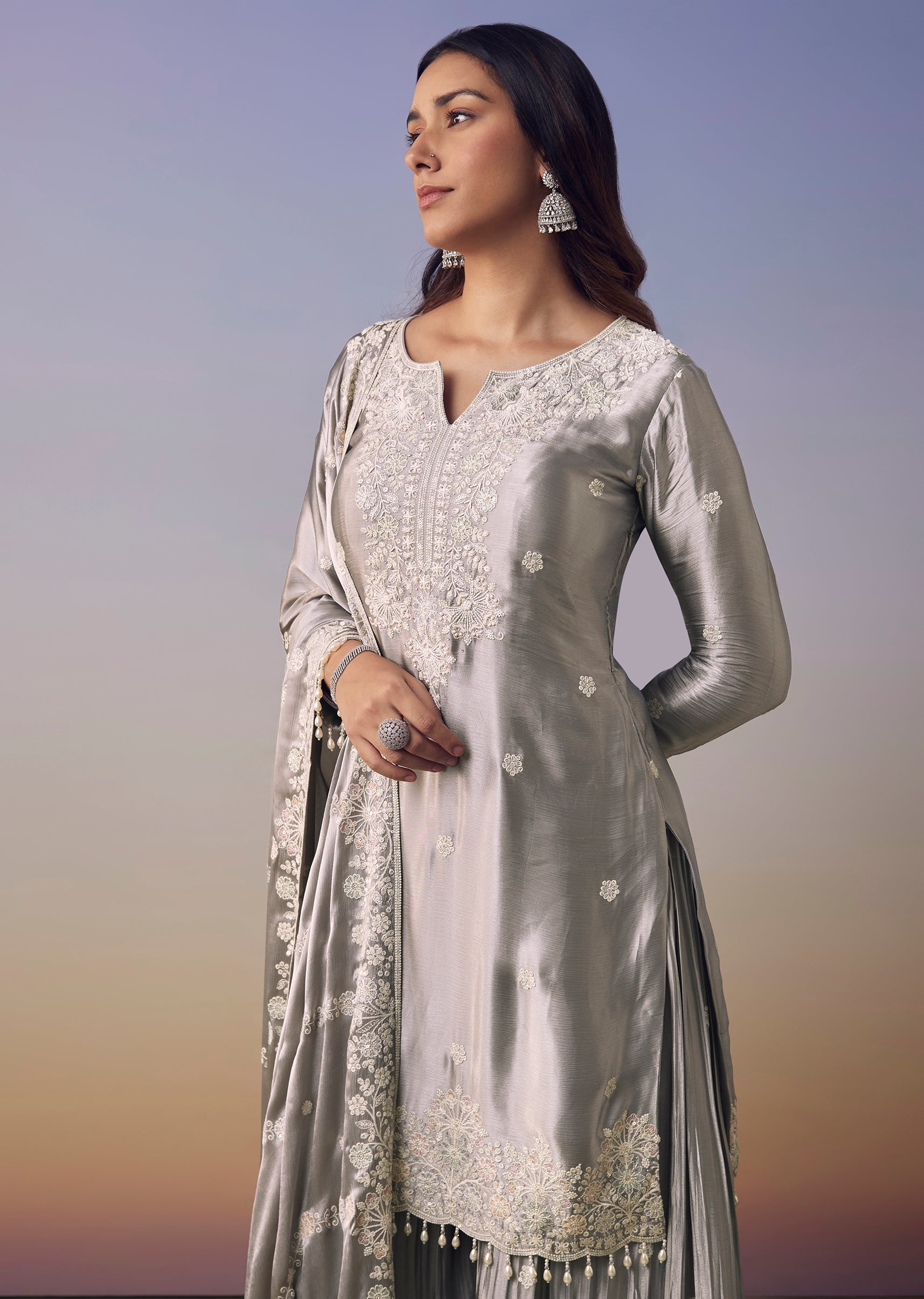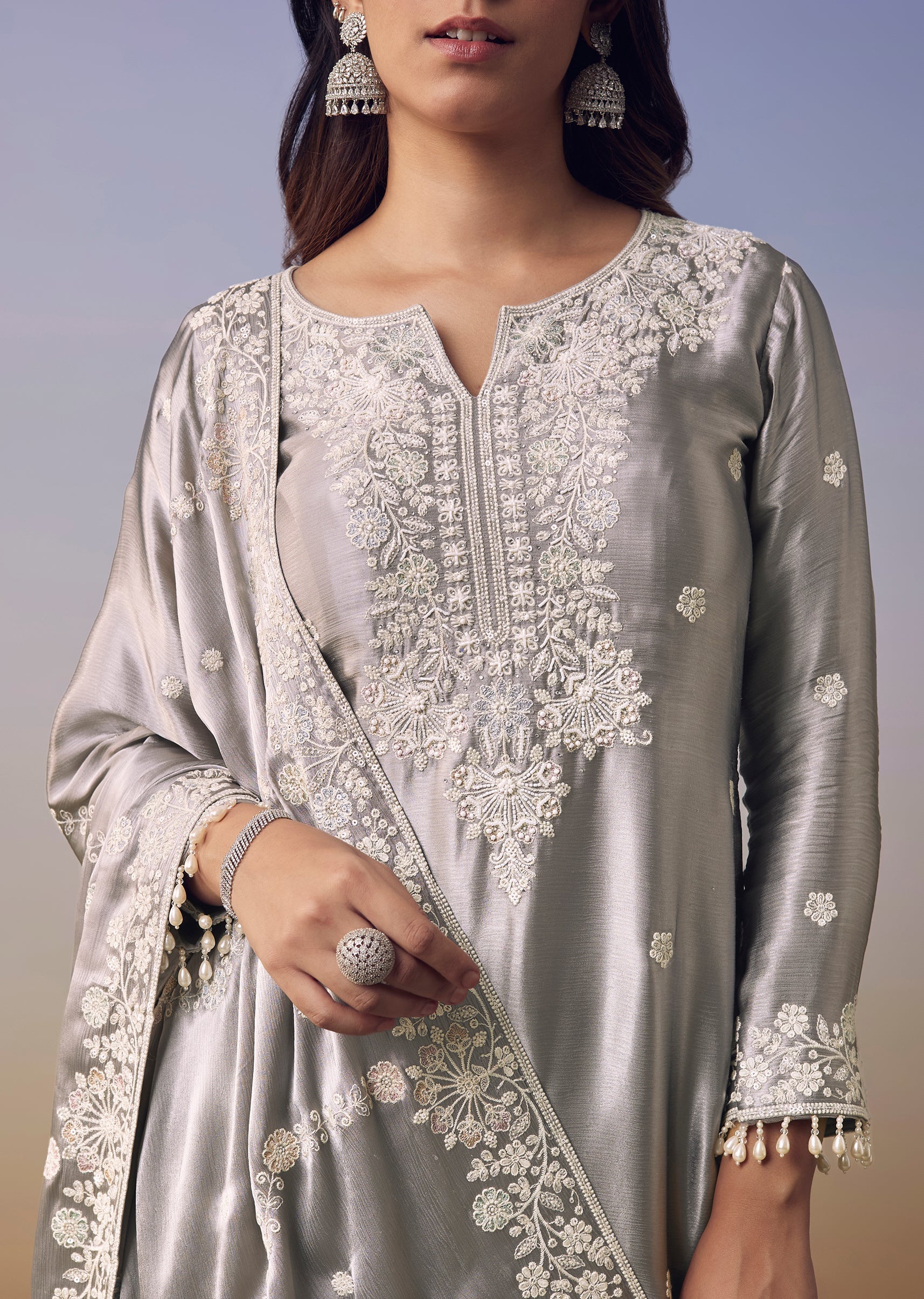 Step into understated elegance with this grey satin kurta set featuring refined thread embroidery and moti detailing that add a subtle festive sheen. The notched neckline and three fourth sleeves... More Product Details