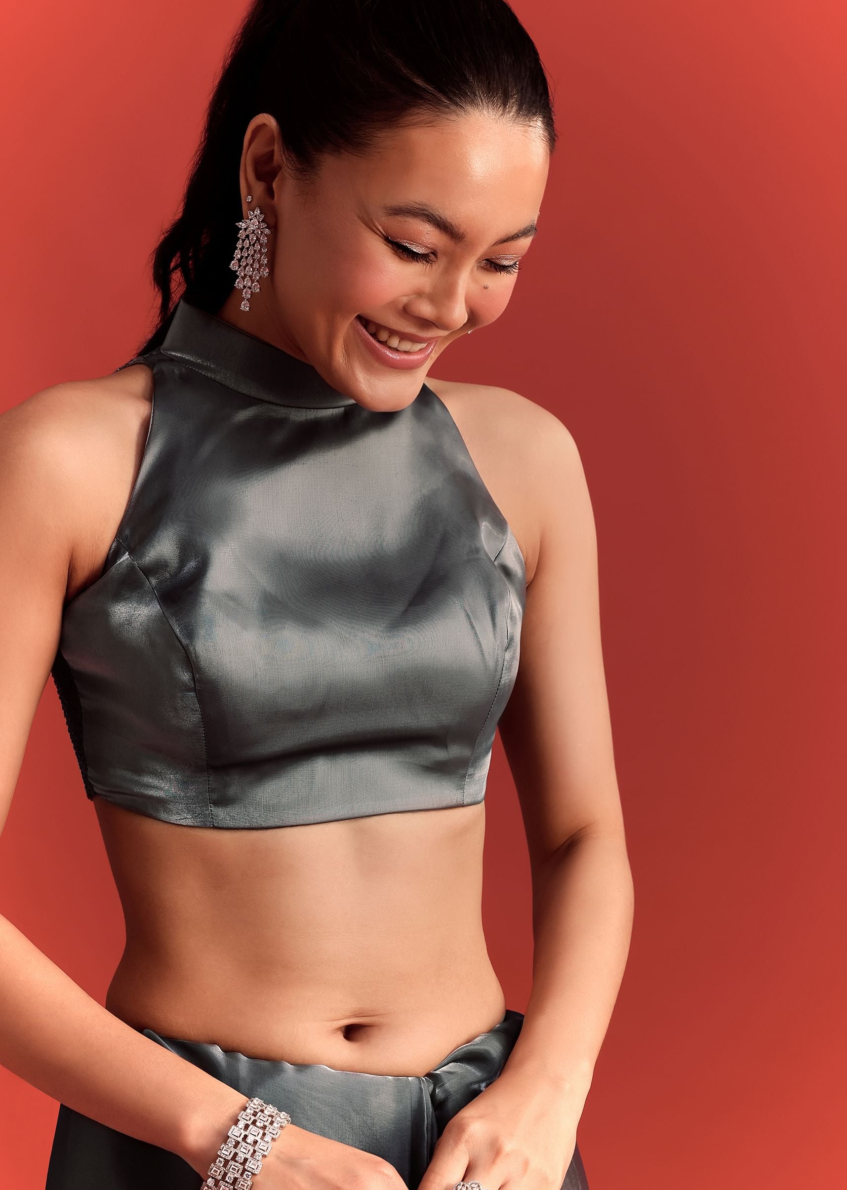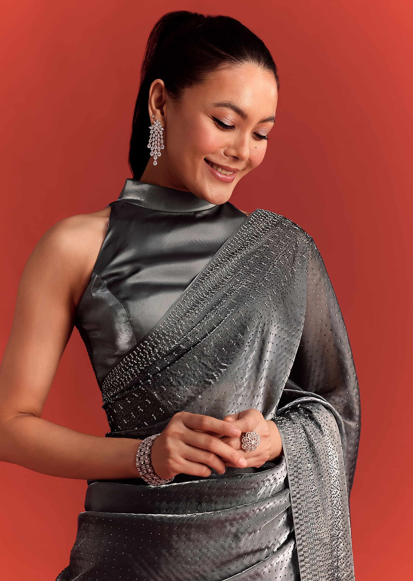 A glamorous addition to your festive wardrobe is this grey saree, tailored from luxurious and skin-friendly satin. With intricate stone work and diamond embellishments all over, it embodies the spirit of celebration. A perfect addition for weddings, cocktail parties and celebratory gatherings. Awarded as the Most Trusted Brand, we're delivering styles you love, just as promised.