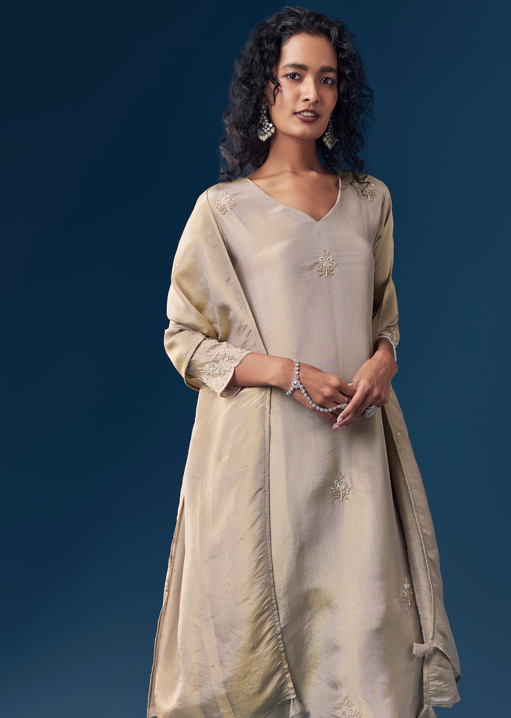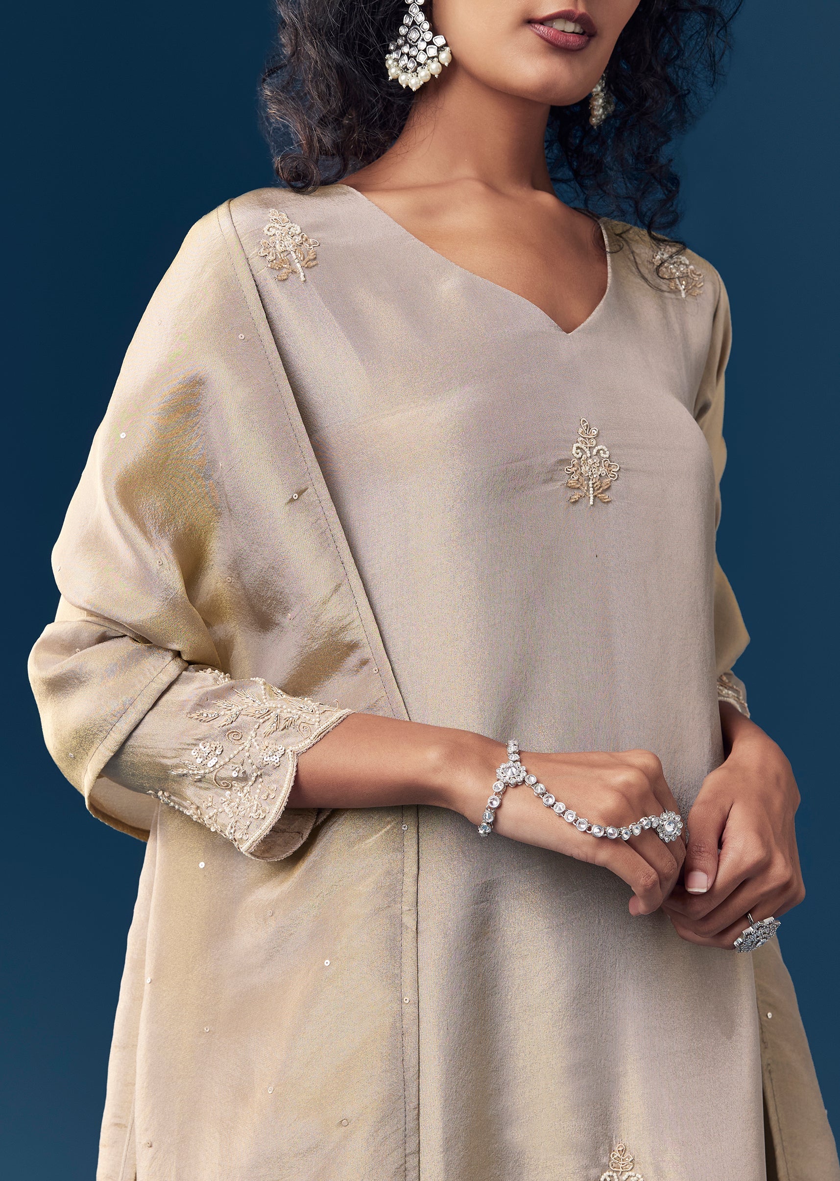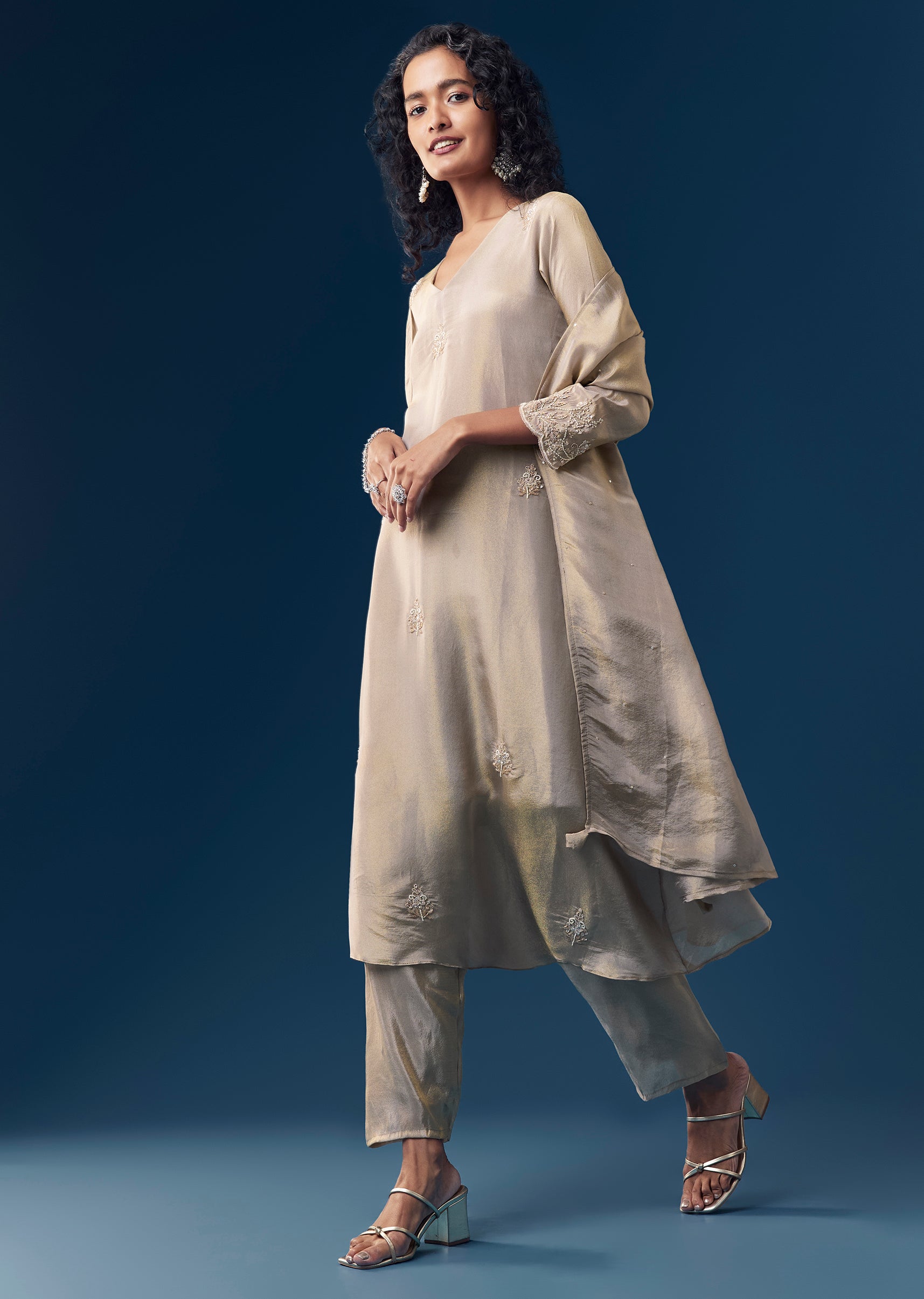 Delicately radiant and rich in detail, this tissue anarkali set captures festive elegance with its all over sequins and moti butti embroidery. The subtle shimmer enhances the soft sheen of... More Product Details