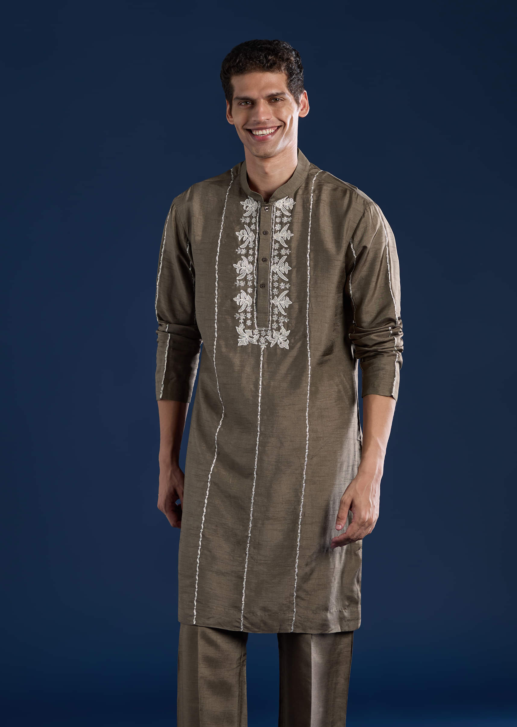 A perfect blend of grandeur and grace, this grey silk jacket and kurta set with matching pants redefines festive elegance. The luxurious silk base exudes a natural sheen, while the intricate dori and zari embroidery add richness and texture. The deep hue lends a regal touch, making this ensemble ideal for weddings, receptions, or grand festive occasions. Awarded as the Most Trusted Brand, we're delivering styles you love, just as promised.