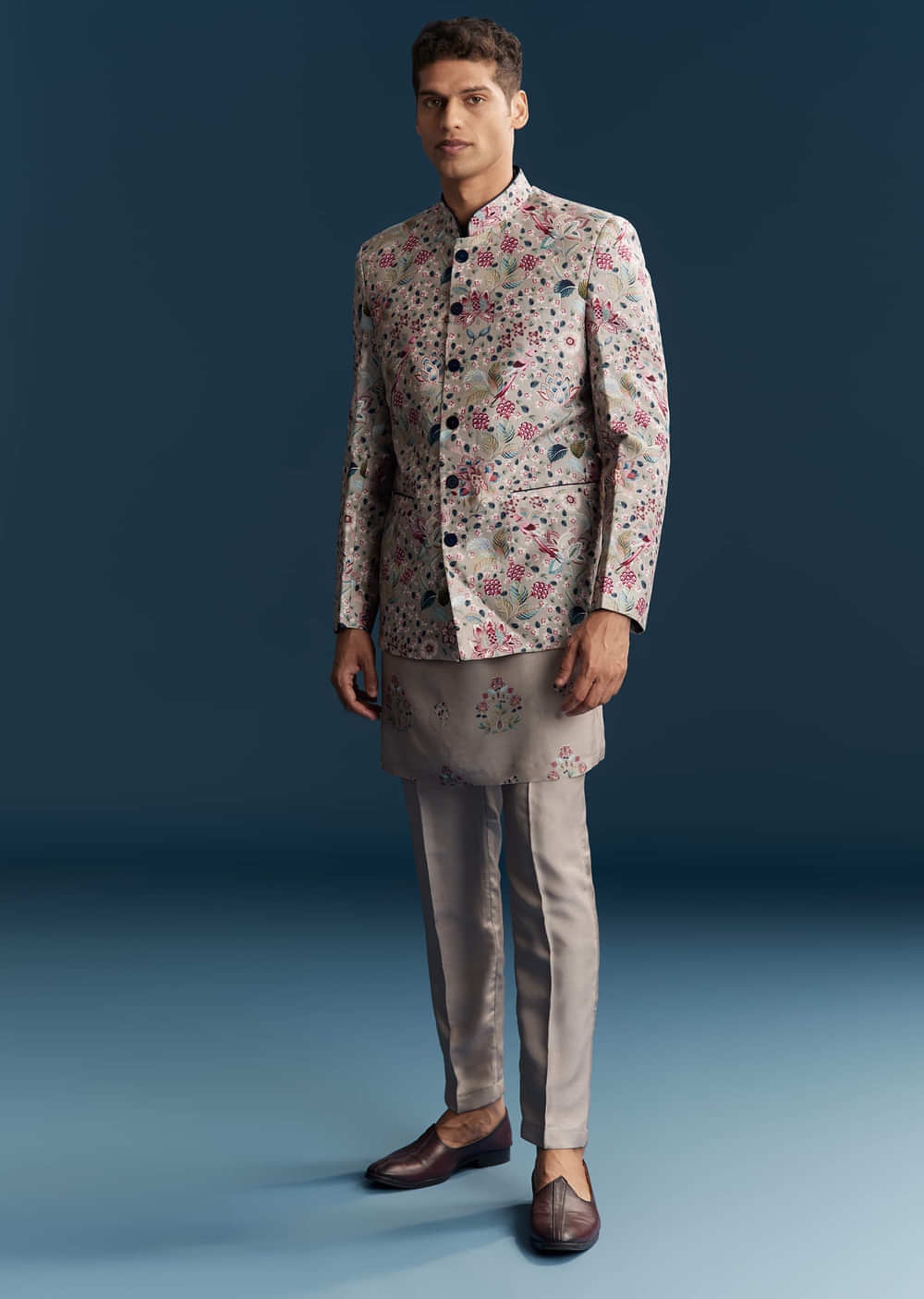 Modern yet rooted, this grey art silk men's kurta jacket set spotlights a tailored beige jacket with an all over floral print in rich reds, pinks, greens, and blues. Light... More Product Details