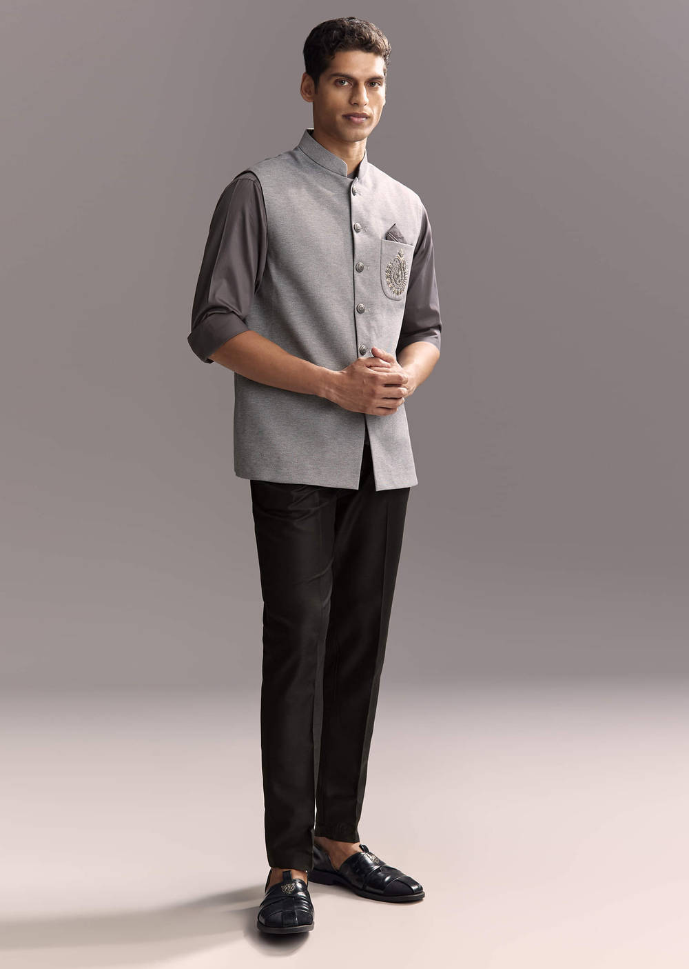 Grey Silk Kurta Jacket Set For Men With Hand Embroidery