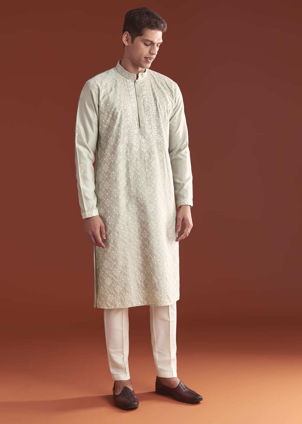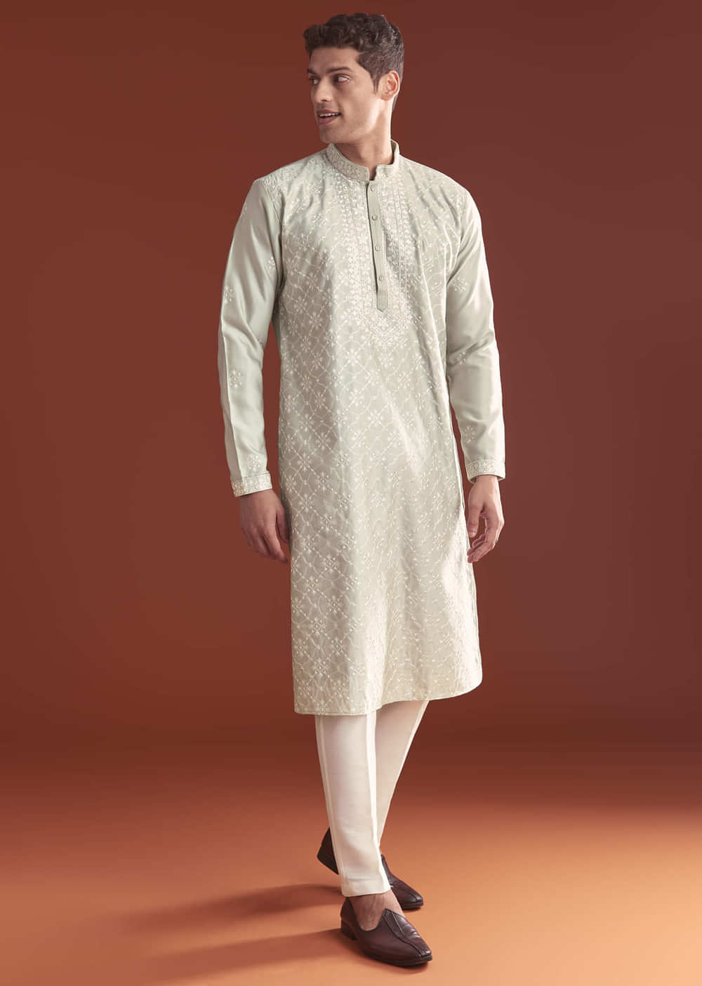 Grey Silk Kurta Set For Men With Resham Embroidery