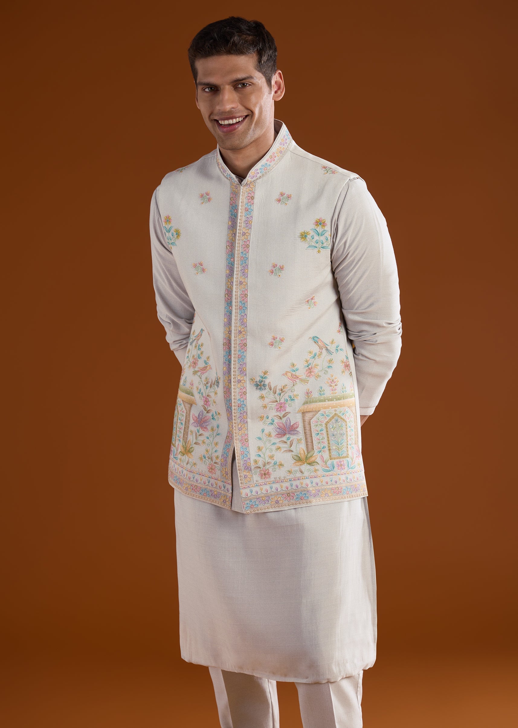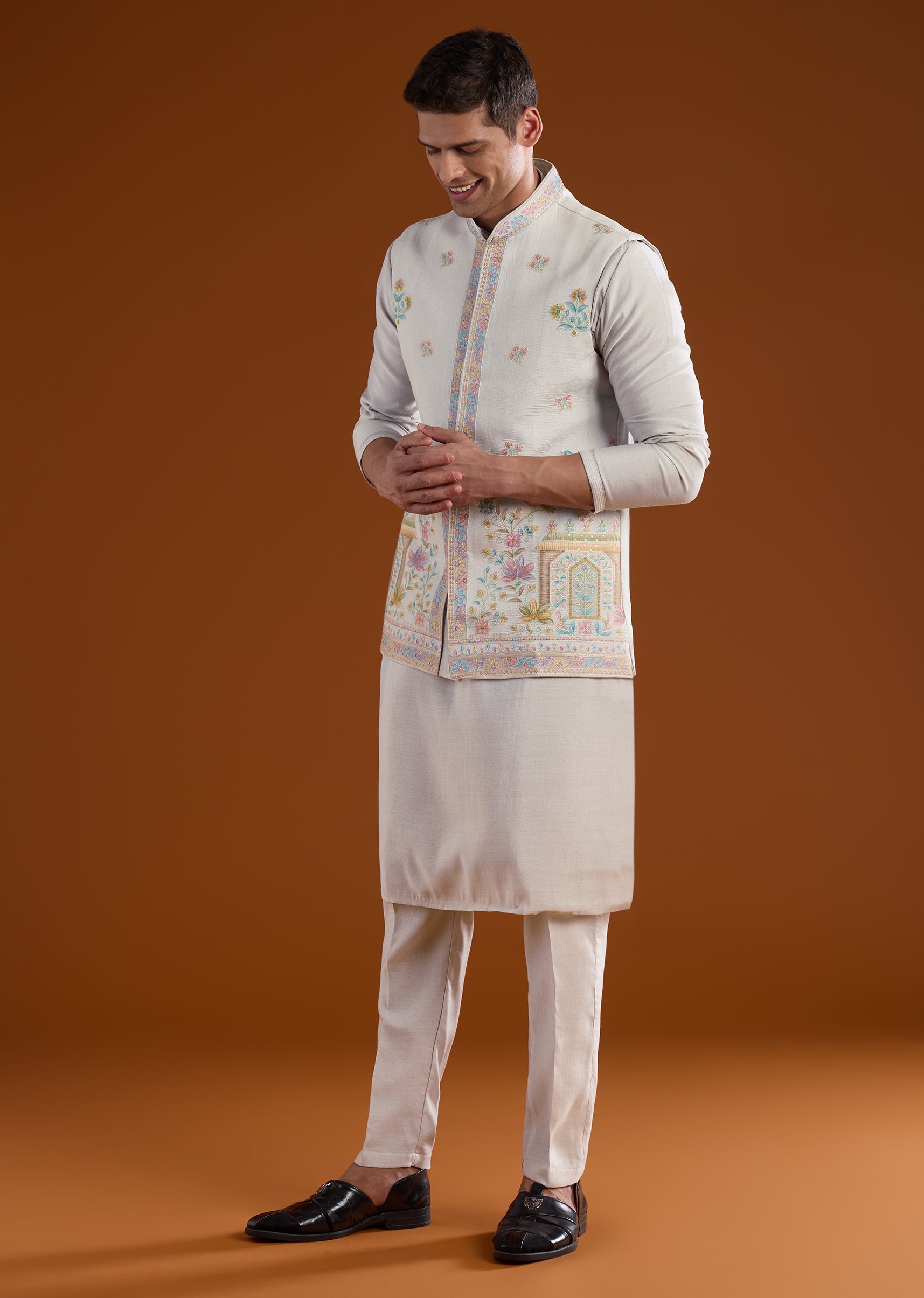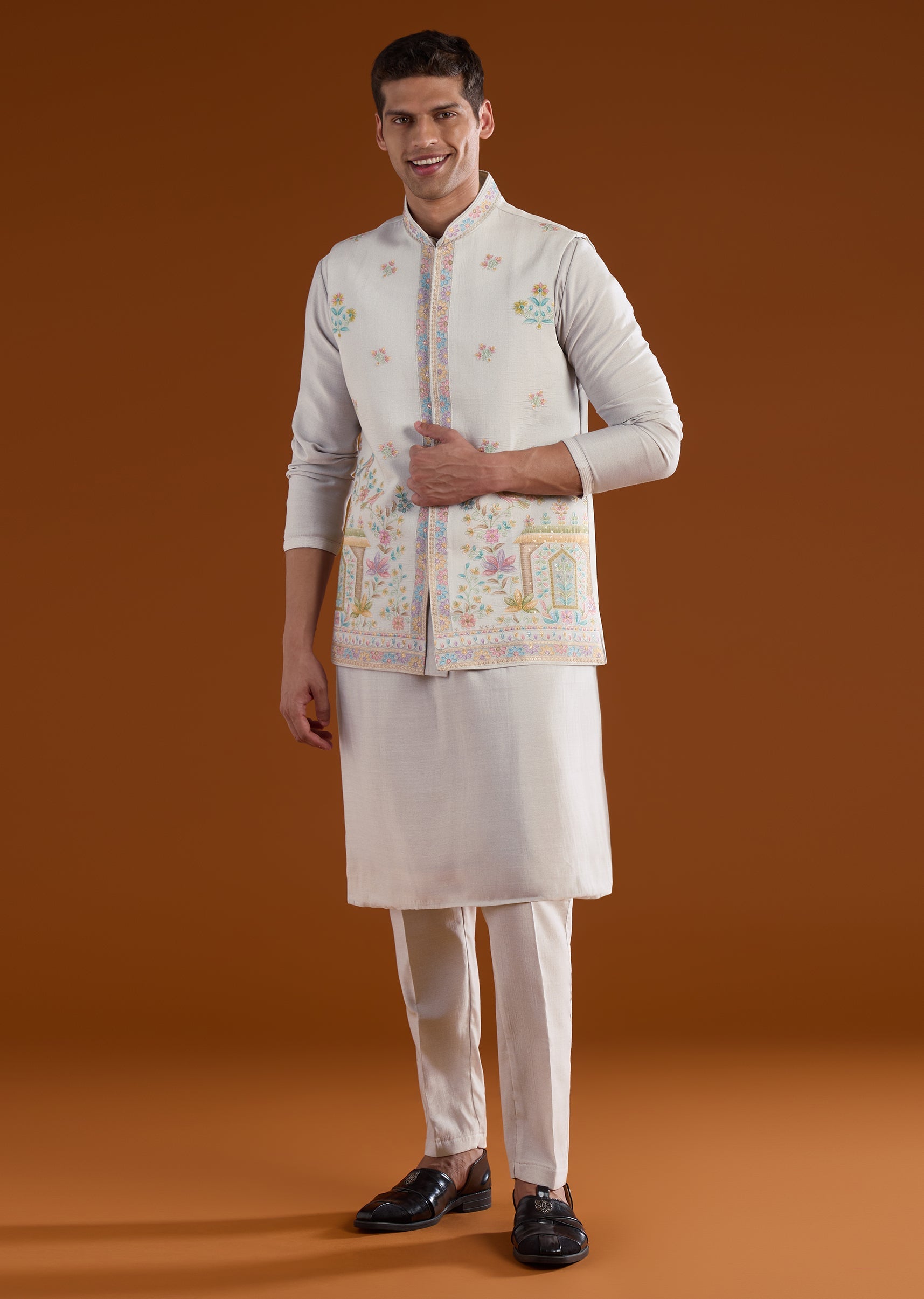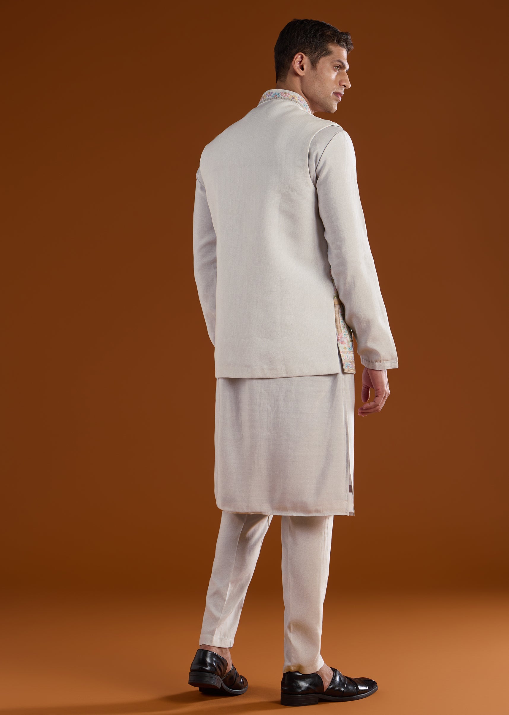 Fit Tips:Ensure the jacket rests neatly on the shoulders with comfortable arm movement, and the kurta falls smoothly for effortless wear during long celebrations.