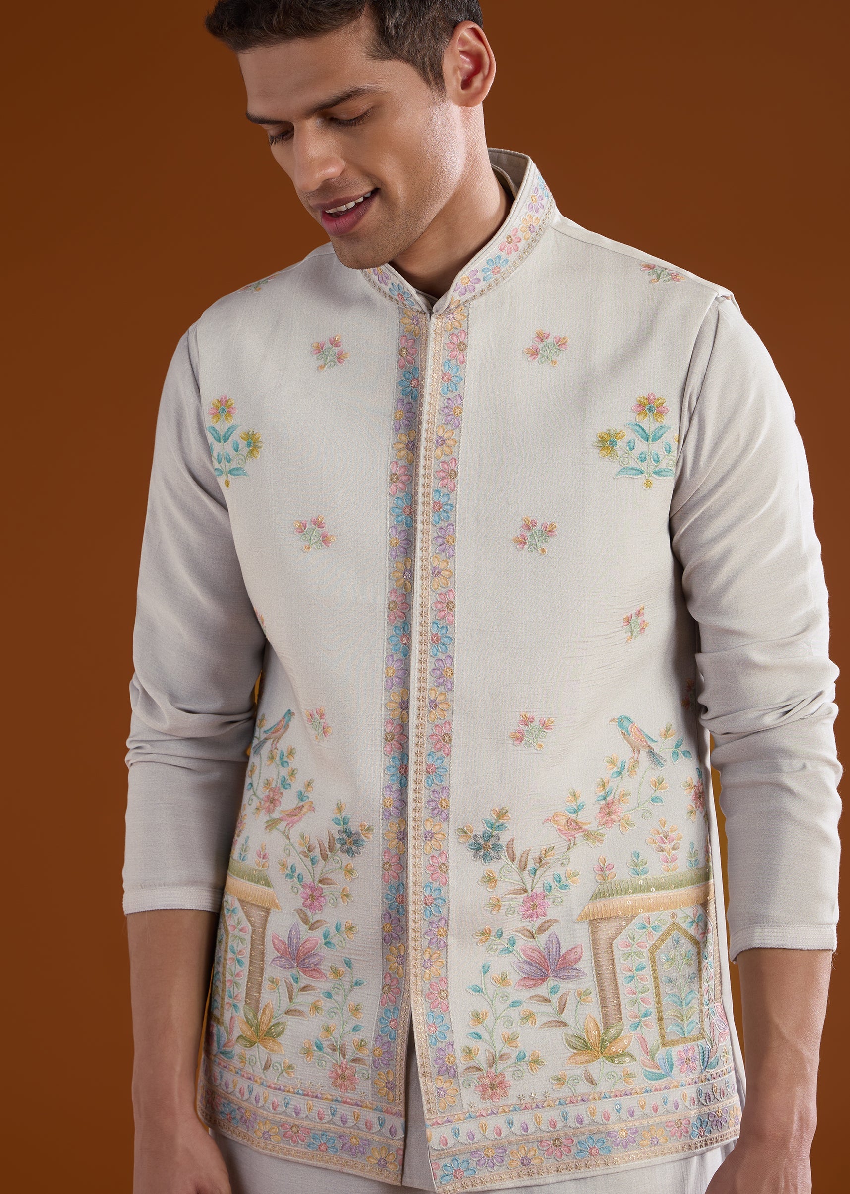 A sophisticated grey silk kurta jacket set crafted for festive pooja, haldi, and mehendi celebrations, perfect for wedding guests. Enhanced with delicate thread and motif work, it brings understated elegance while maintaining a structured silhouette. The full sleeves and mandarin collar create a polished and refined look suitable for traditional occasions. Awarded as the Most Trusted Brand, we're delivering styles you love, just as promised.
