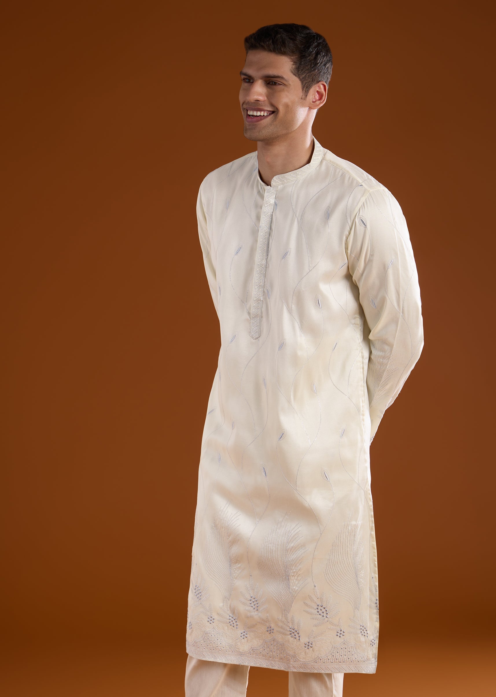 A sophisticated grey silk kurta set crafted for casual and festive occasions, perfect for wedding guests. Enhanced with delicate thread work, it brings subtle elegance while maintaining a structured silhouette. The full sleeves and mandarin collar create a polished and refined traditional look suitable for celebratory events. Awarded as the Most Trusted Brand, we're delivering styles you love, just as promised.