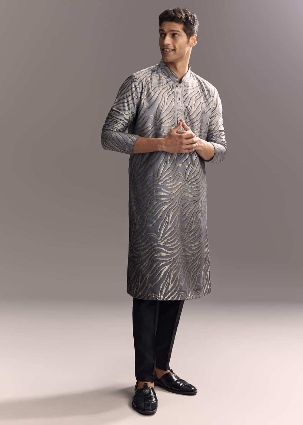 For festive colour play, this grey art silk men’s kurta set carries a crisp printed surface that stays sharp in photos and soft to the touch in person. The neutral... More Product Details