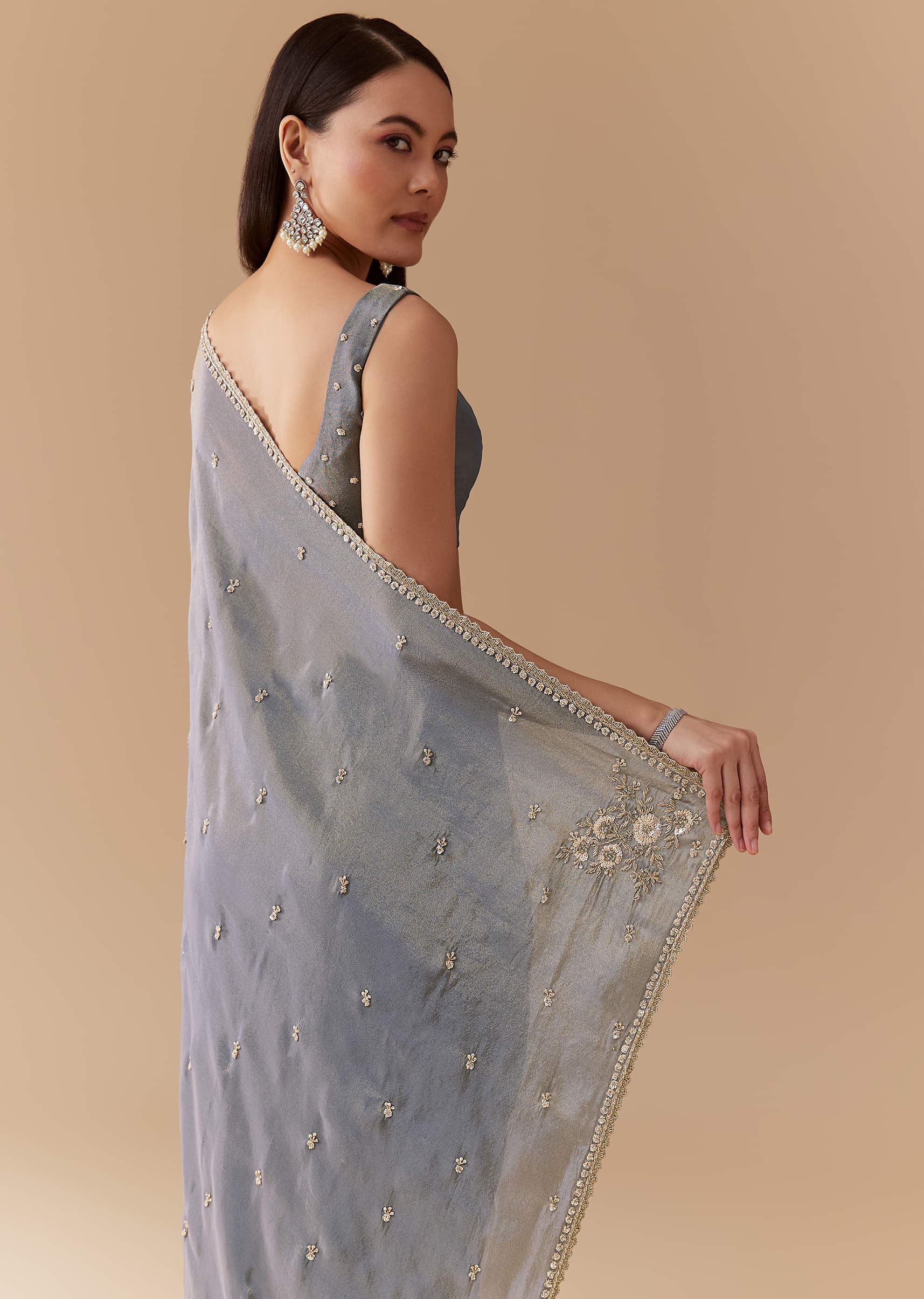 Grey Tissue Cutdana Embroidered Saree with Unstitched Blouse