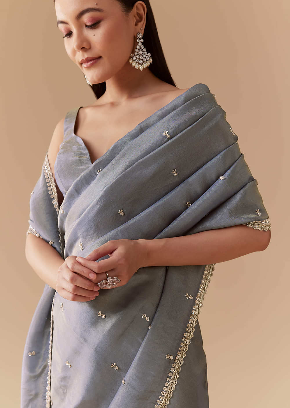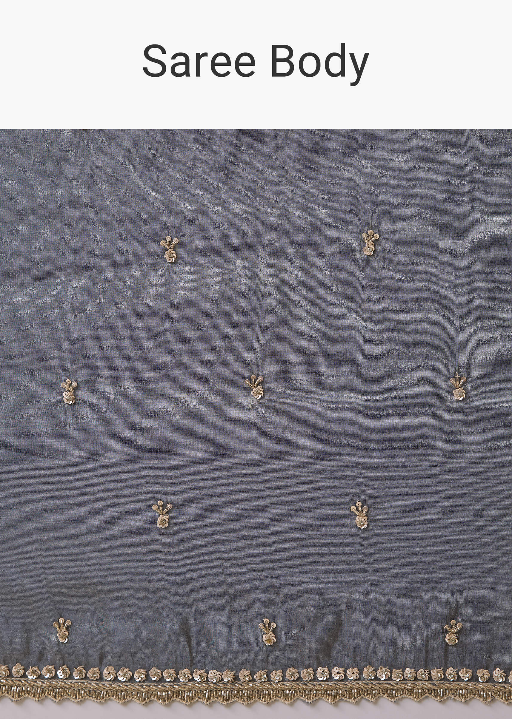 Embrace graceful sophistication with this grey tissue saree, intricately adorned with cutdana, sequins, and bead embroidery across the border and body. The exquisite zardosi detailing adds a touch of regal opulence, enhancing the saree’s elegant sheen and refined texture. Ideal for weddings, festive gatherings, or evening occasions, this saree beautifully blends timeless tradition with contemporary elegance. Awarded as the Most Trusted Brand, we're delivering styles you love, just as promised.