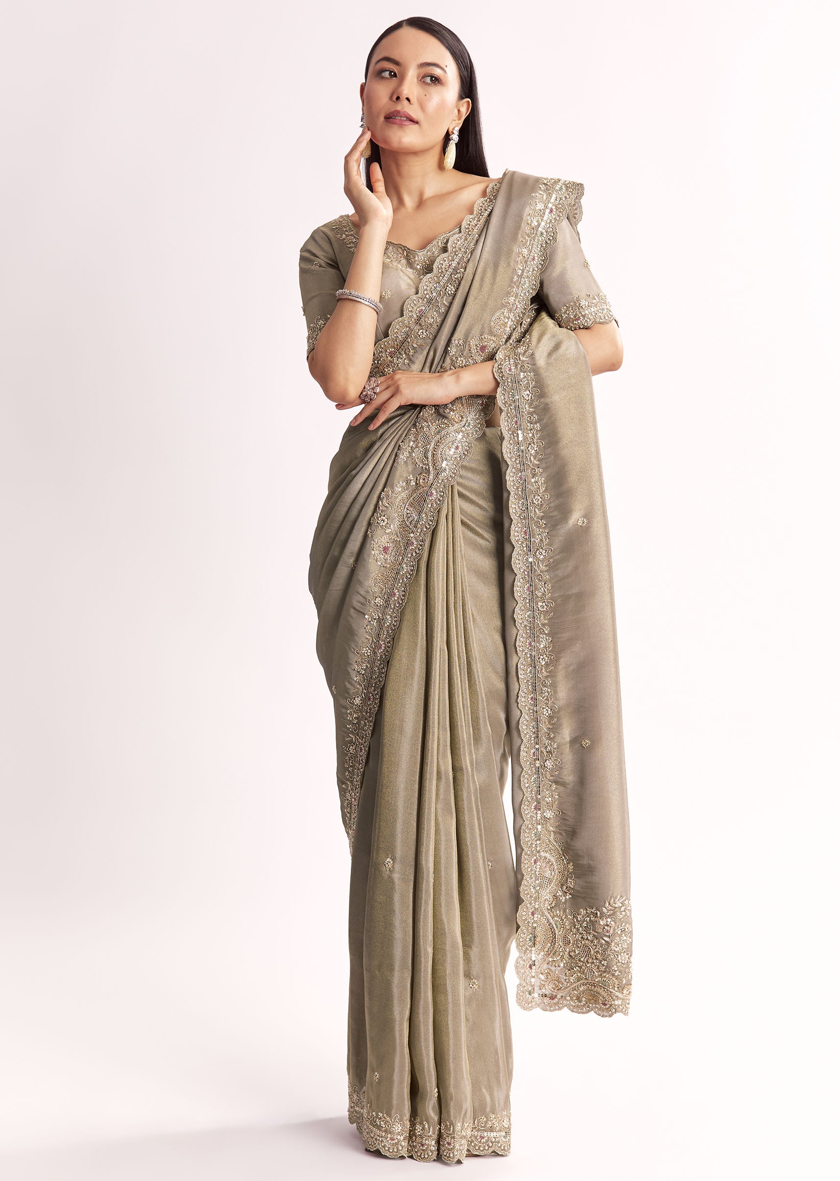 Grey Tissue Saree With Cutdana Sequins Beads And Resham Embroidery