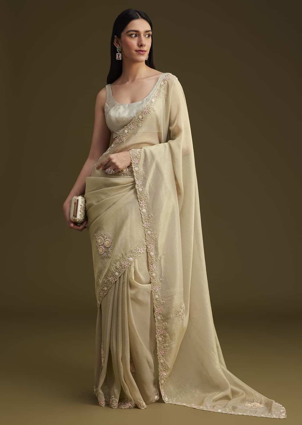 Pair it with a sleek metallic clutch and delicate silver jewelry to highlight the embroidery and shimmer of the saree.