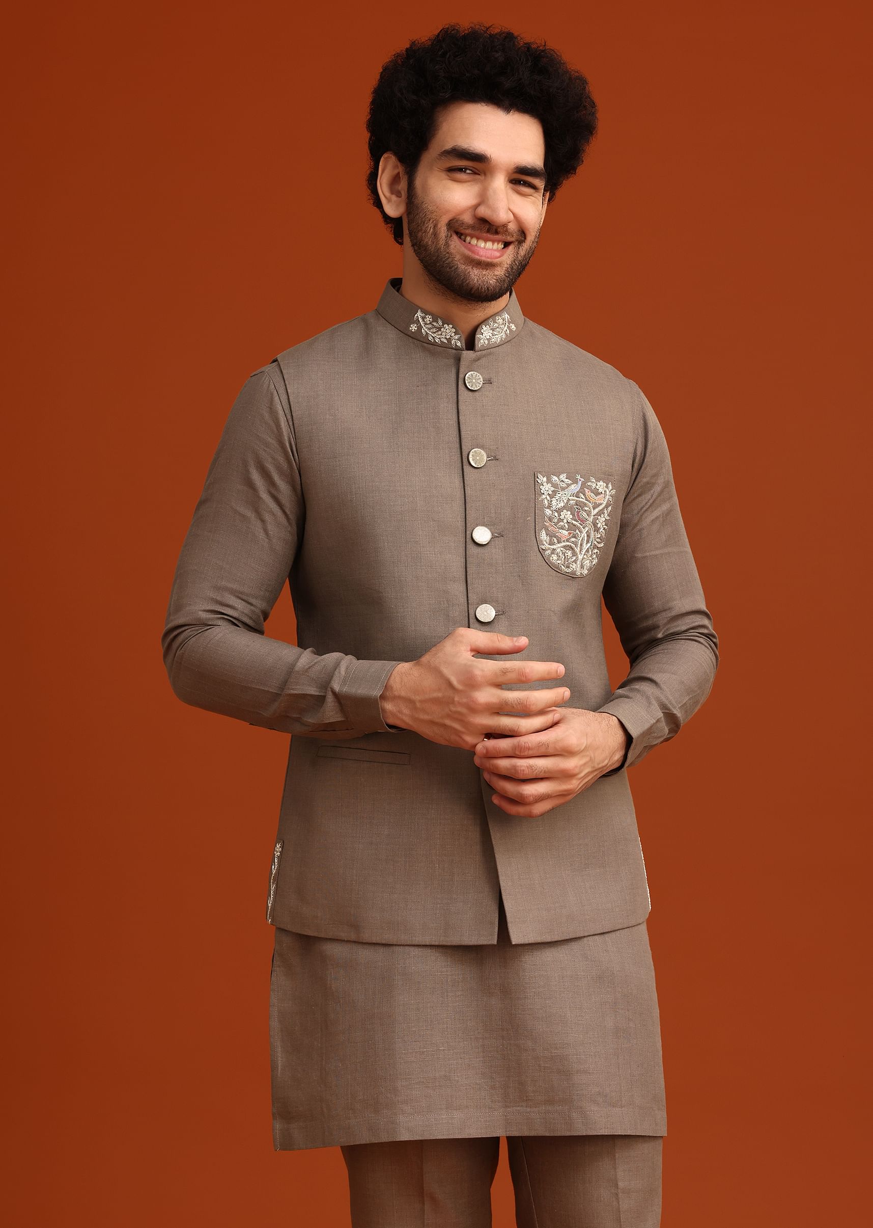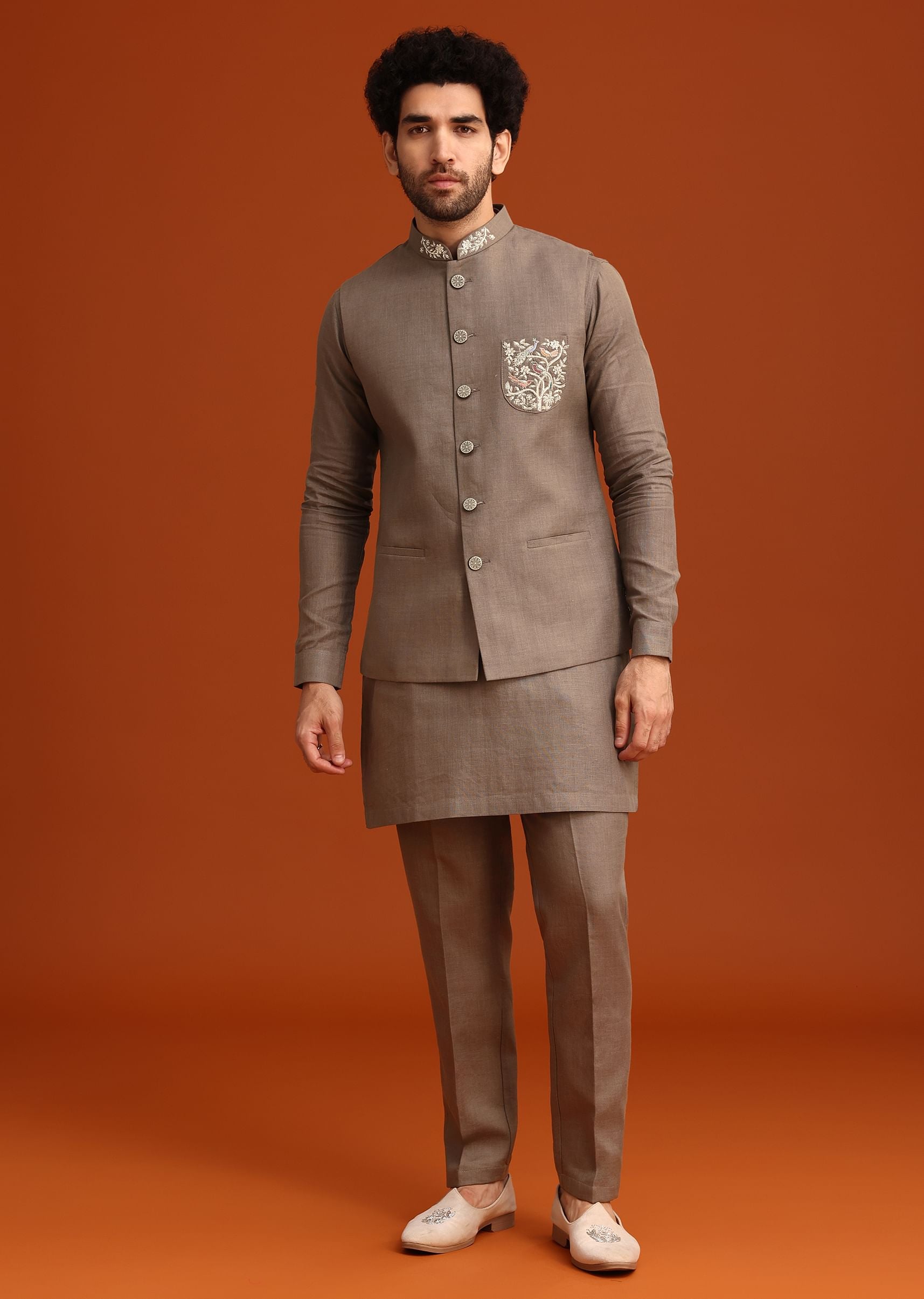- Perfect for festive occasions, family gatherings, and intimate celebrations, the jacket features exquisite zardozi work on the pocket and collar, adding a touch of sophistication.