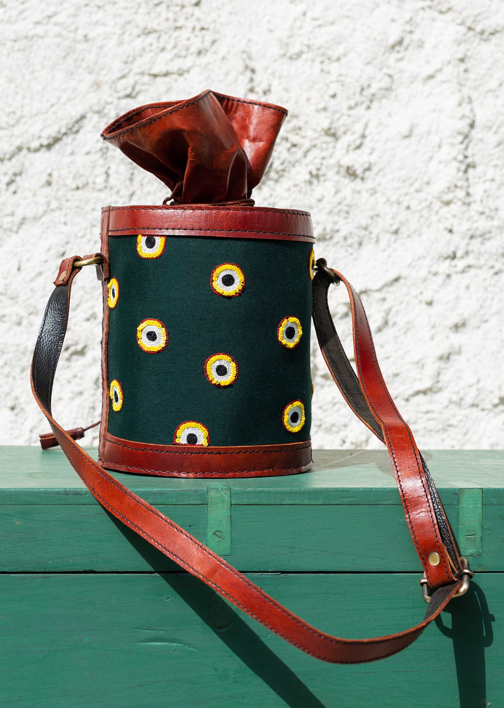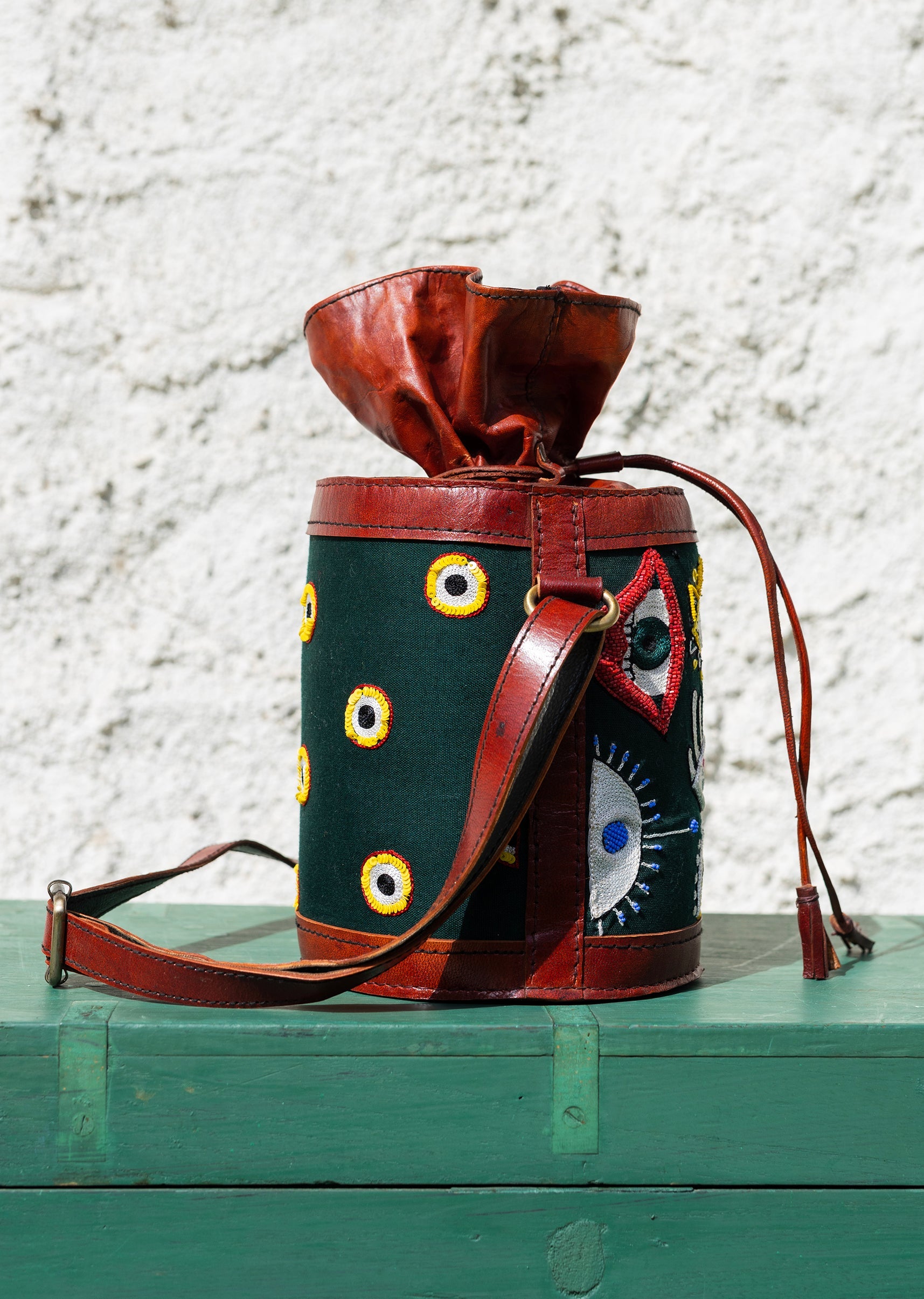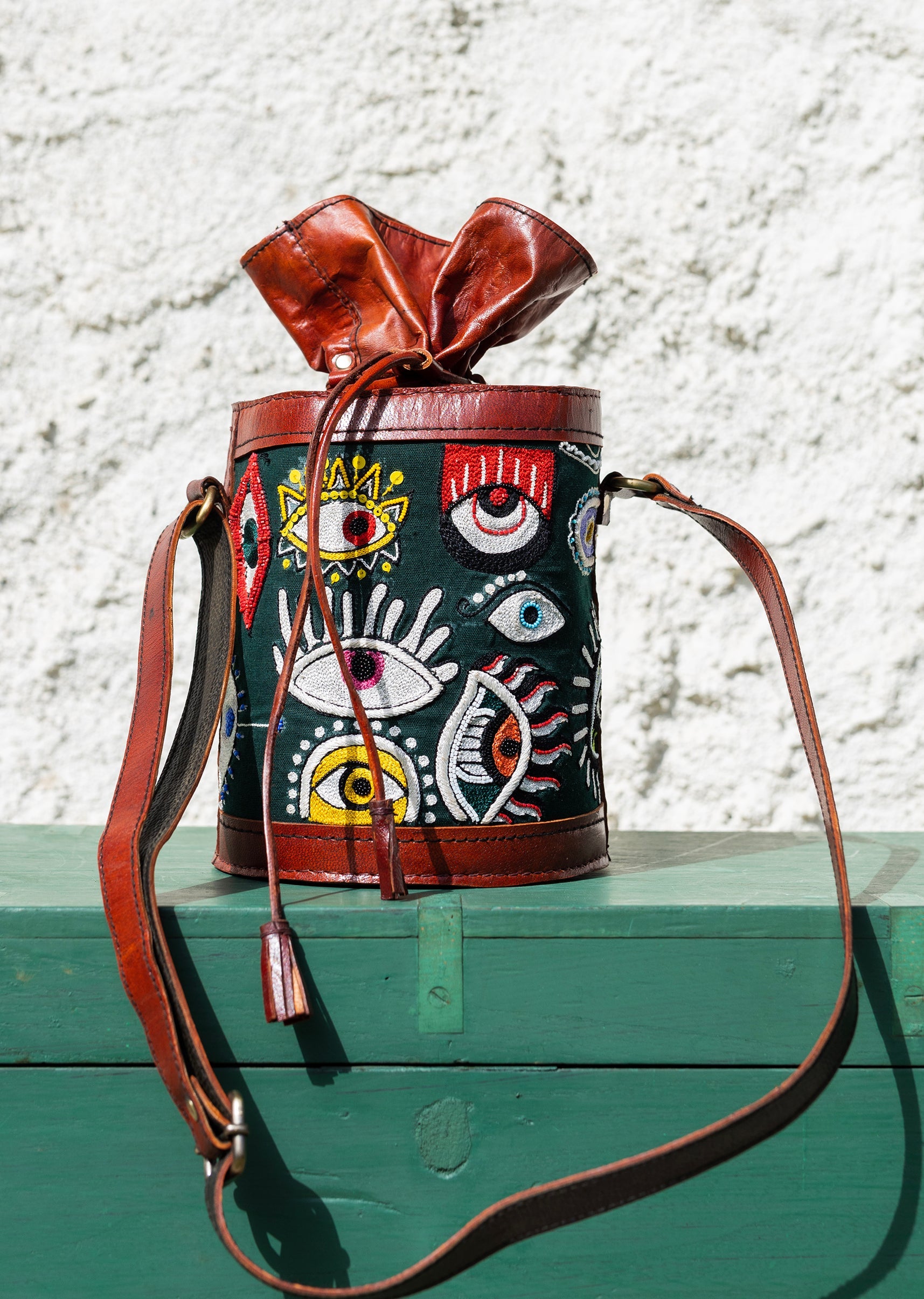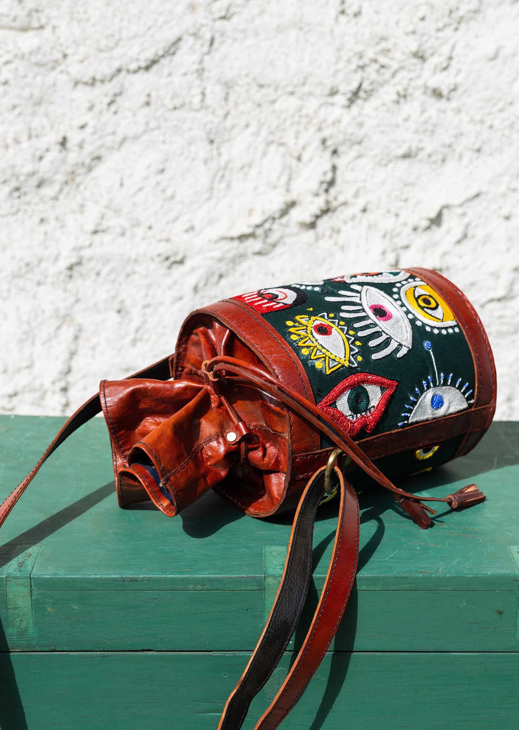 Handcrafted leather potli bag with bold colourful eye embroidery