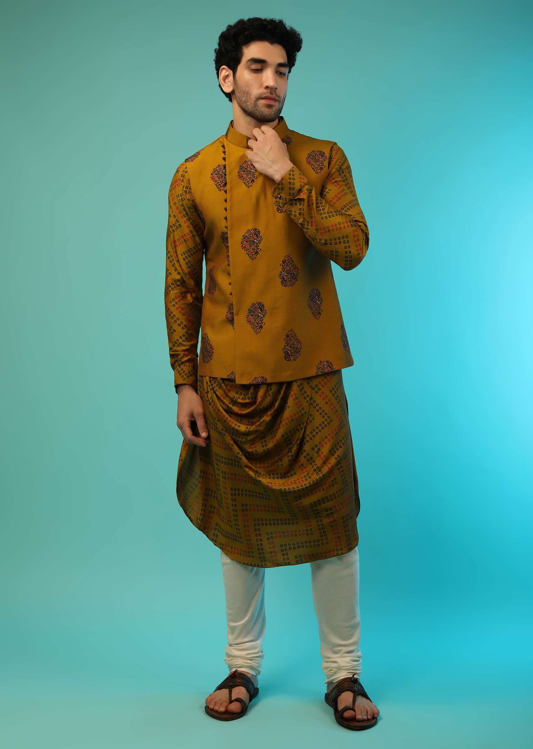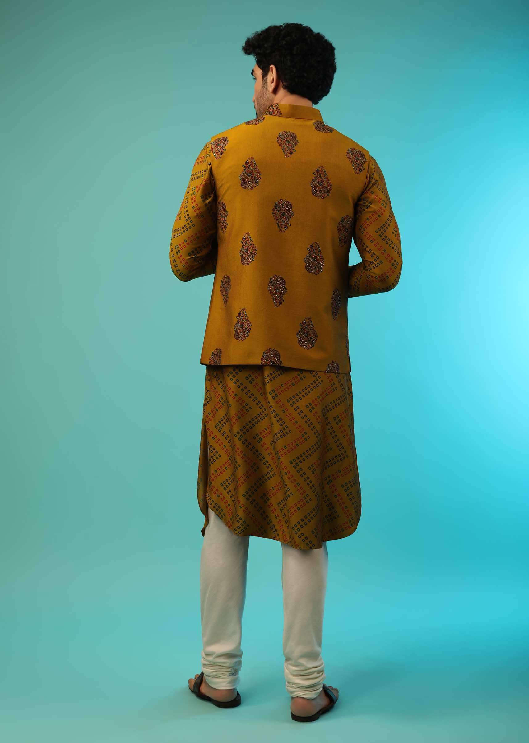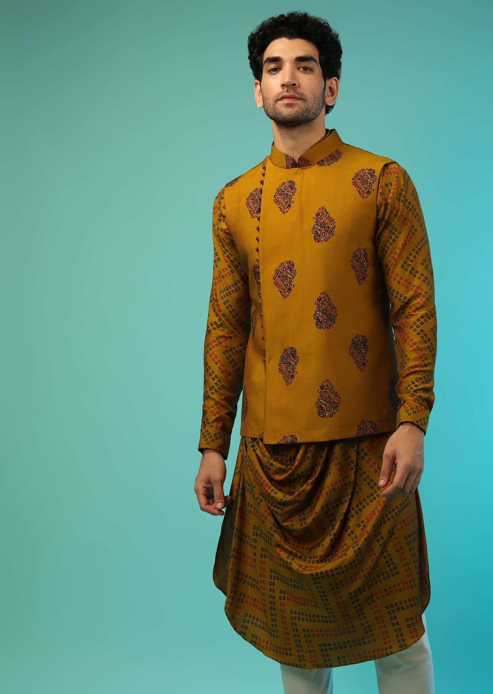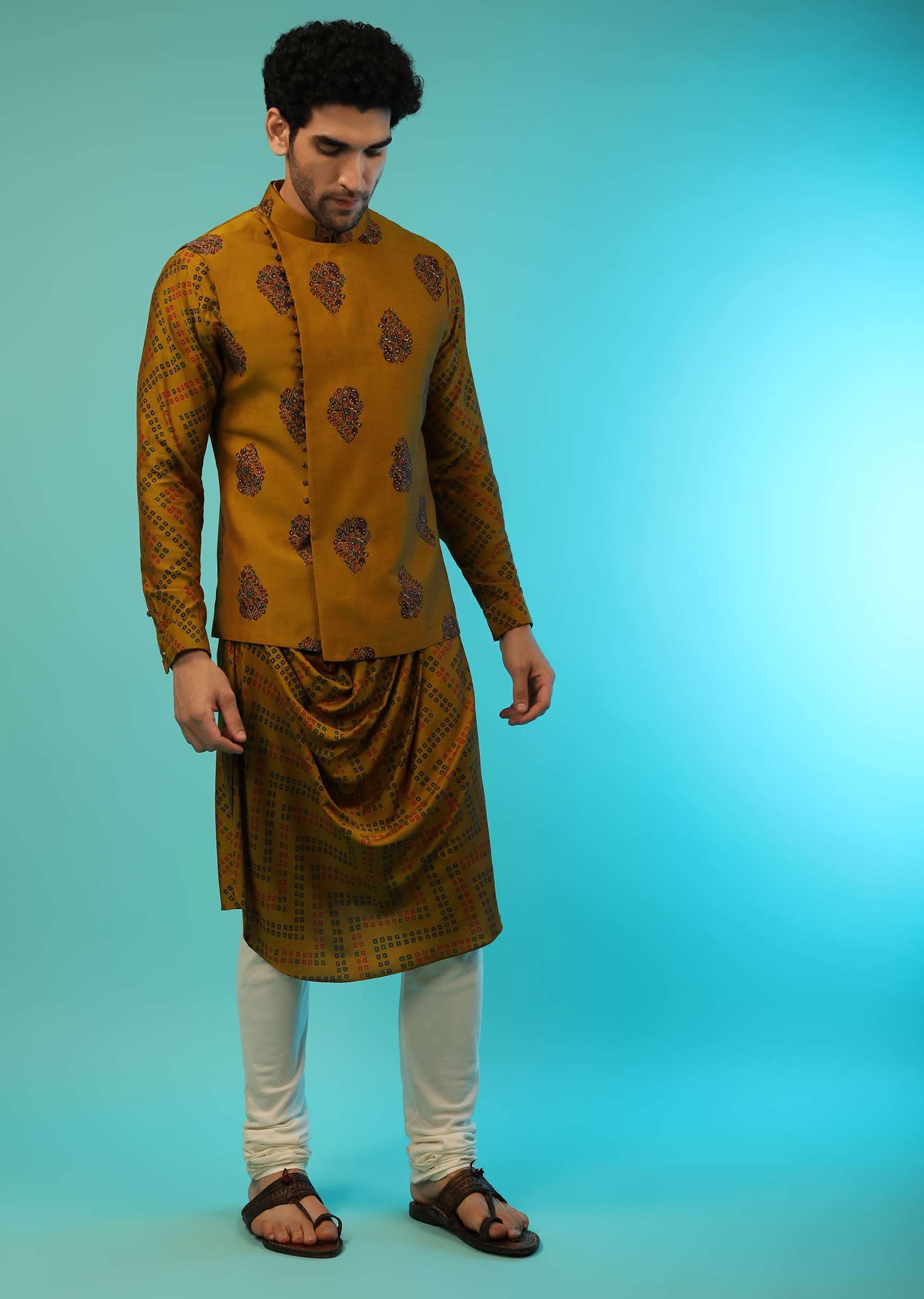 Honey Mustard Bandi Jacket With Block Printed Floral Buttis, Off Centre Placket And Bandhani Printed Cowl Kurta Set