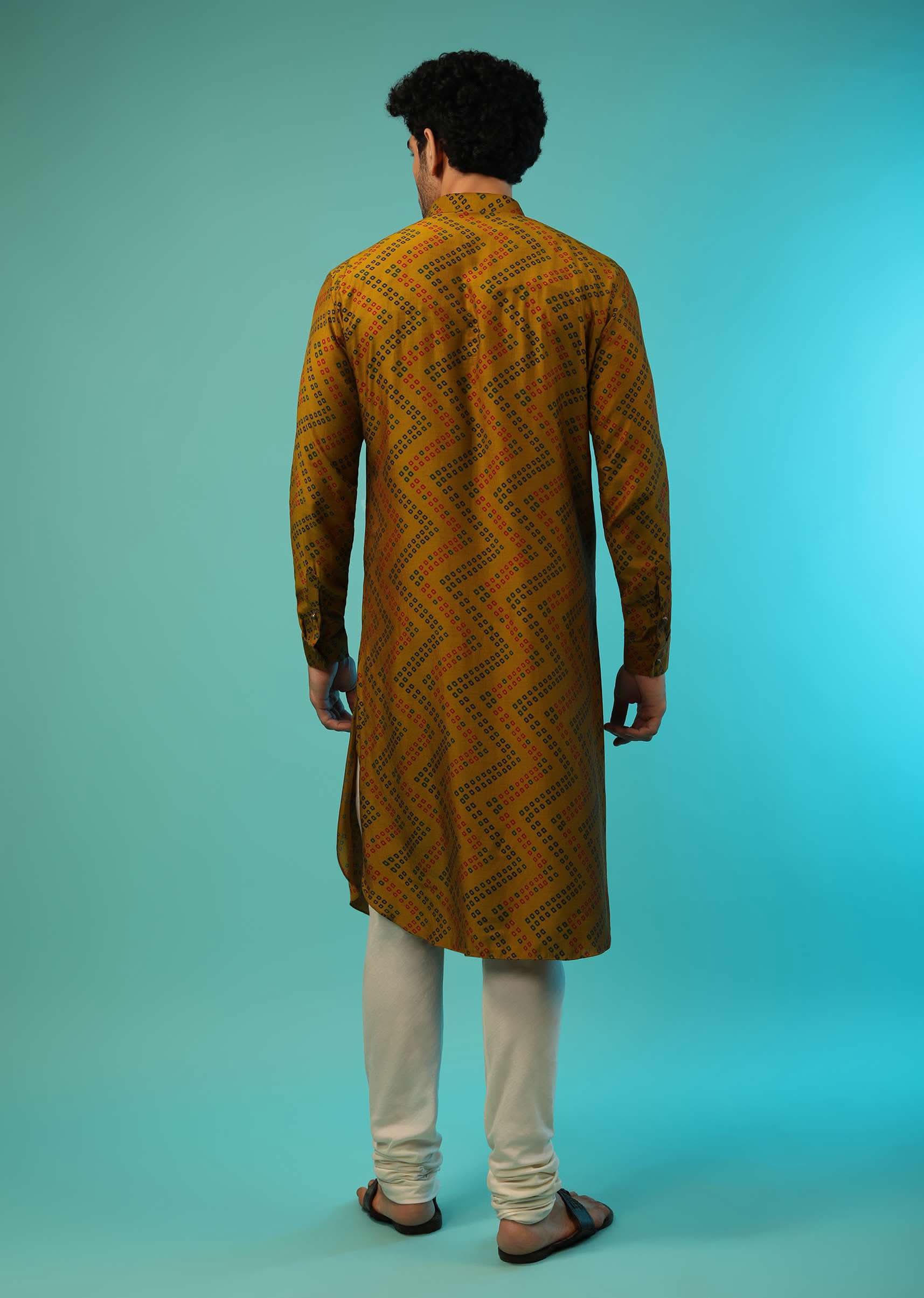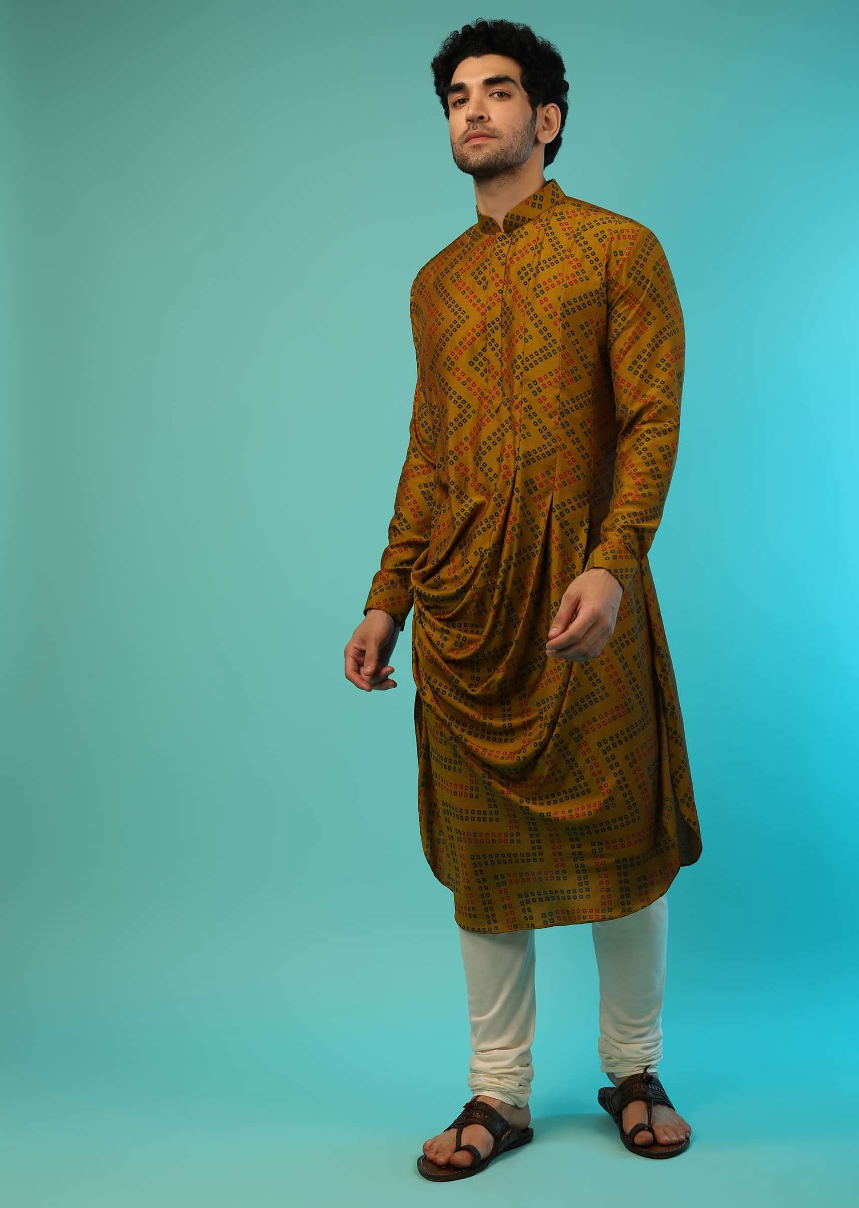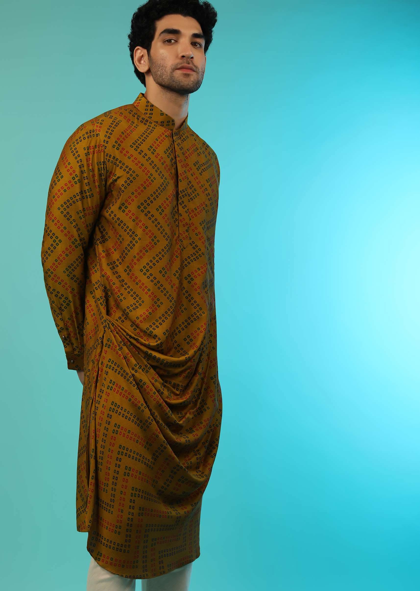 - Paired with a matching cotton kurta with bandhani print and cowl drape.