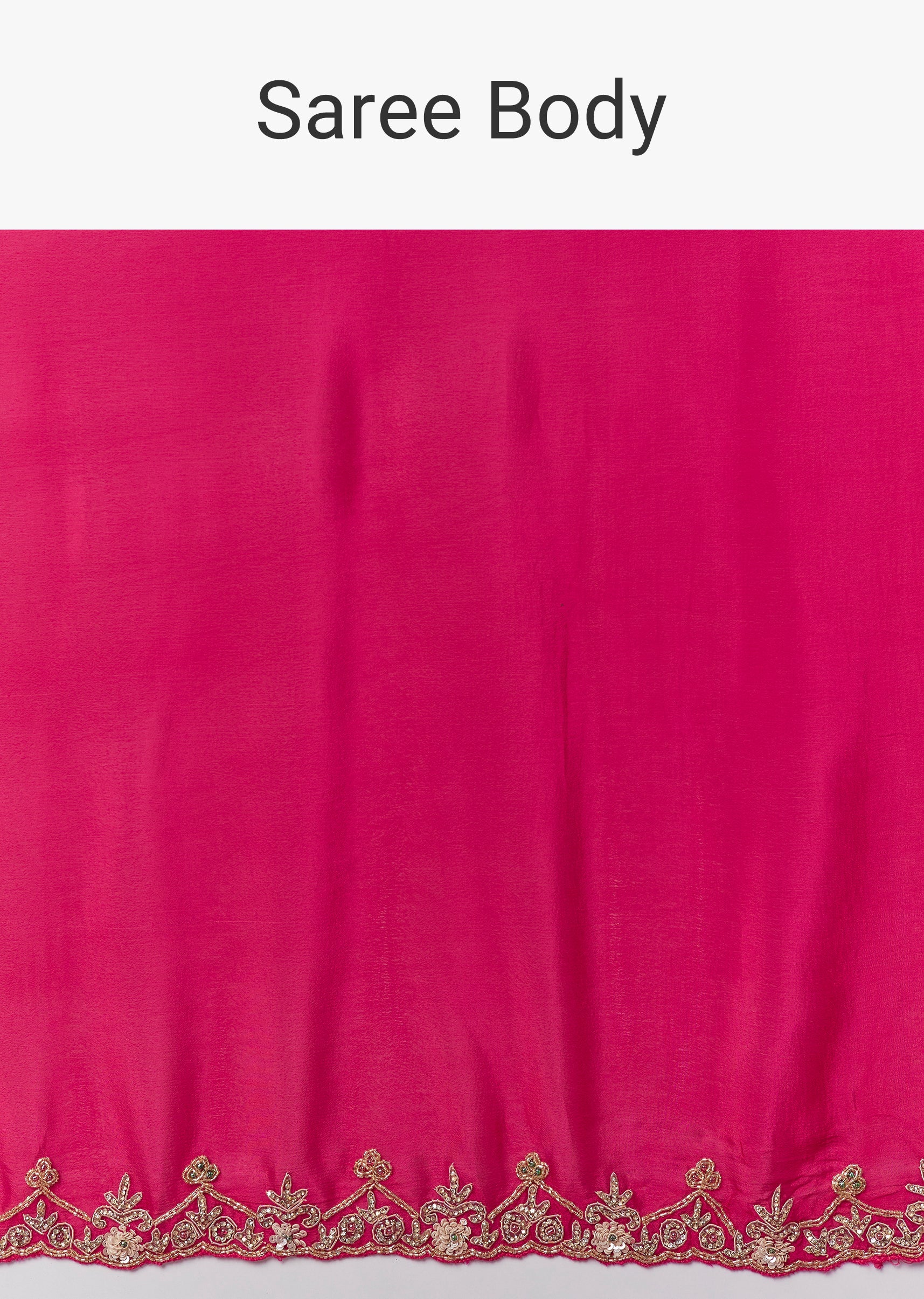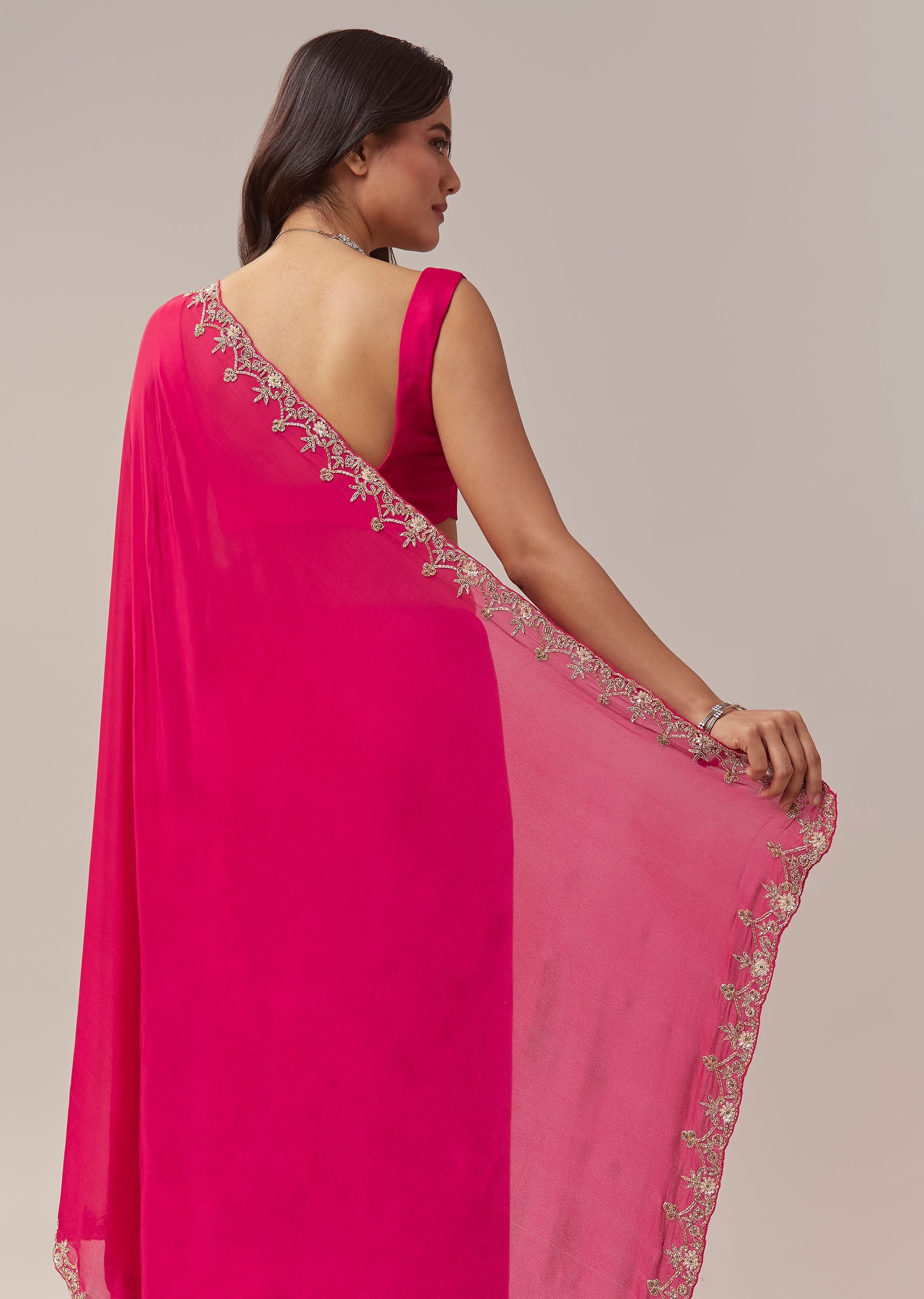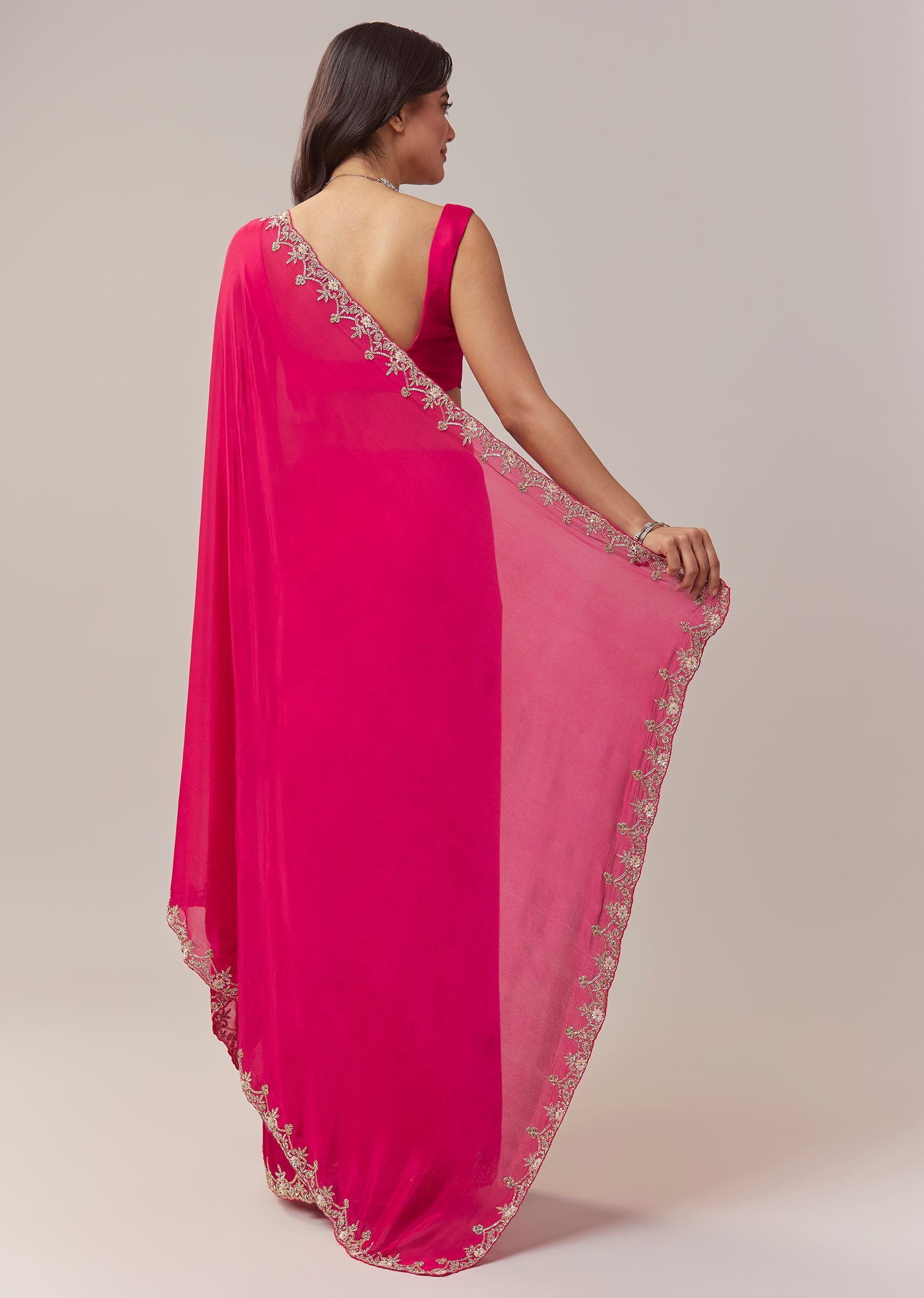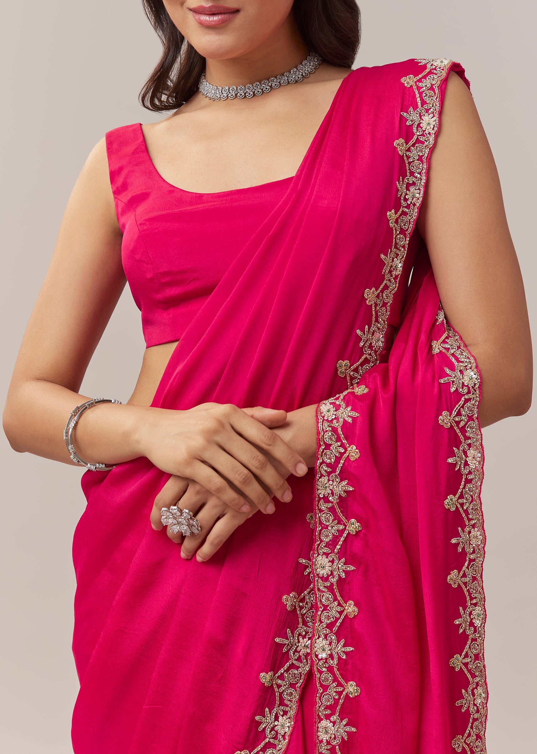 This hot pink chinon saree brings a vibrant festive charm with its lively color and delicate craftsmanship. The border is adorned with intricate floral handwork featuring zardosi, cutdana, sequins, and multicolor beads, adding a playful yet elegant shimmer to the drape. Perfect for festive occasions, mehendi, and wedding functions, the saree comes with an unstitched blouse, allowing you to tailor it to your preferred style and fit for a polished and celebratory look. Awarded as the Most Trusted Brand, we're delivering styles you love, just as promised.