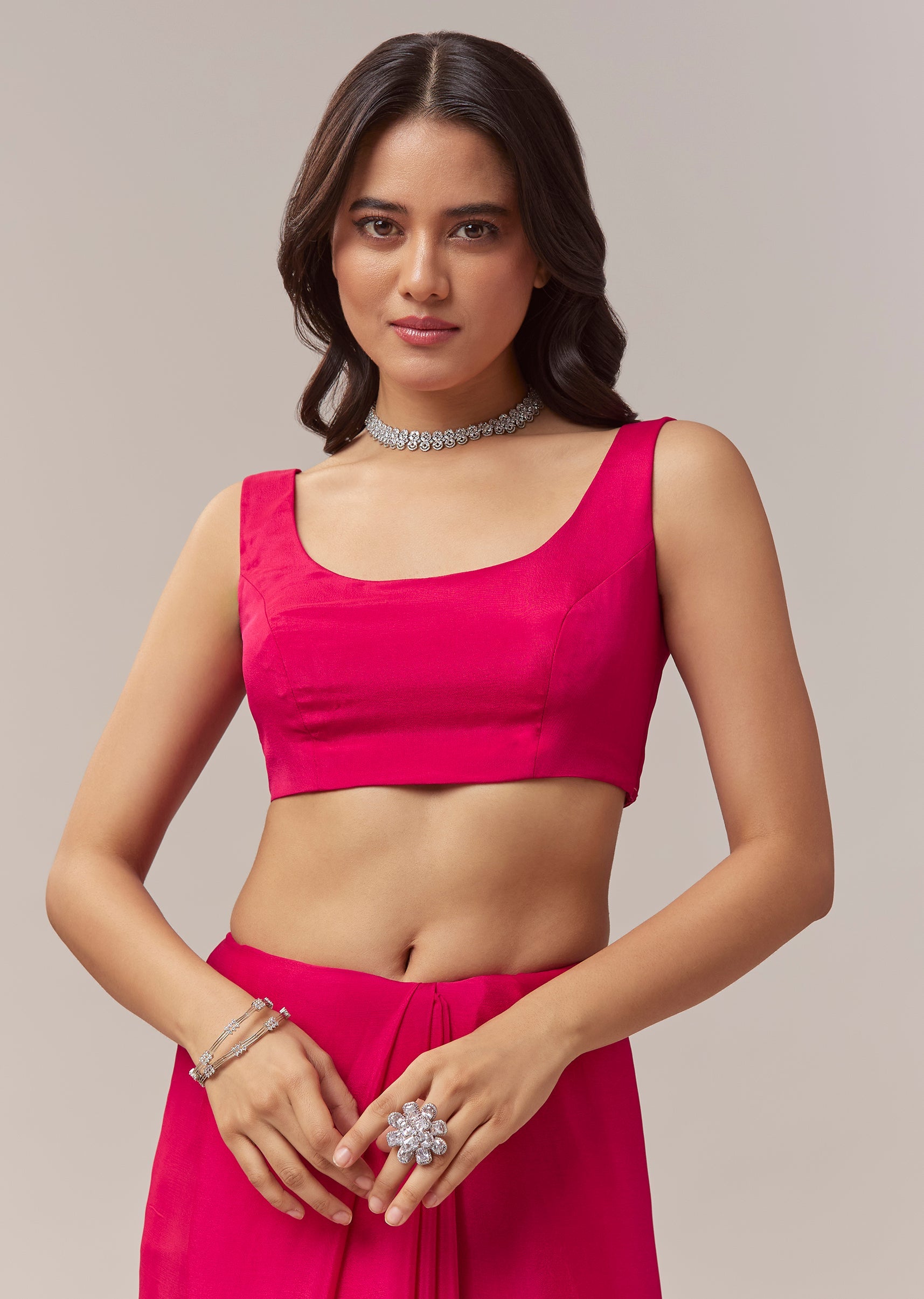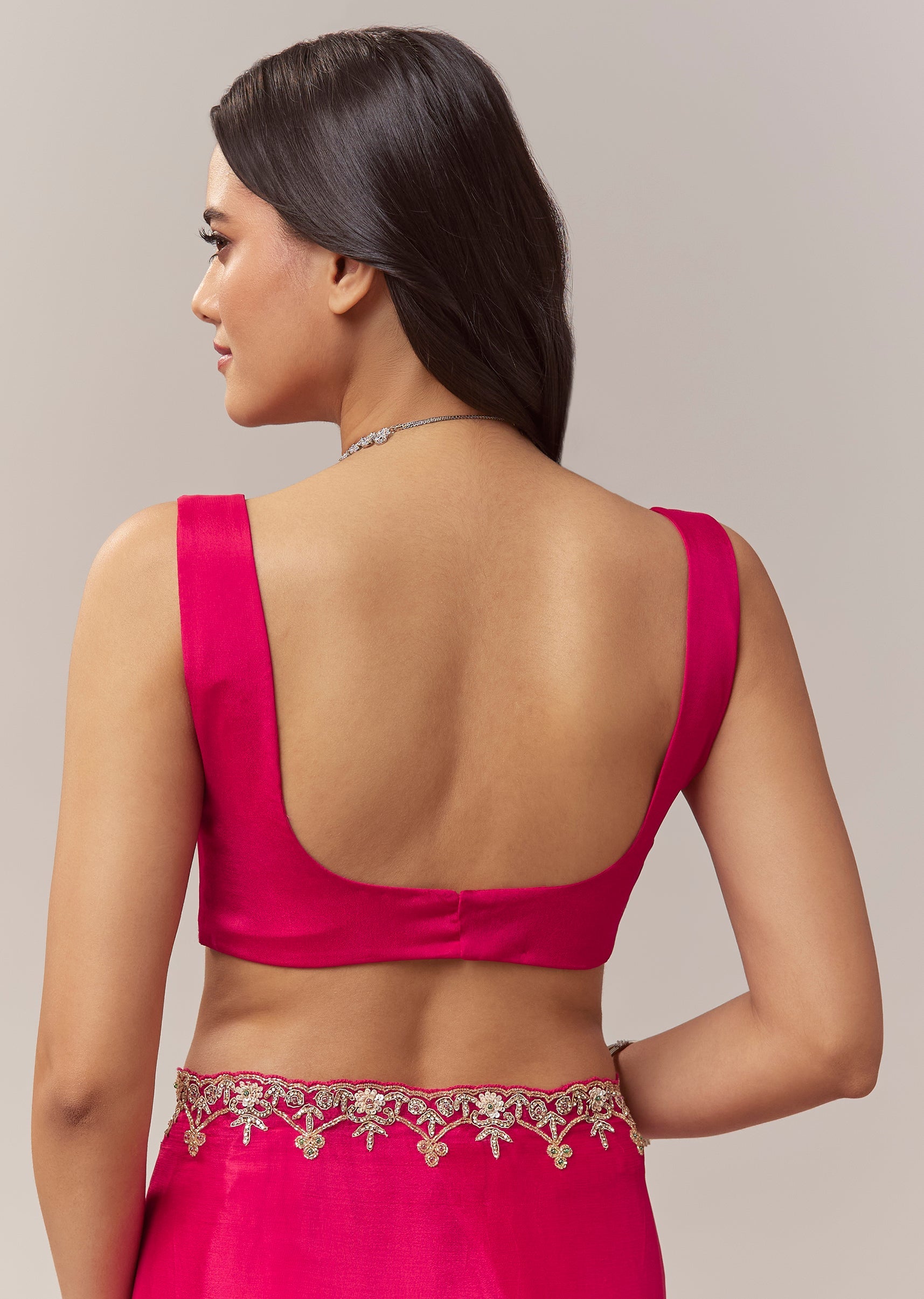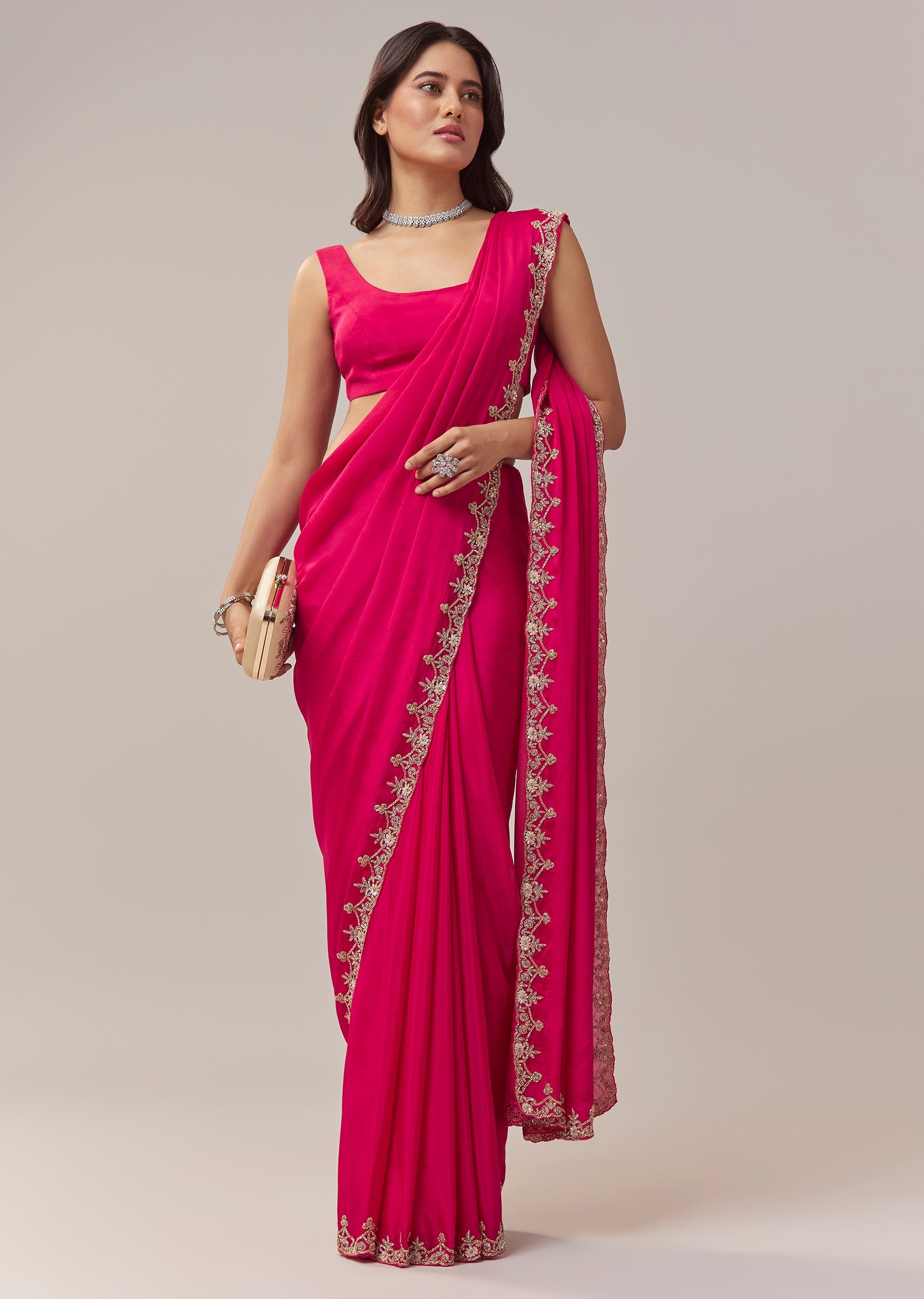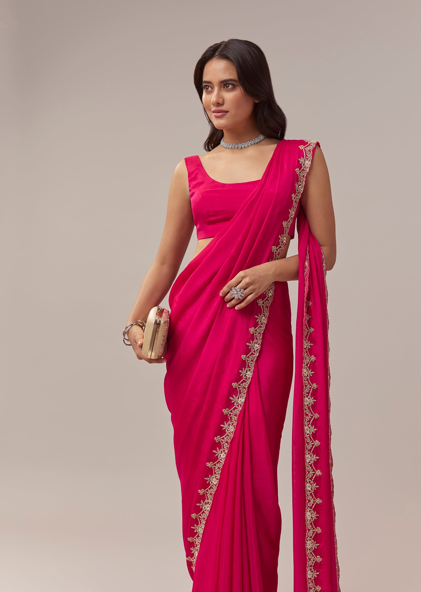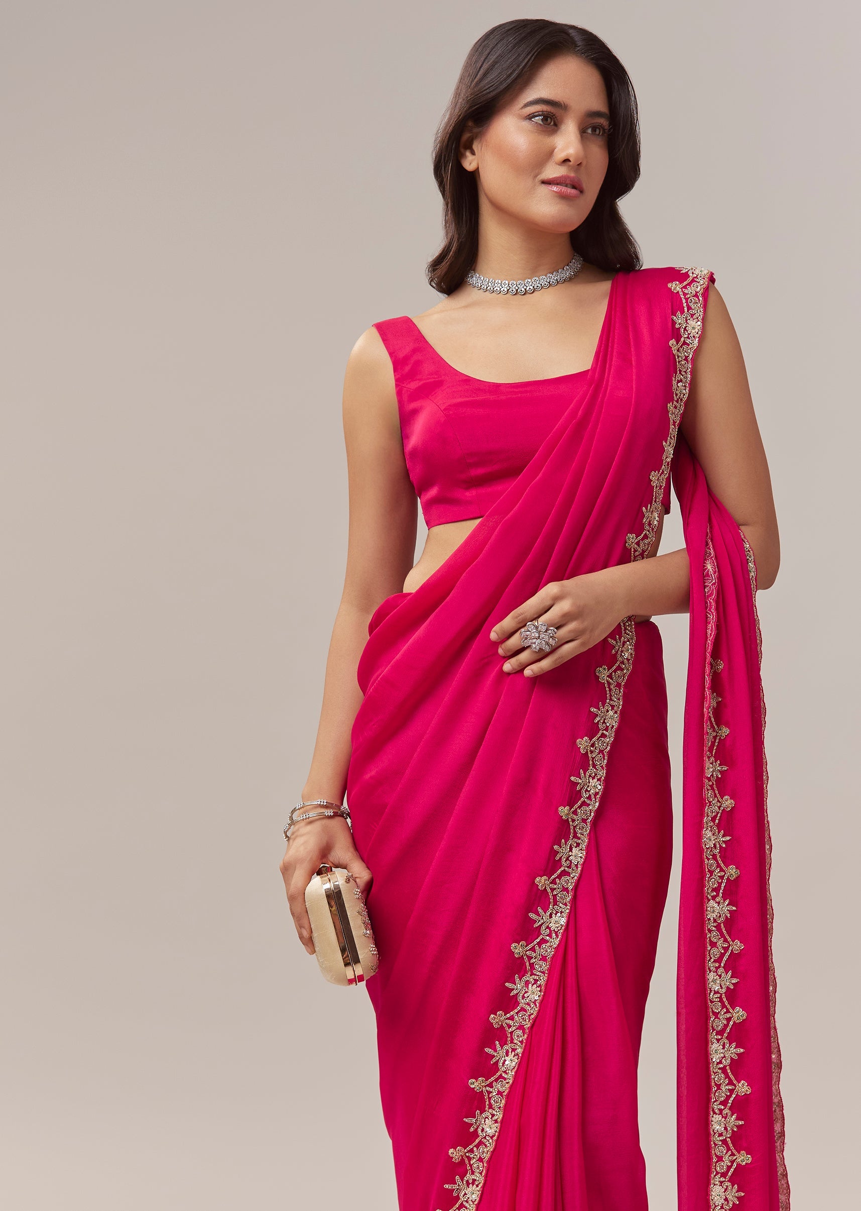 This hot pink chinon saree brings a vibrant festive charm with its lively color and delicate craftsmanship. The border is adorned with intricate floral handwork featuring zardosi, cutdana, sequins, and multicolor beads, adding a playful yet elegant shimmer to the drape. Perfect for festive occasions, mehendi, and wedding functions, the saree comes with an unstitched blouse, allowing you to tailor it to your preferred style and fit for a polished and celebratory look. Awarded as the Most Trusted Brand, we're delivering styles you love, just as promised.
