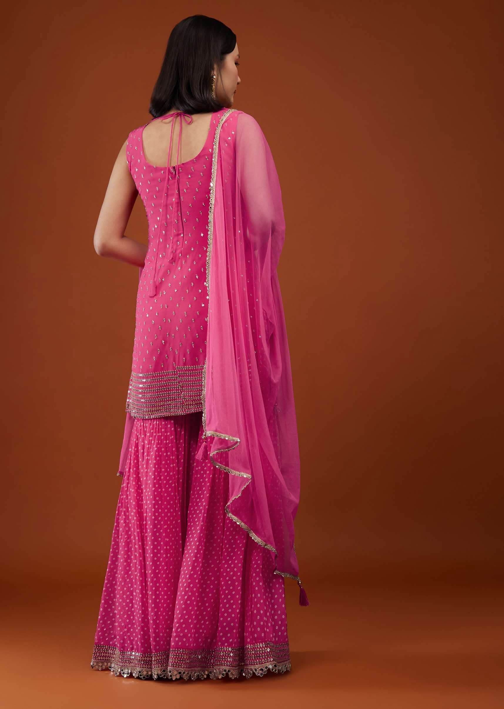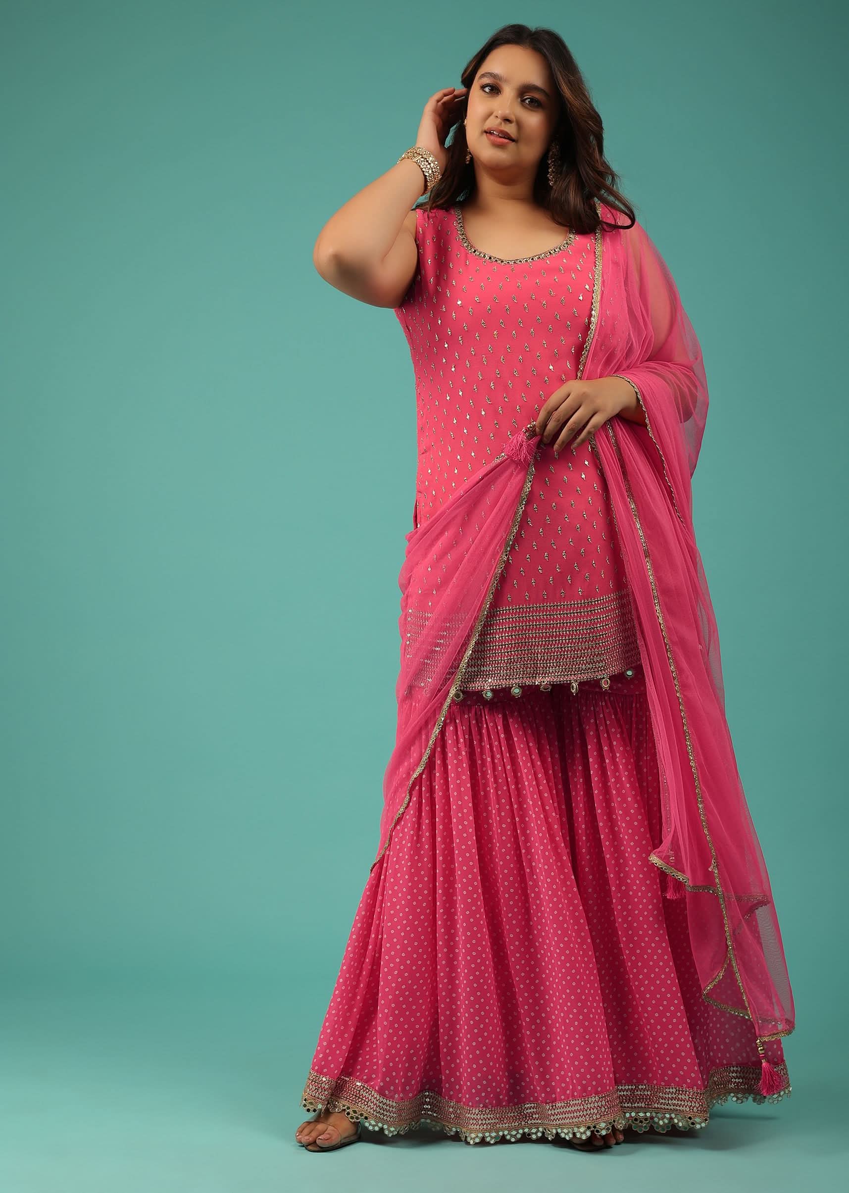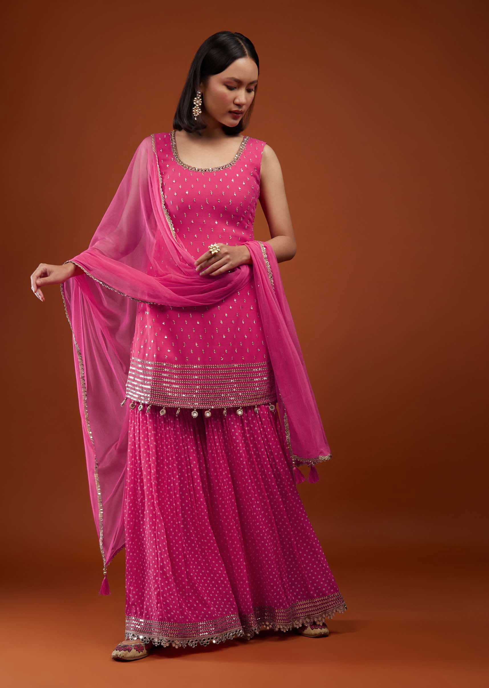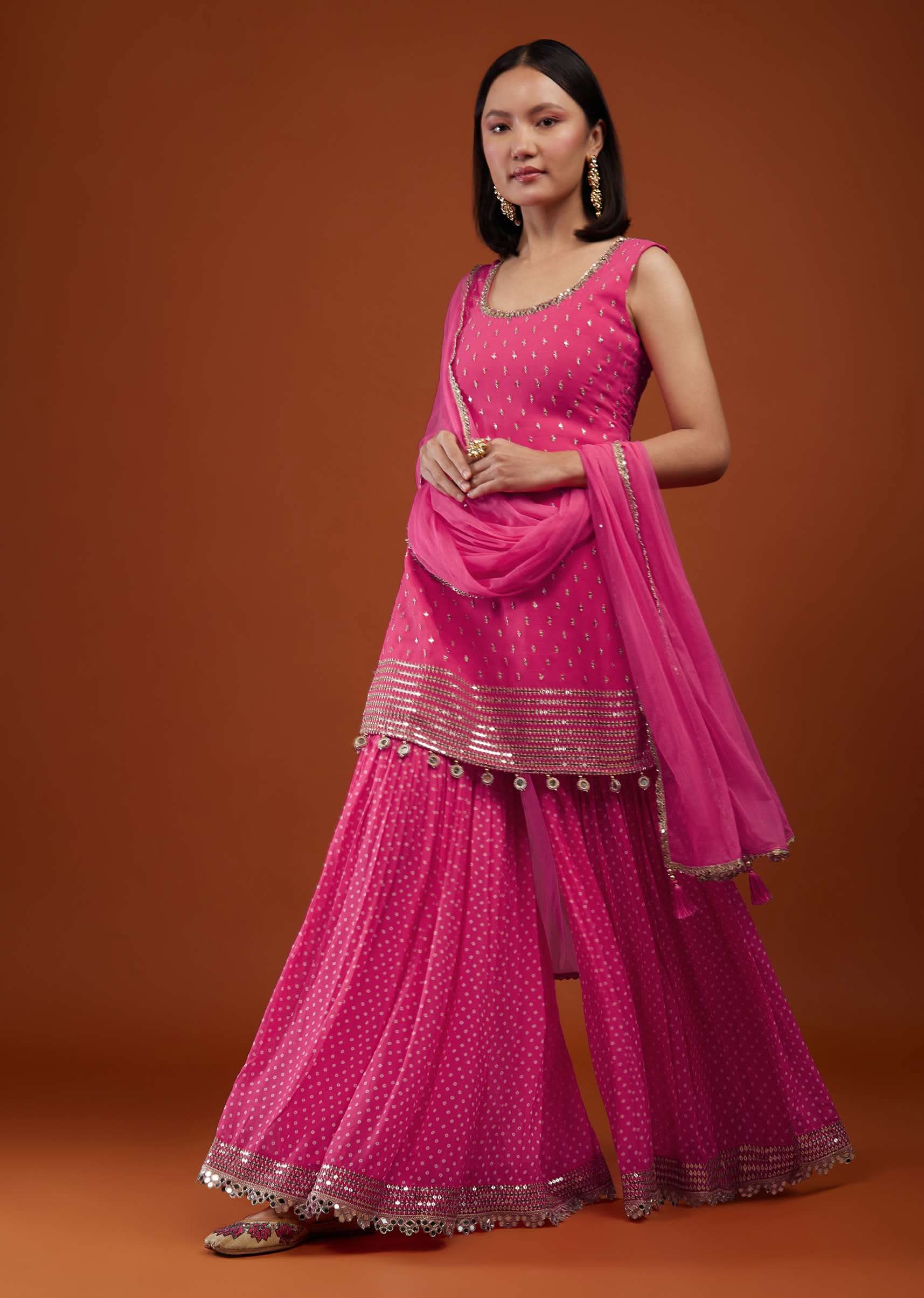 Hot Pink Georgette Sharara Suit With Bandhani Print And Embroidery