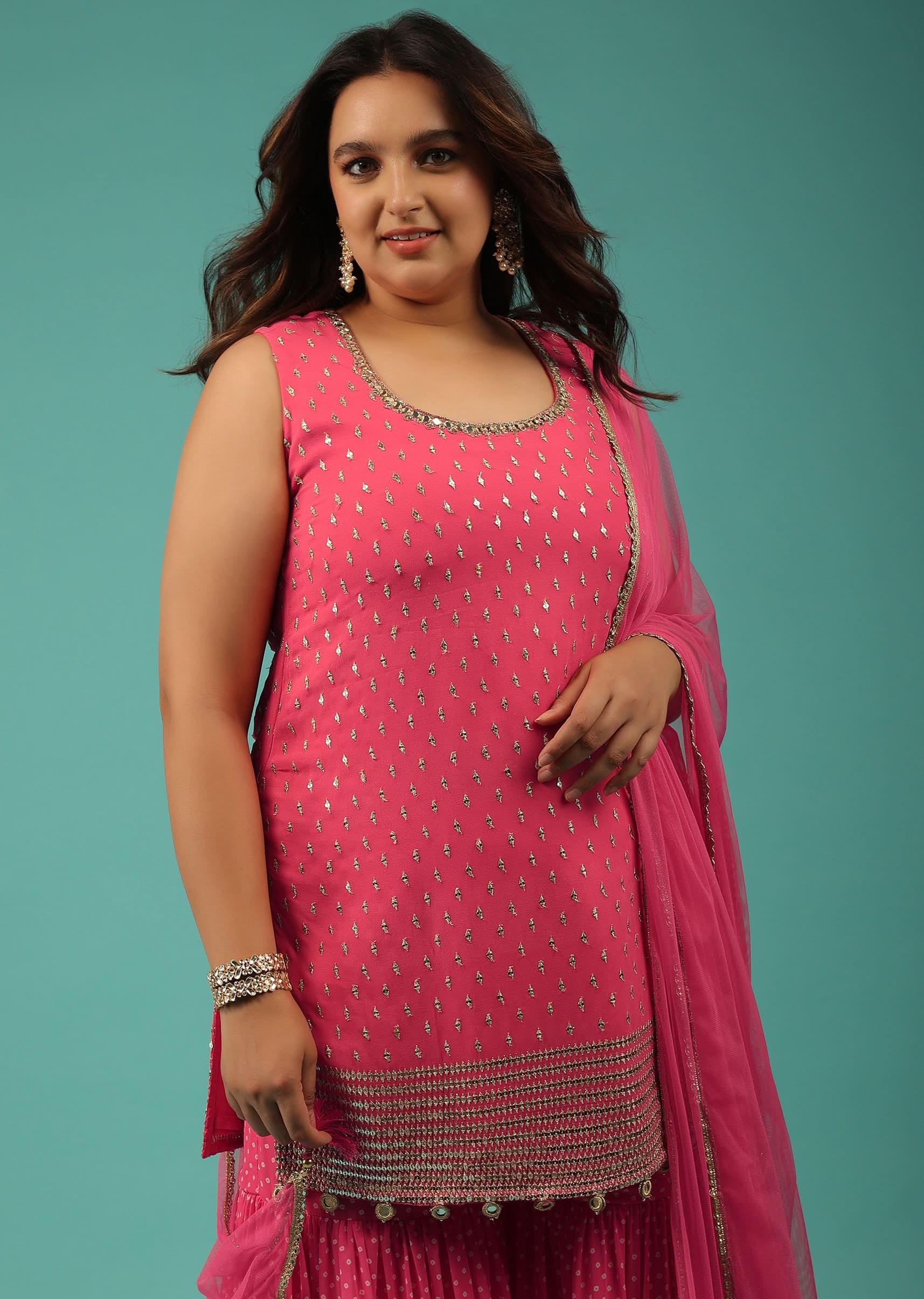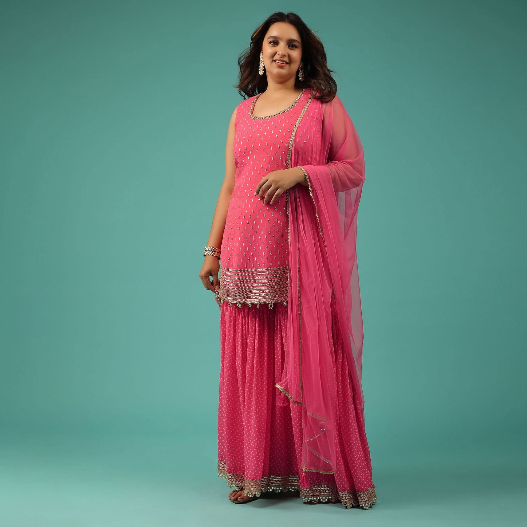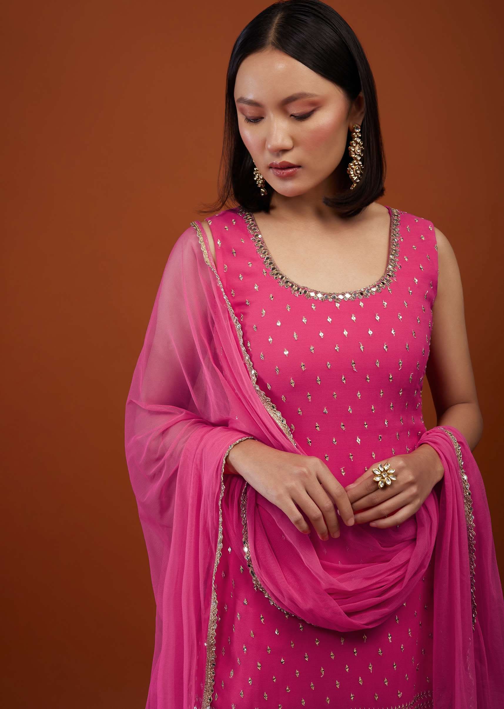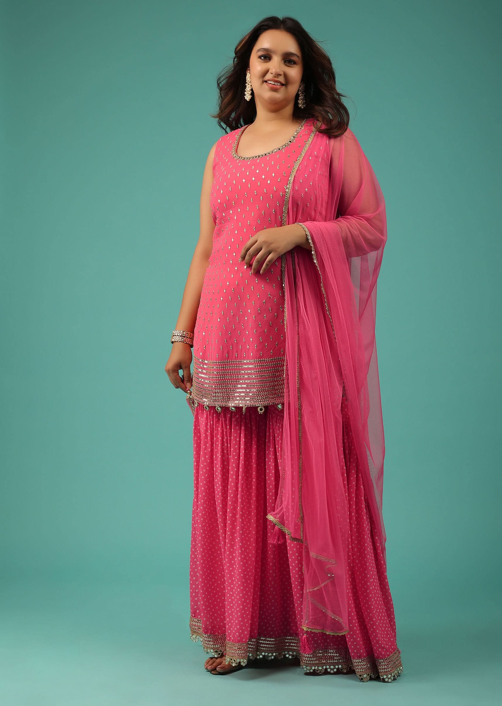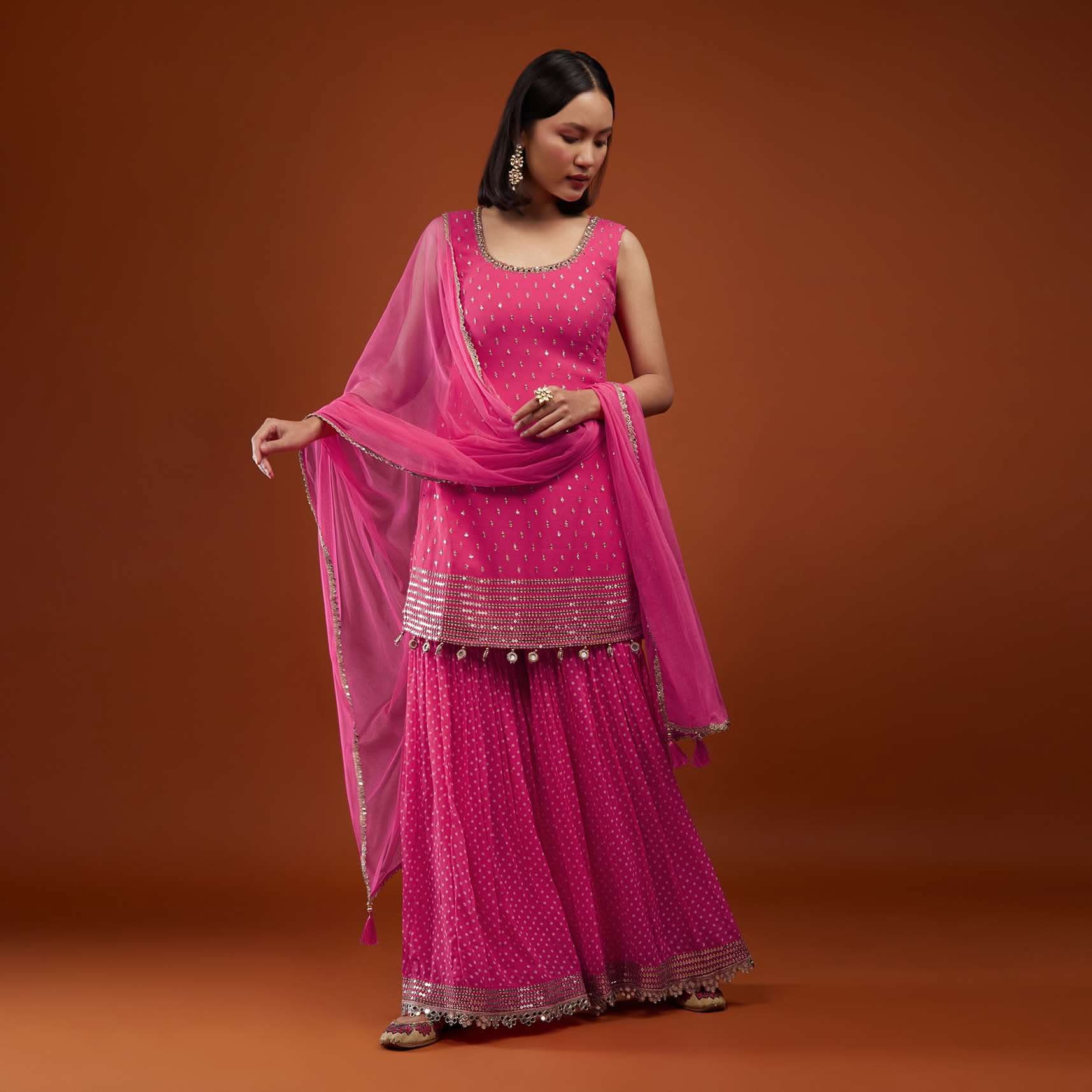 Hot Pink Georgette Sharara Suit With Bandhani Print And Embroidery