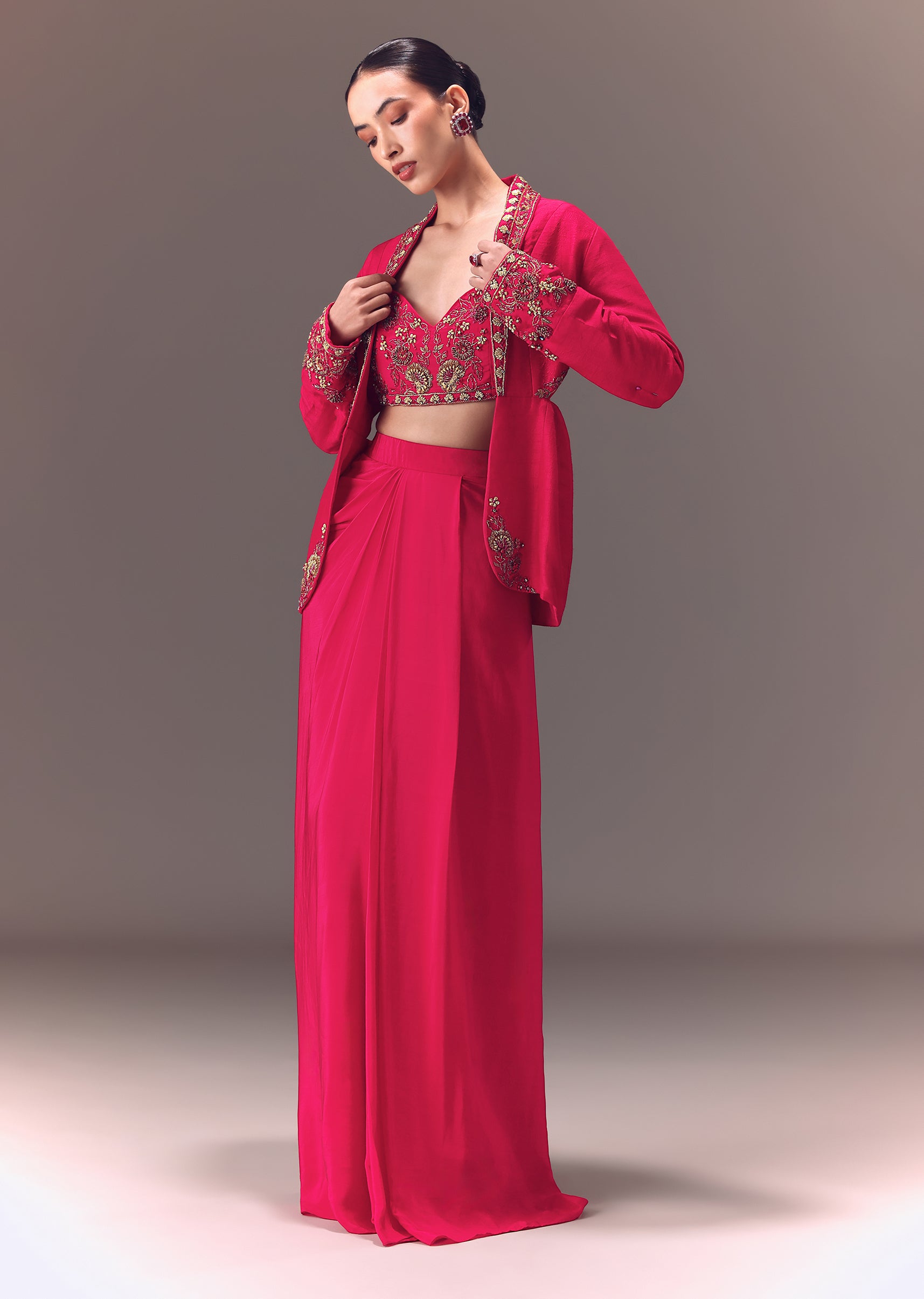 Hot Pink Hand Embellished Blouse With Jacket And Draped Skirt