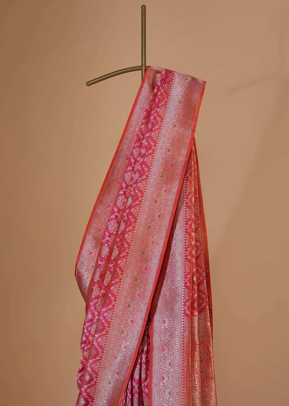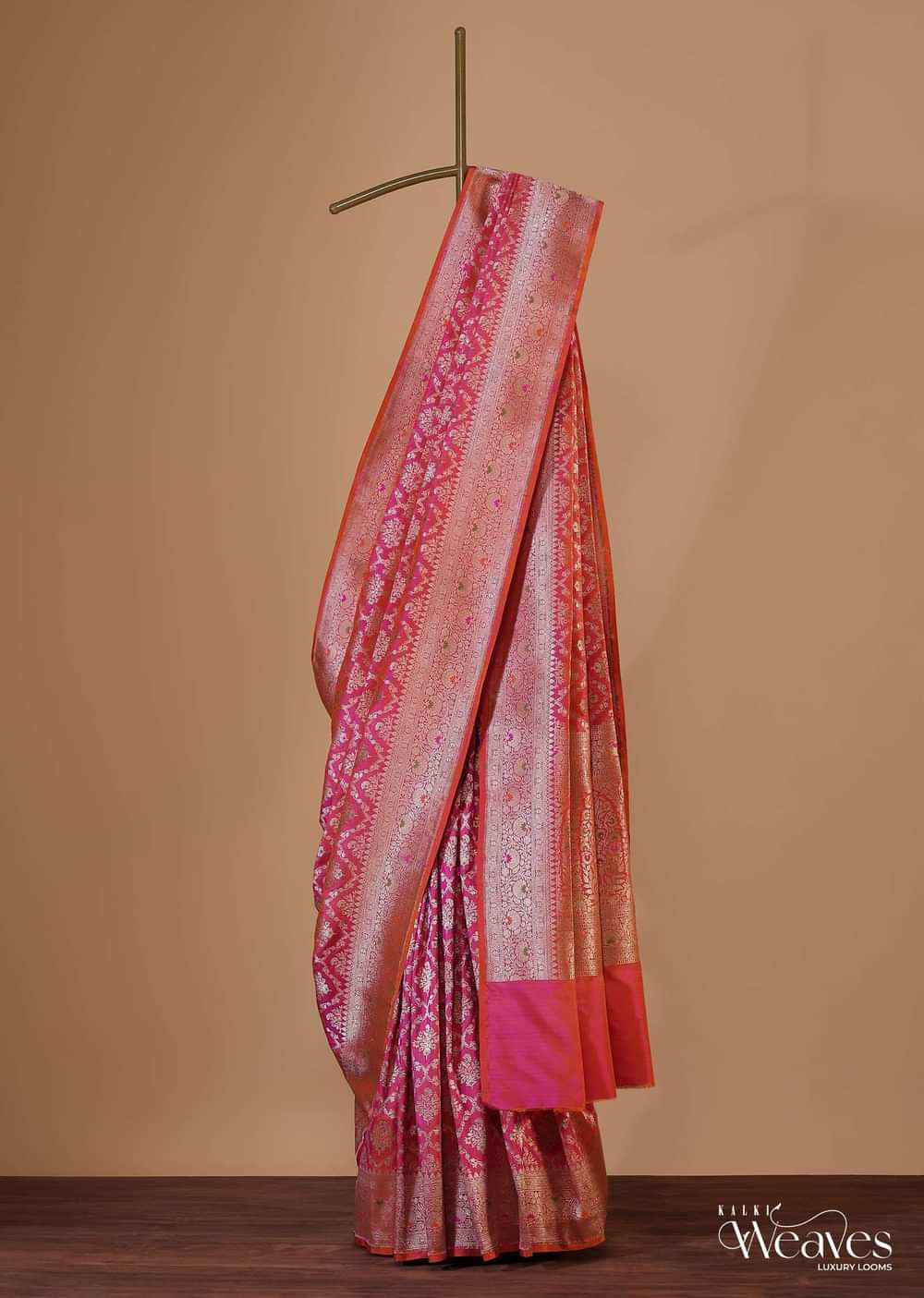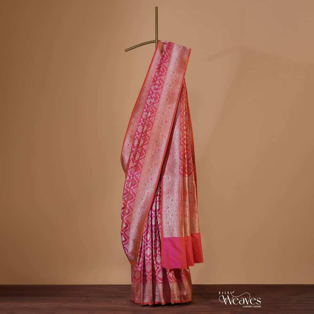 - Our pink saree has a luminous orange colour in banarasi uppada silk with zari work and beautifully intricated meenakari jaal.