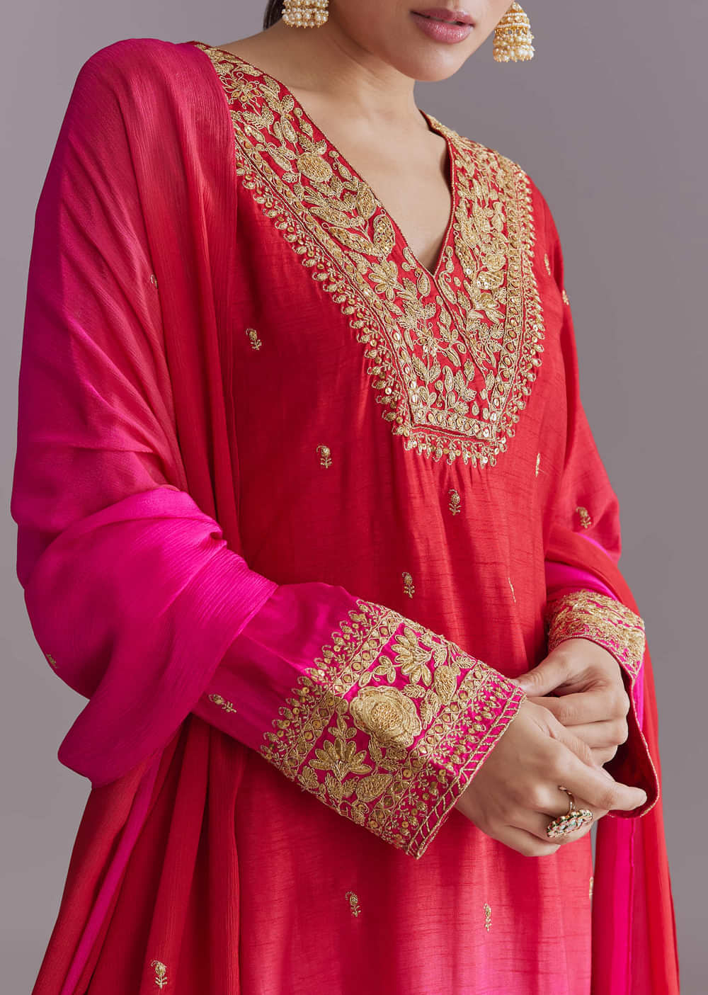 Hot Pink Ombre Silk Kurta Set With Zari Embroidery