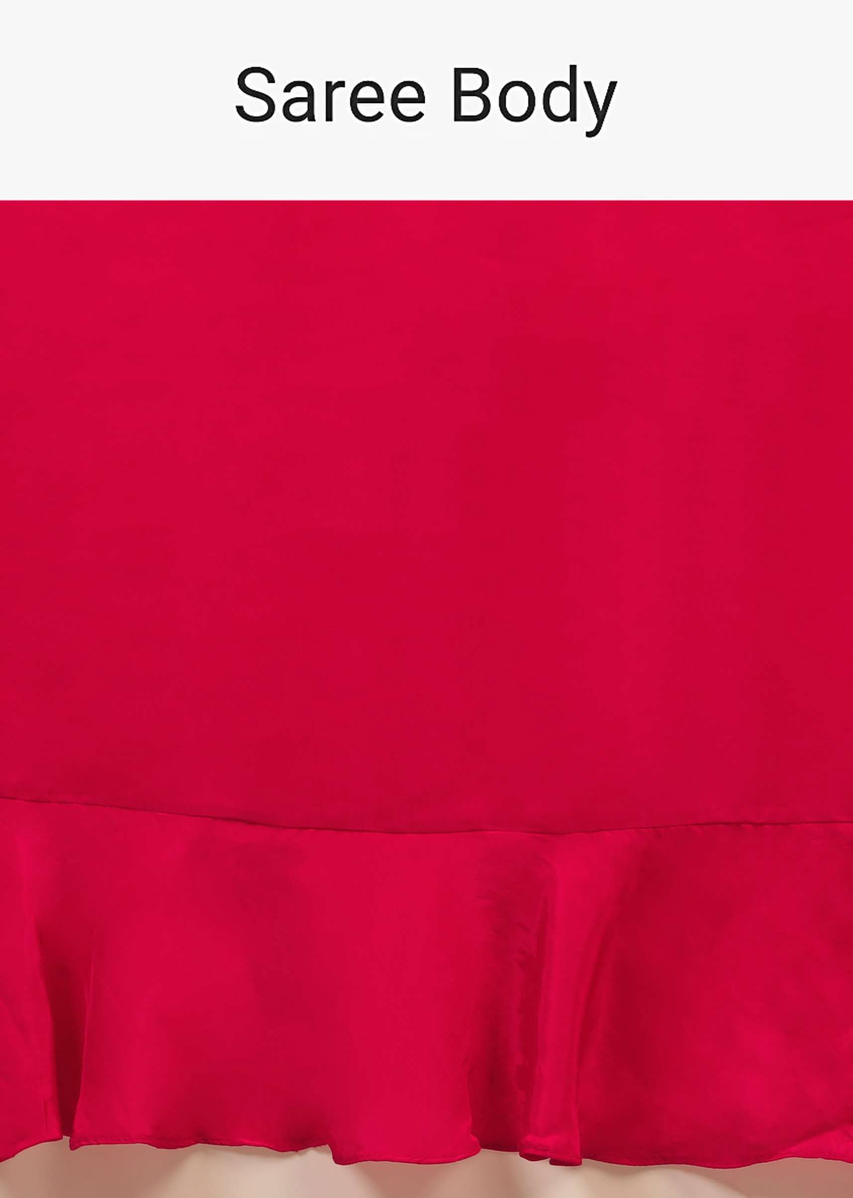 Hot pink saree in crepe with a ruffle frill on the pallu. The highlight of the piece is the heavy embroidered belt with wine stones, cut dana and moti work along with tassel detailing. It is paired with a crepe blouse with a ruffle frill on the neckline and a side cut out with tie up straps. Crafted with a V neckline, churidar sleeves and tassel dori tie up at the back. This piece comes with padding. Awarded as the Most Trusted Brand, we're delivering styles you love, just as promised.