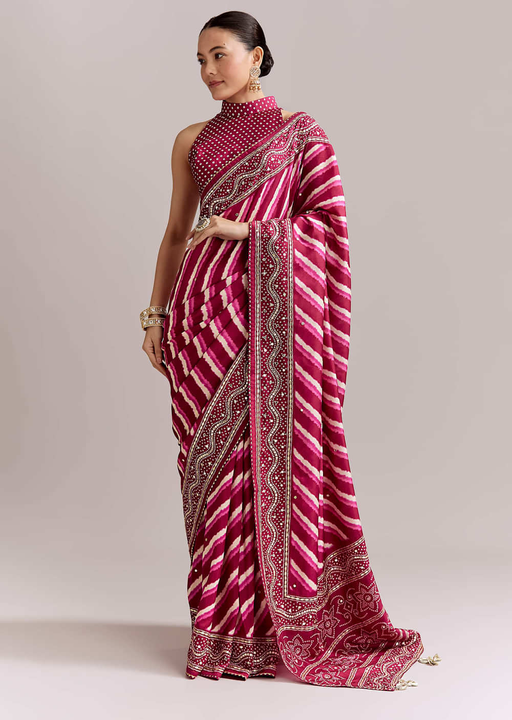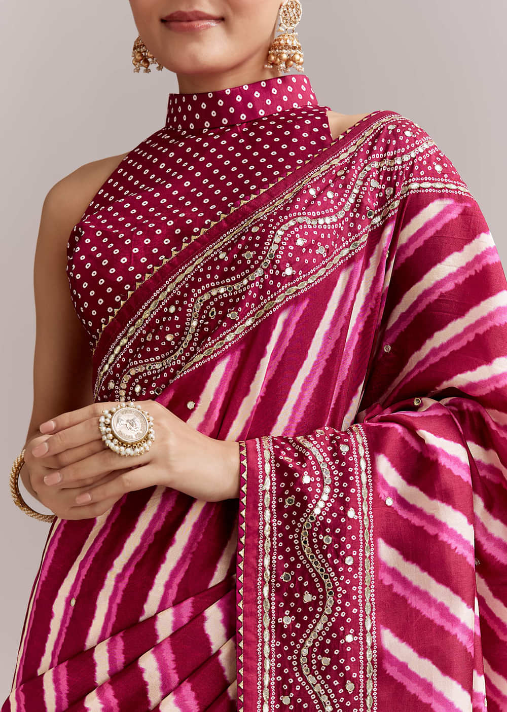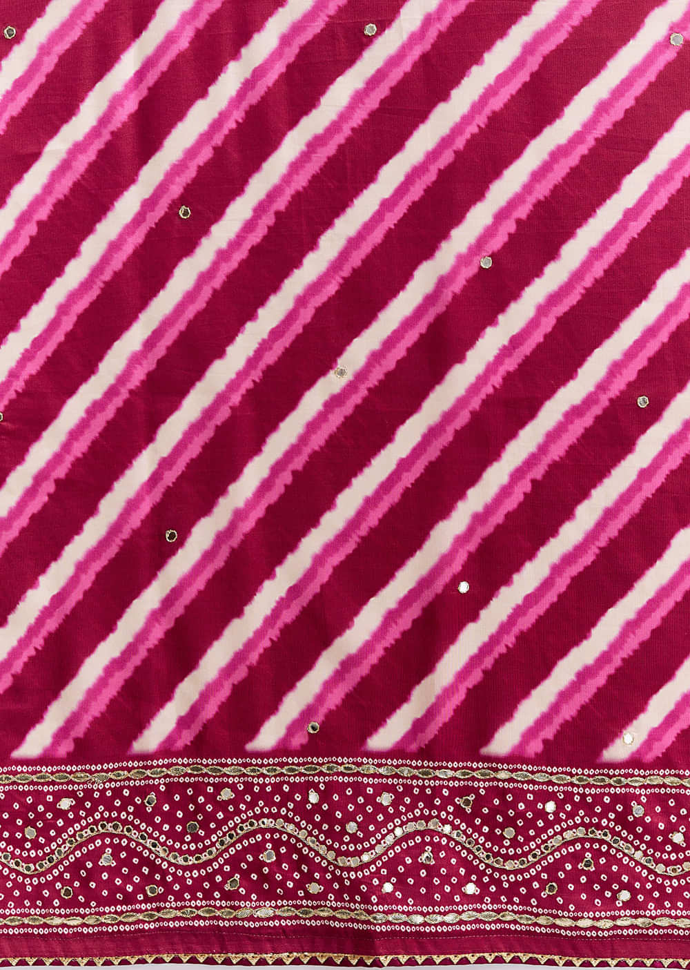 Hot Pink Silk Printed Saree With Lehariya And Bandhani Gota Border