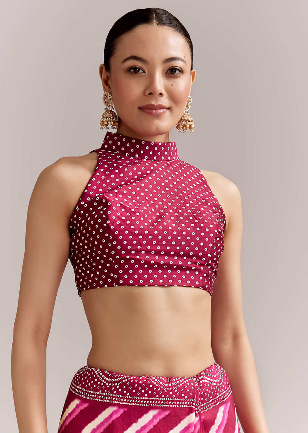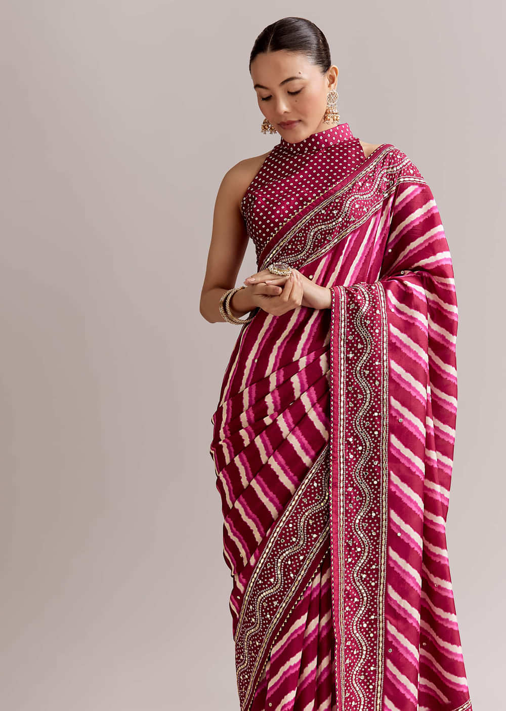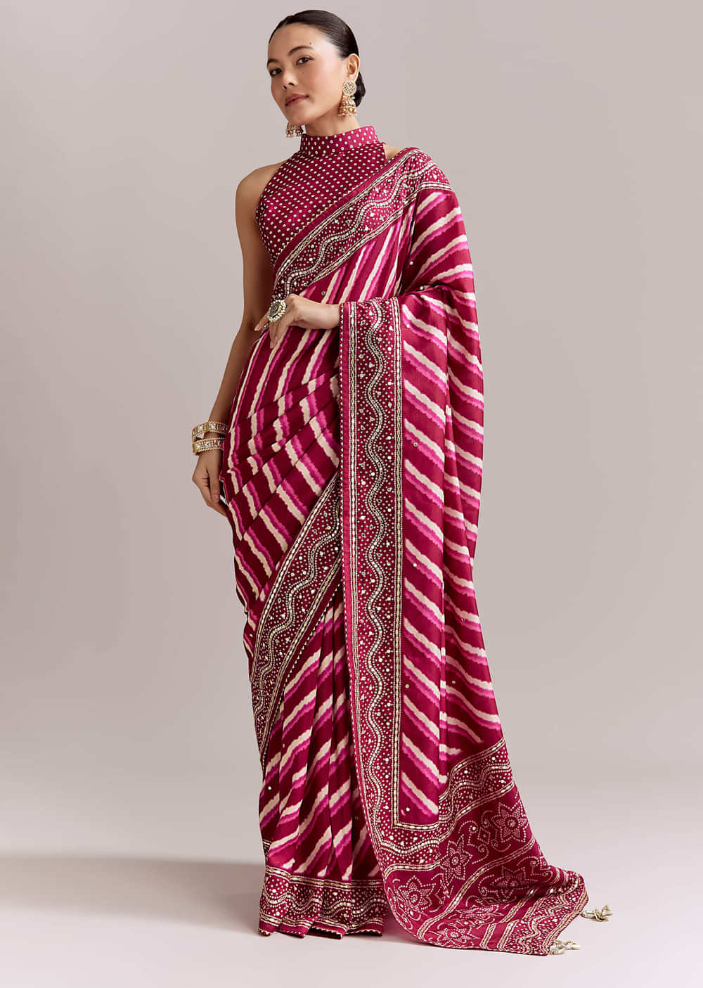 Hot Pink Silk Printed Saree With Lehariya And Bandhani Gota Border