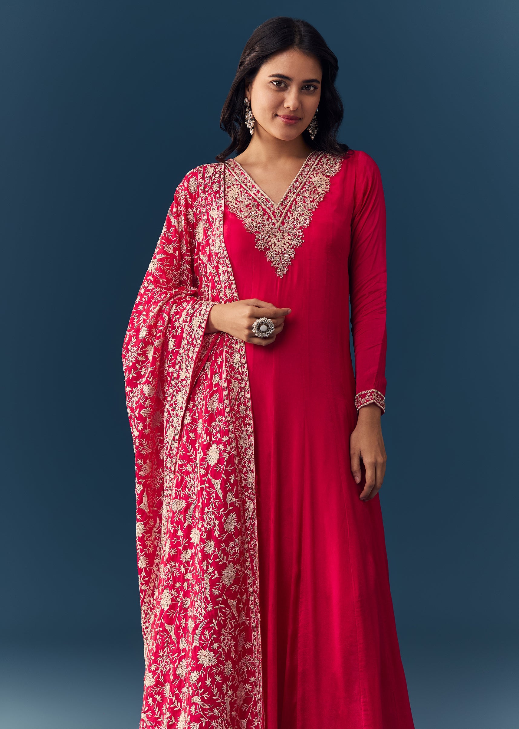 Hot Pink Thread Embroidered Anarkali with Dupatta