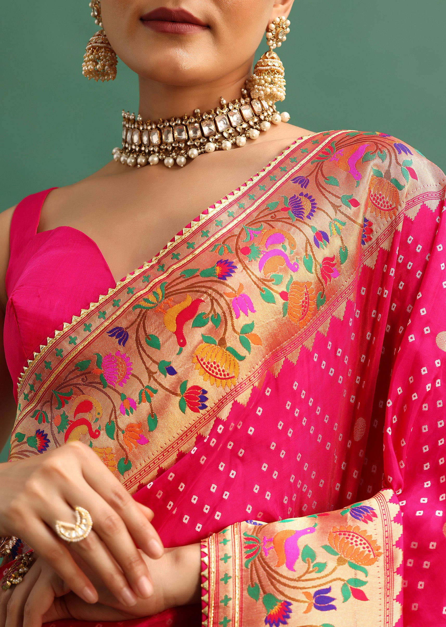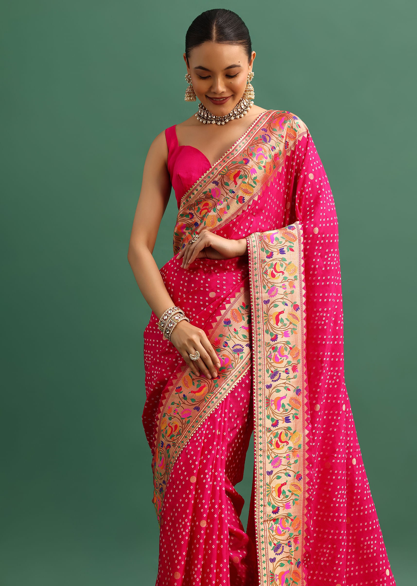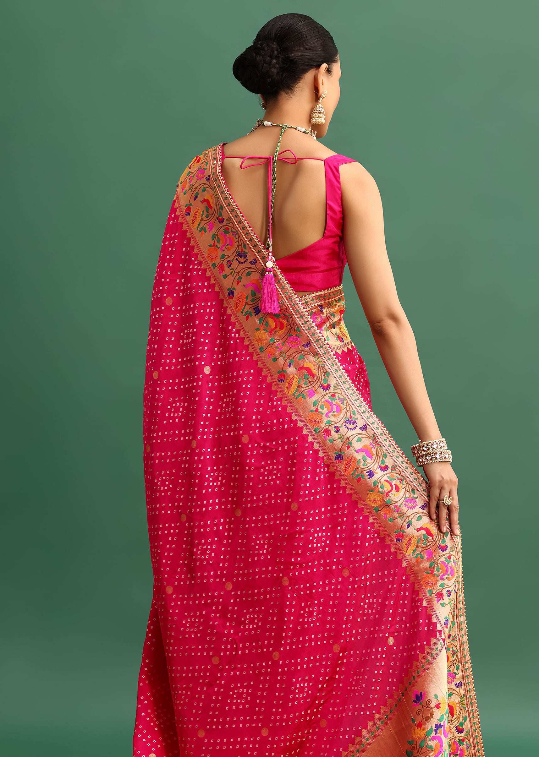 Hot Pink Woven Bandhani Silk Saree With Paithani Border Pallu And Unstitched Blouse
