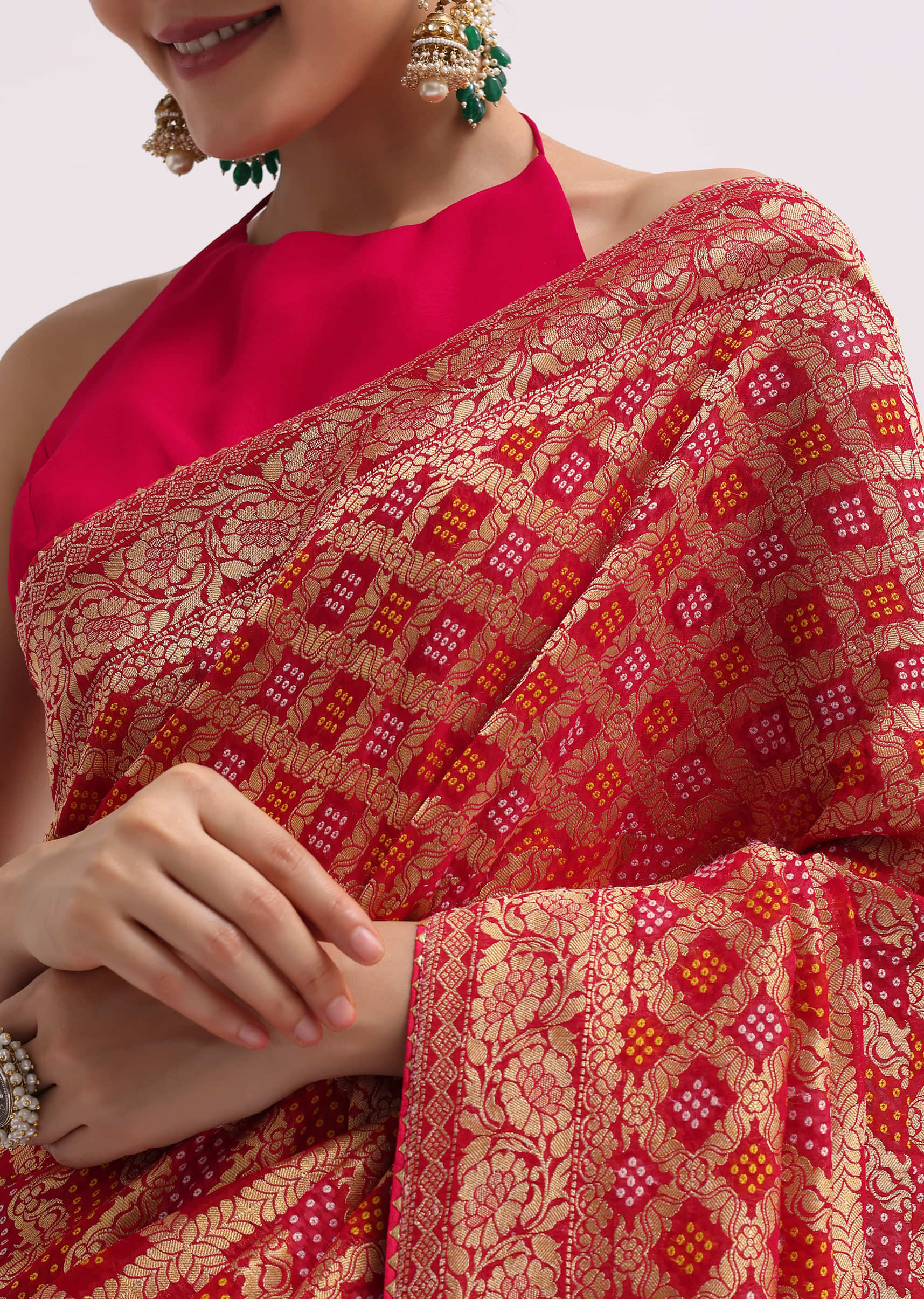 -  Designed on a base of khadi georgette, it showcases an intricate gharchola and jaal pattern bandhani throughout.