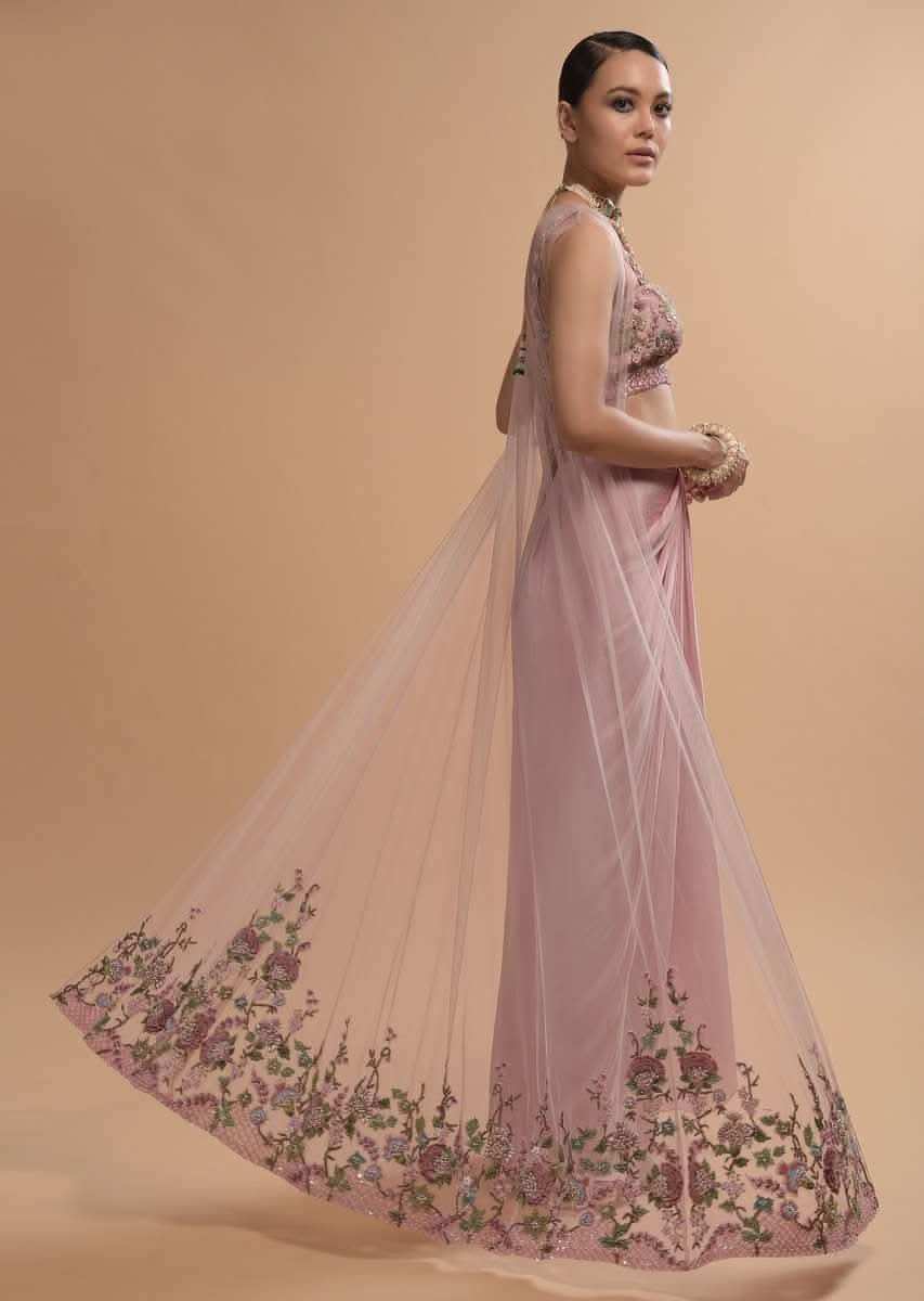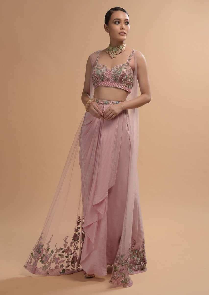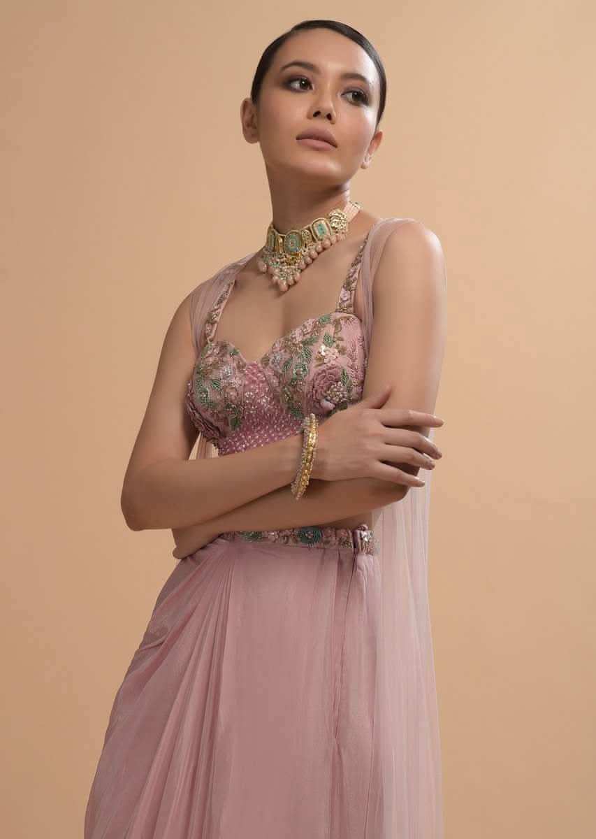Icy Pink Draped Skirt And Crop Top Set With Long Jacket And 3D Flower Embroidery