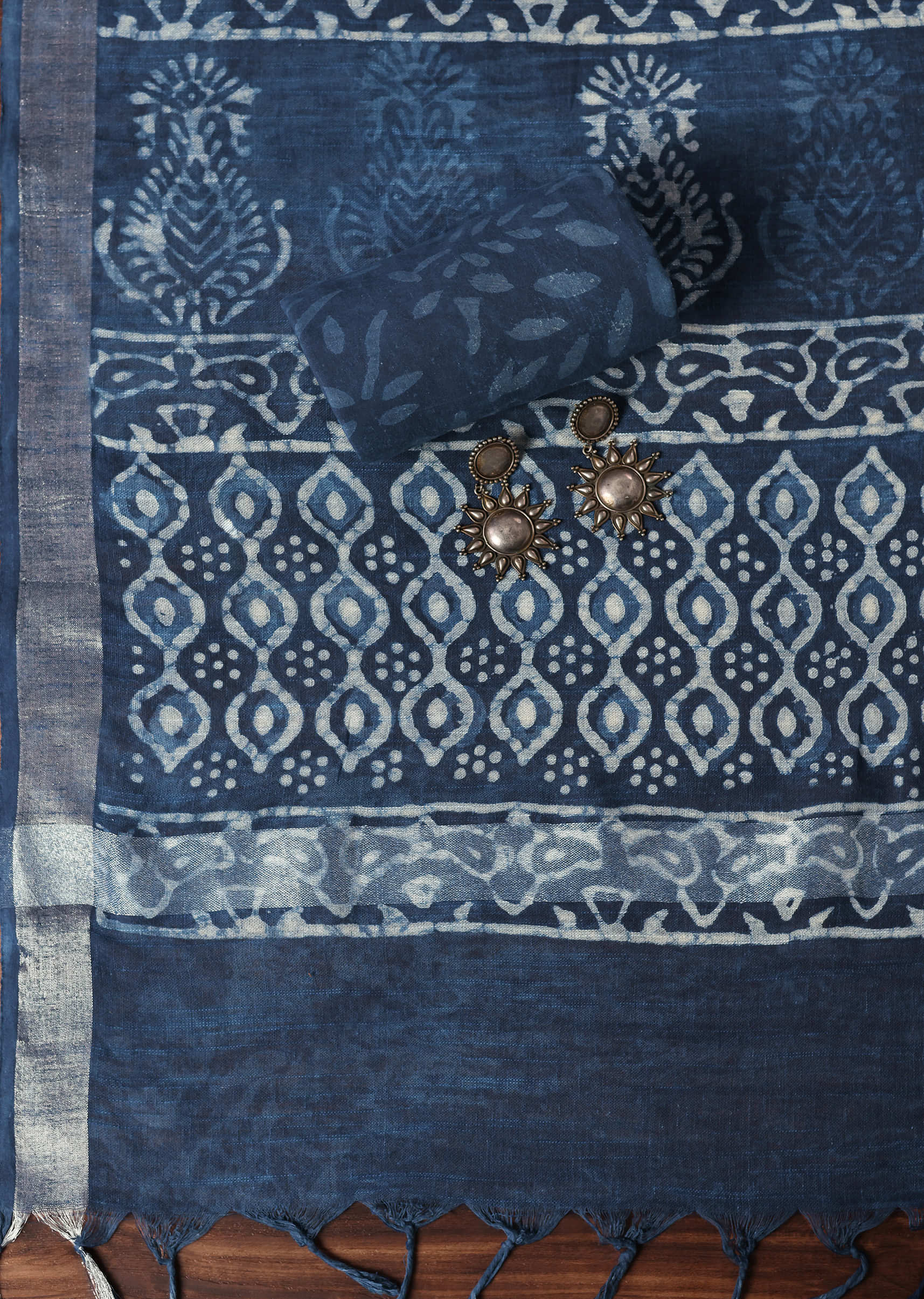 - This dreamy indigo batik dress material, hand kissed with the magic of block printing, whispers tales of festive revelry.